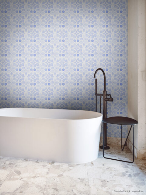 Its balanced blue and taupe palette adds a gentle rhythm to bathroom walls, making even small spaces feel brighter and more peaceful.
