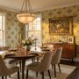 For a full glamour effect, pair this wallpaper with a brass chandelier, dark walnut or espresso wood furniture, and cream or gold linen table settings. In a powder room, combine with a gold-framed mirror, brass sconces, and marble accents. In a dining room, let it anchor the space behind a credenza styled with brass candlesticks, ceramic vessels, and taper candles for effortless evening elegance.