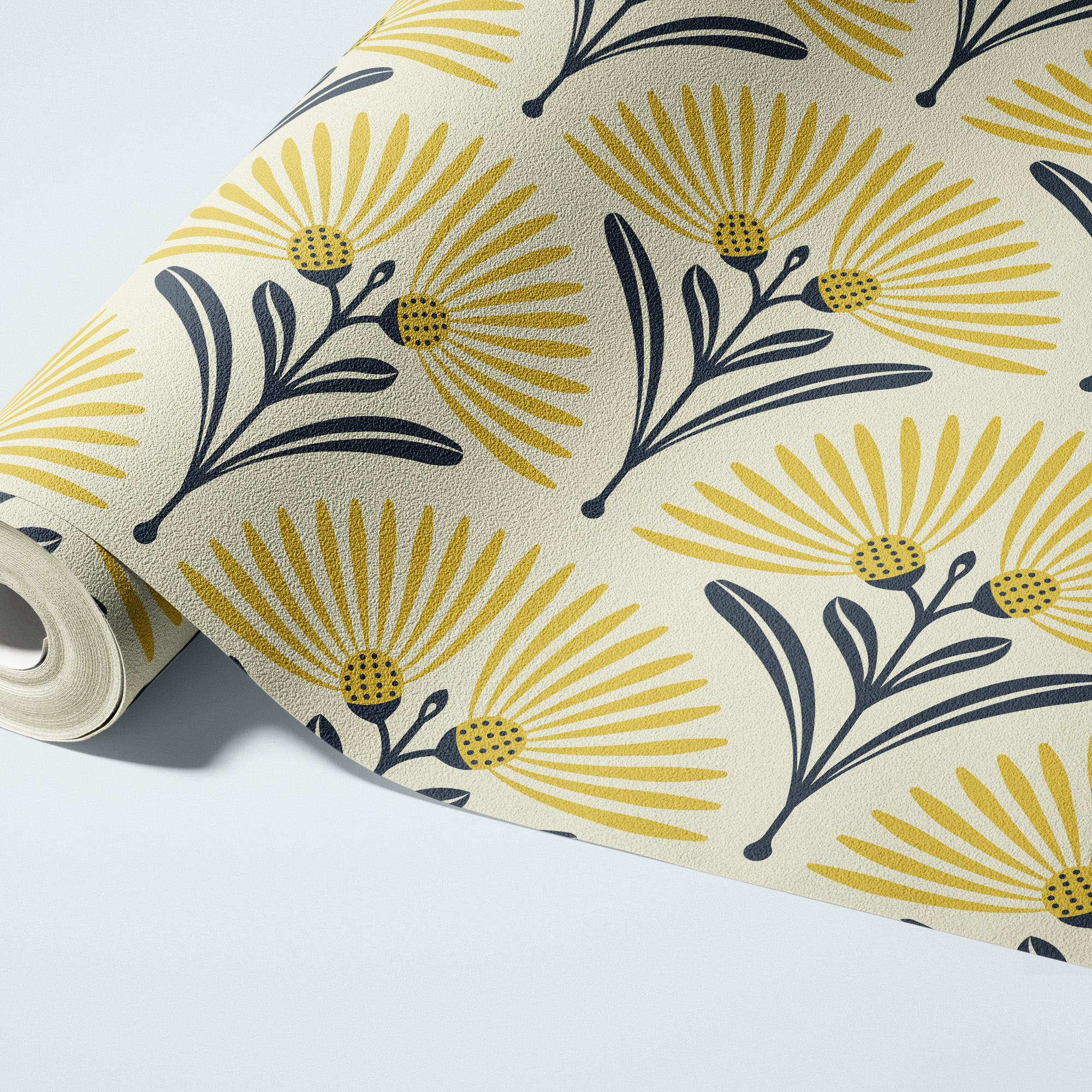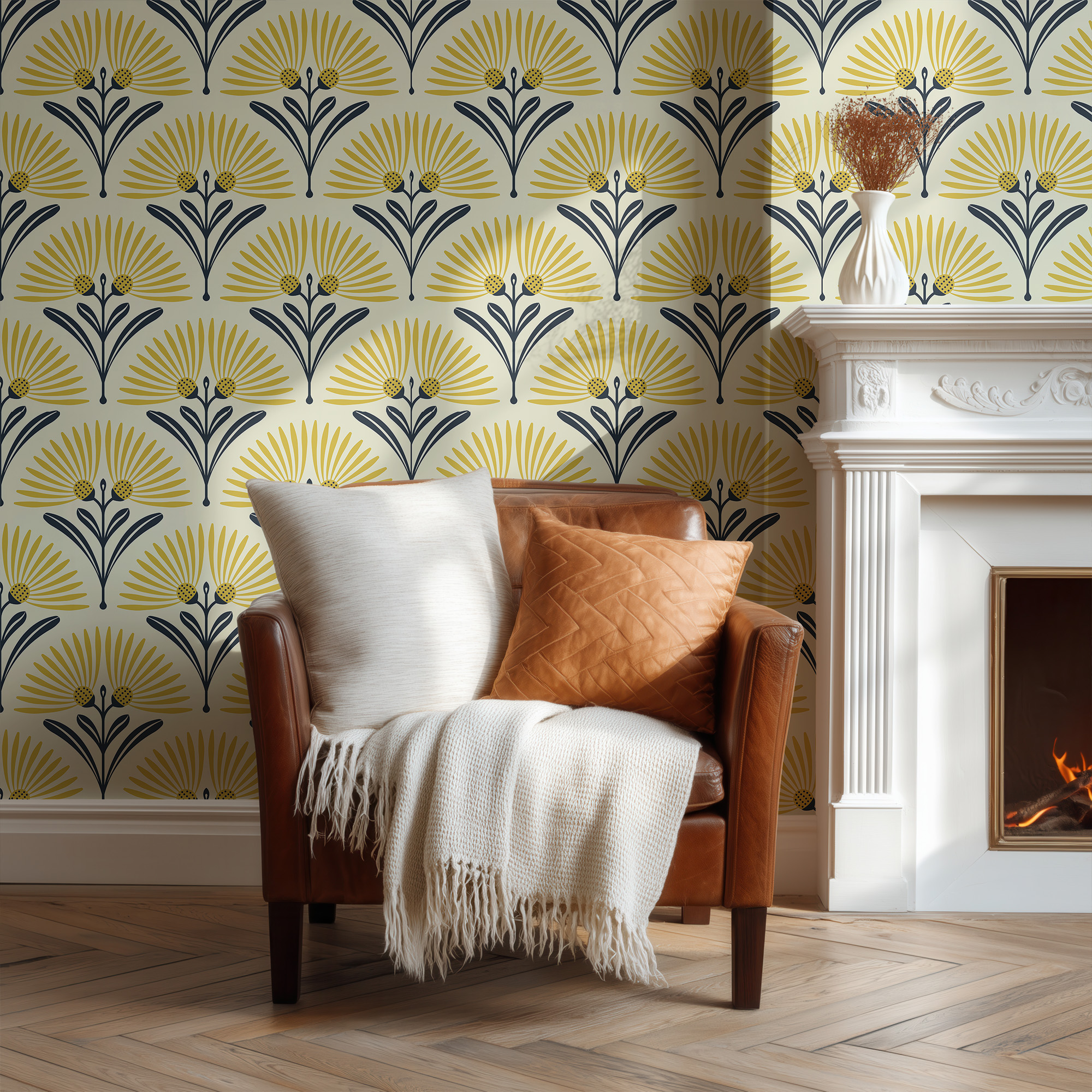 Bring timeless glamour into your home with our Art Deco gold wallpaper. Featuring bold golden chrysanthemum fan motifs with striking black linework on a warm cream background, this design captures the elegant confidence of the Art Deco era reimagined for contemporary interiors. It is the perfect statement piece for creating a refined, glamorous atmosphere in dining rooms, entryways, powder rooms, or living room accent walls. The warm gold and black palette pairs beautifully with brass fixtures, dark wood furniture, marble surfaces, and velvet upholstery, delivering showstopping visual impact with effortless sophistication.