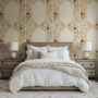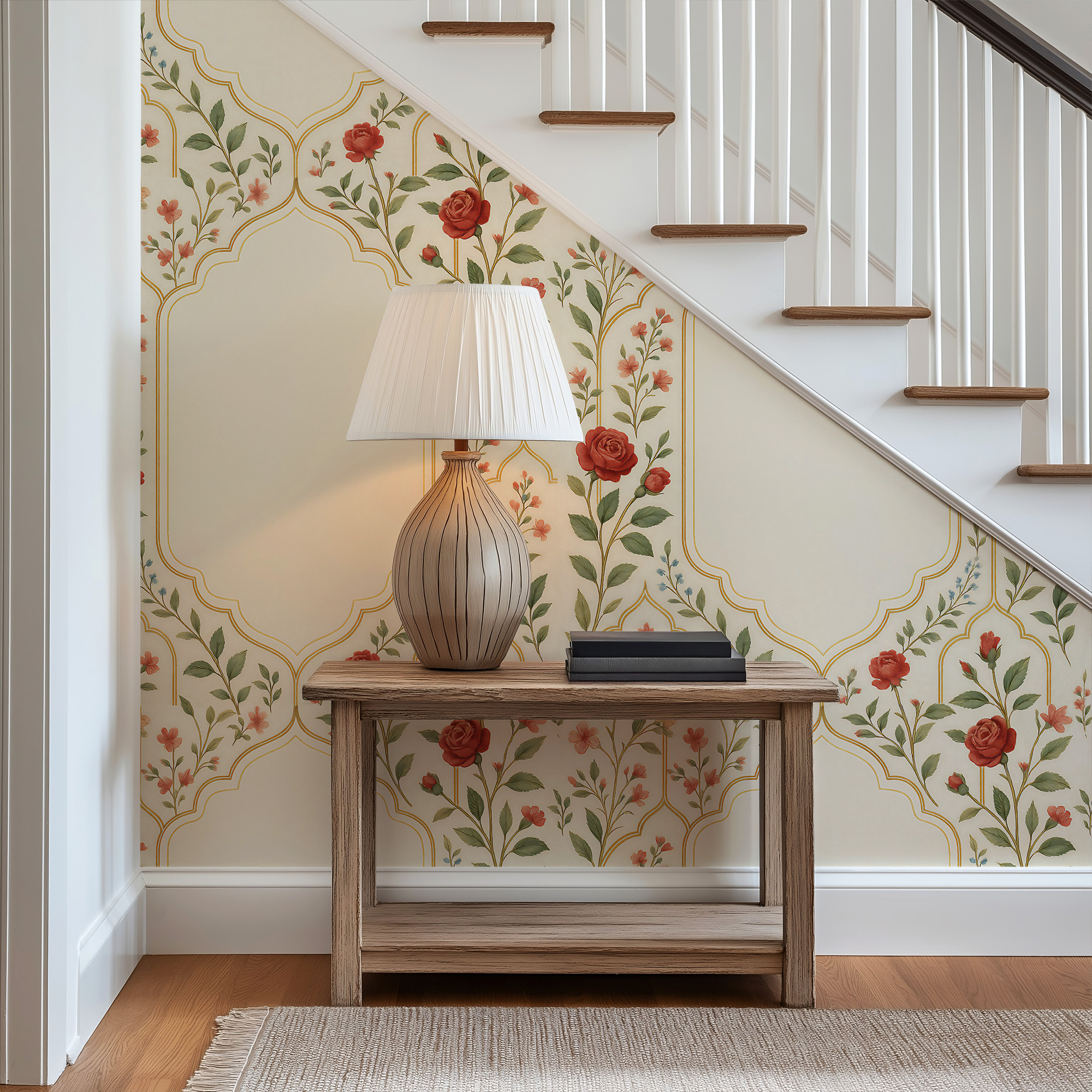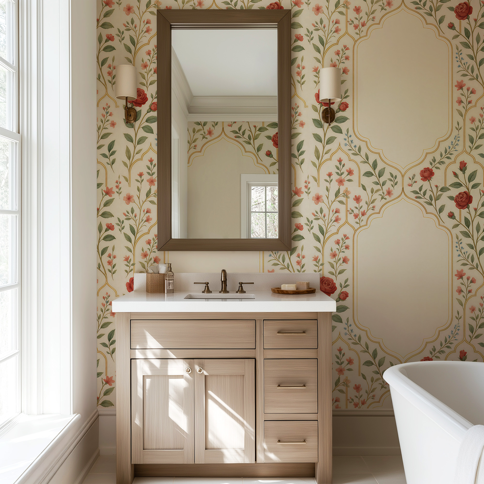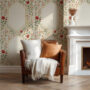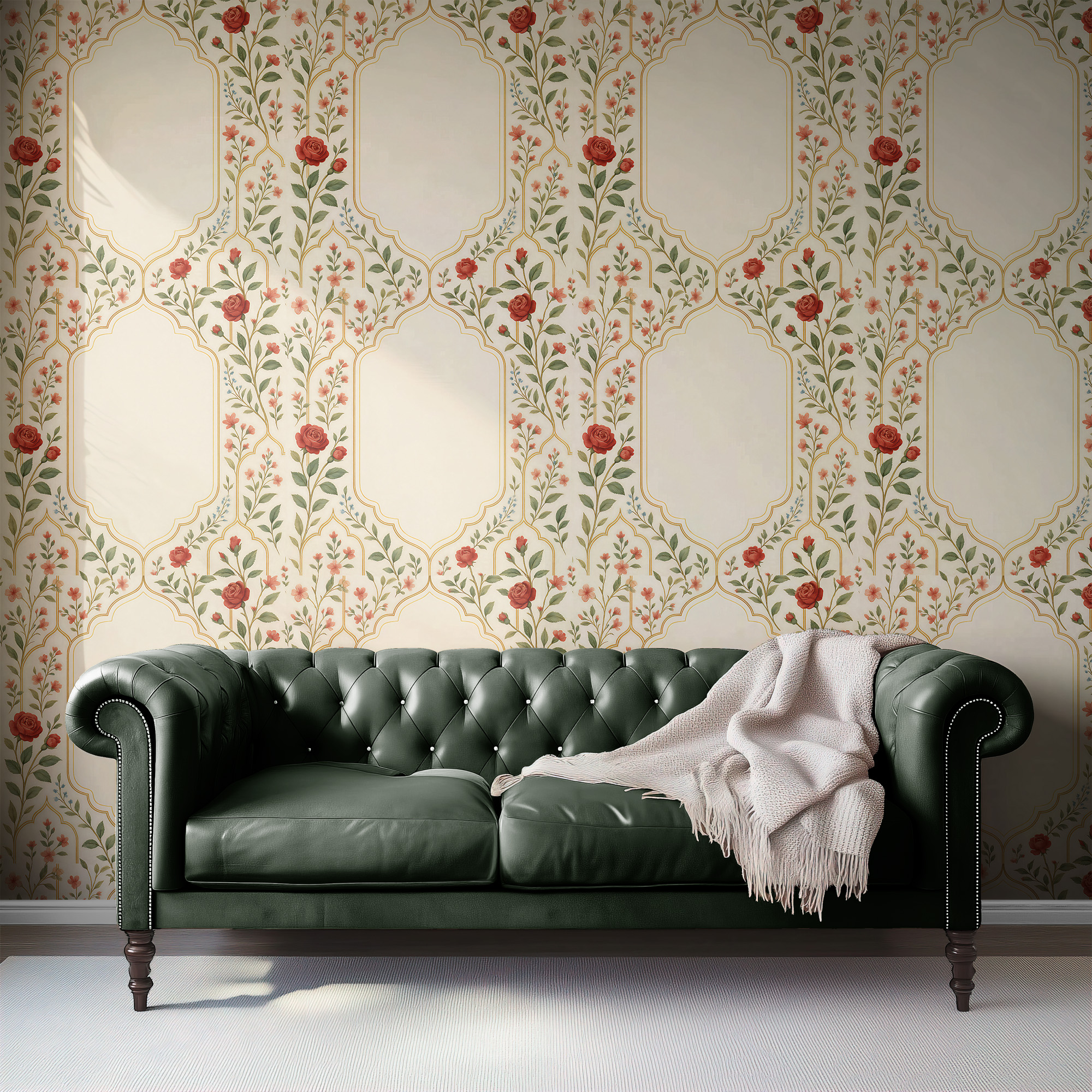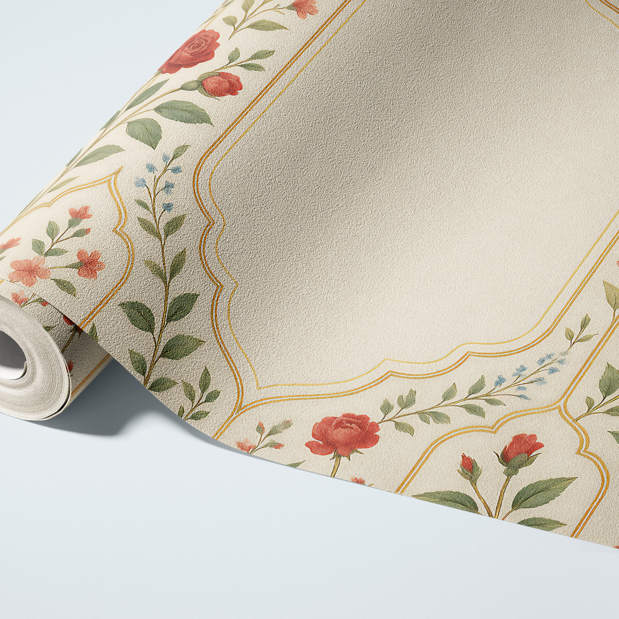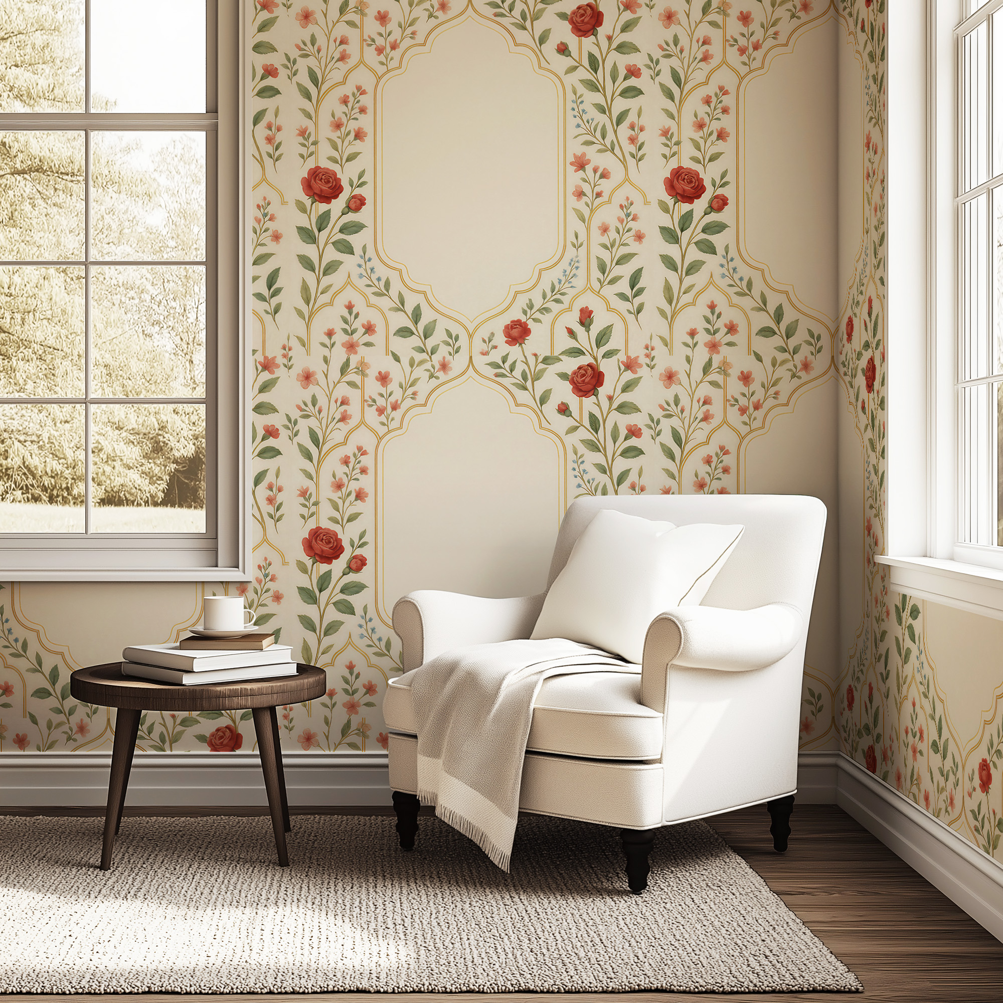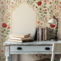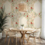Make a statement with our Vintage Rose Arch Wallpaper, featuring delicate climbing red florals and elegant golden architectural lines on a warm ivory background.