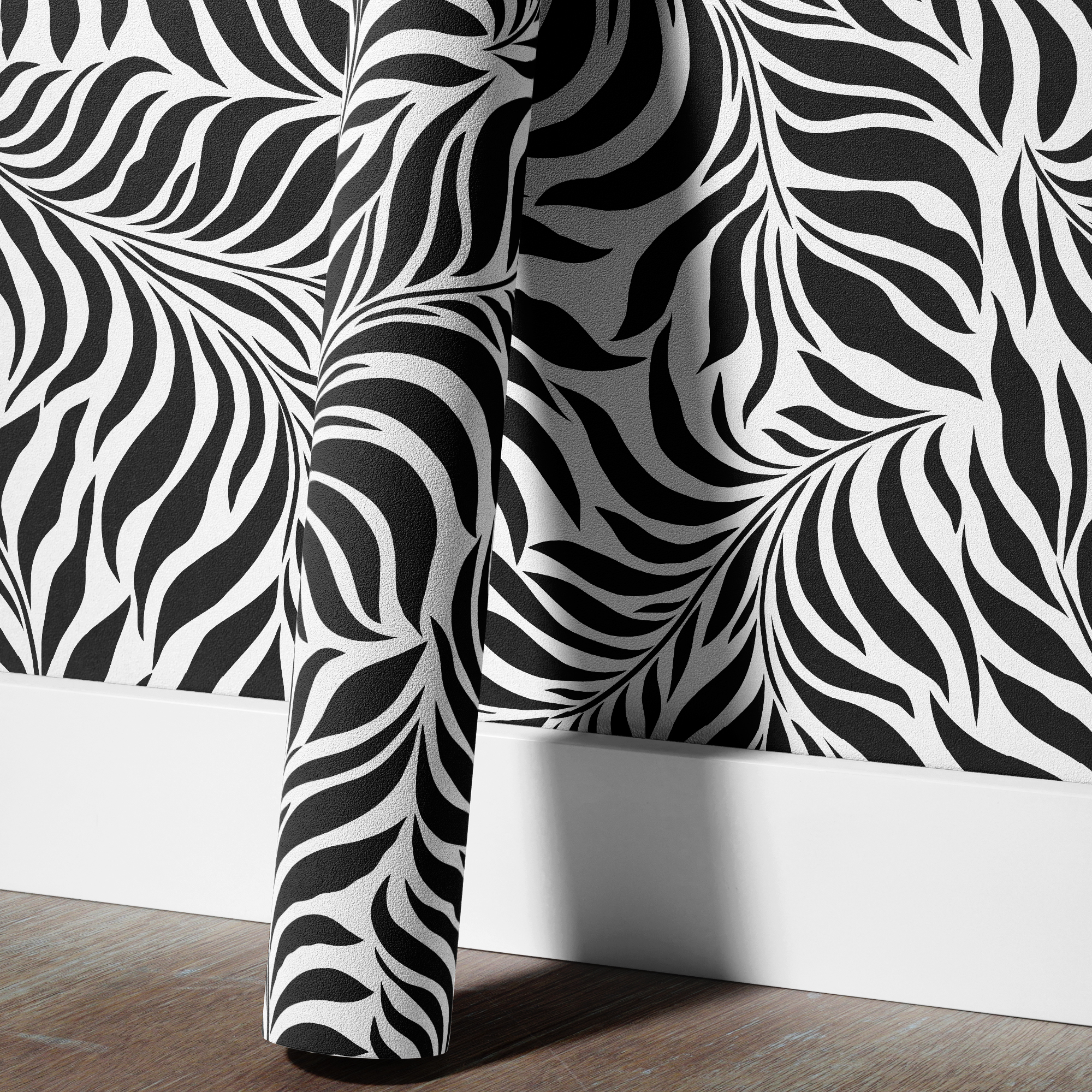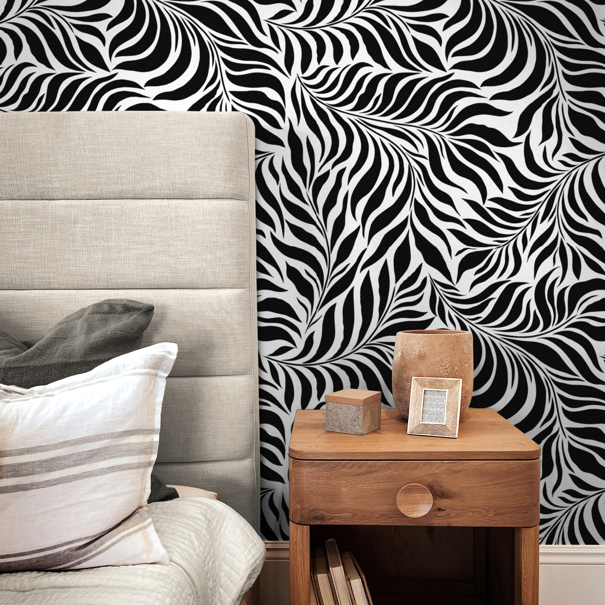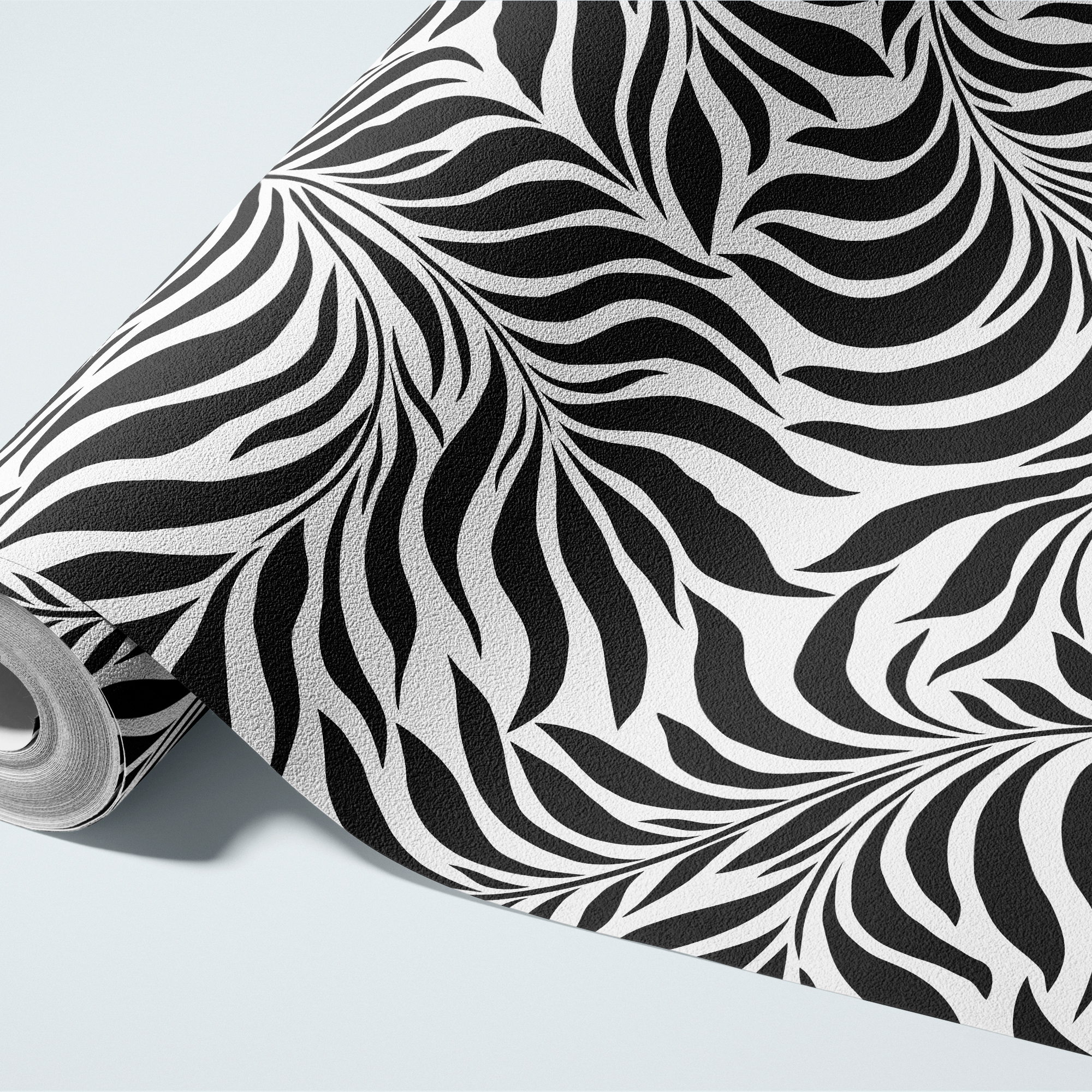 Make a bold statement with our Black and White Tropical Leaf Wallpaper, featuring stylized flowing leaves in a striking monochrome palette.