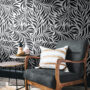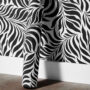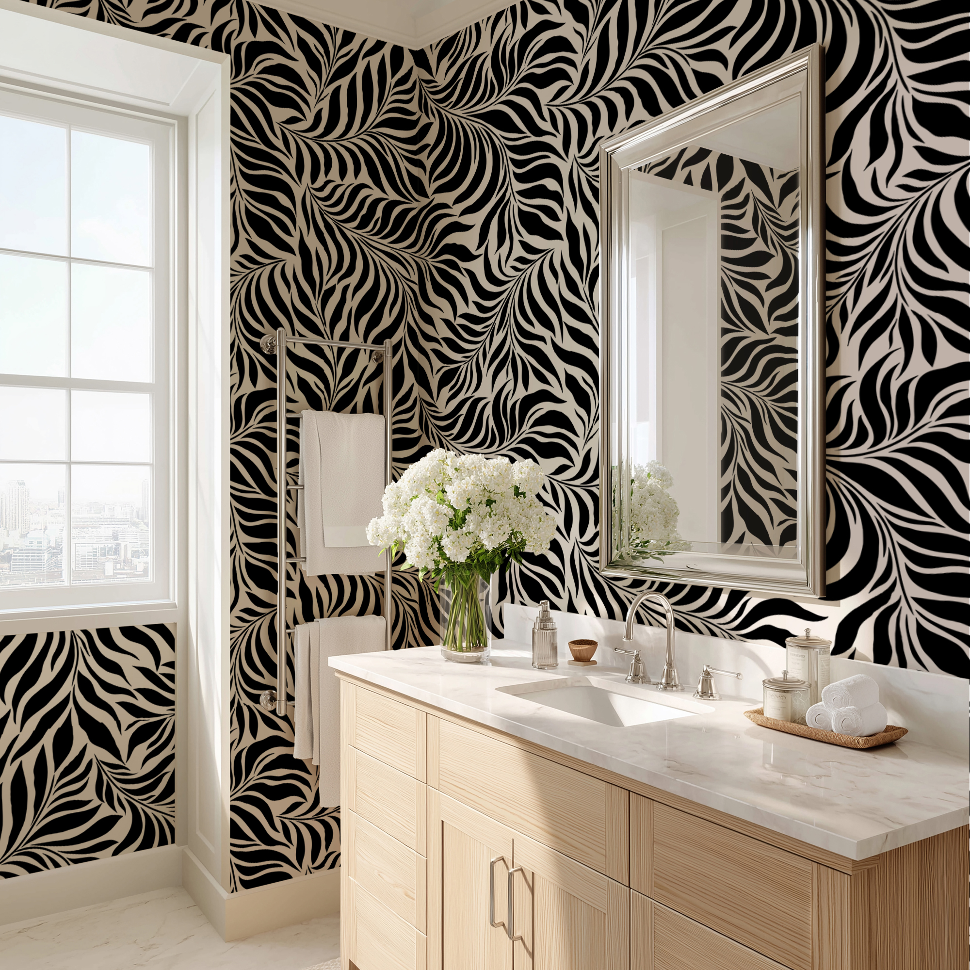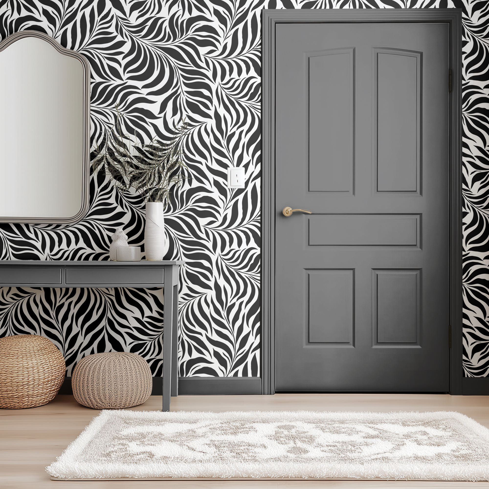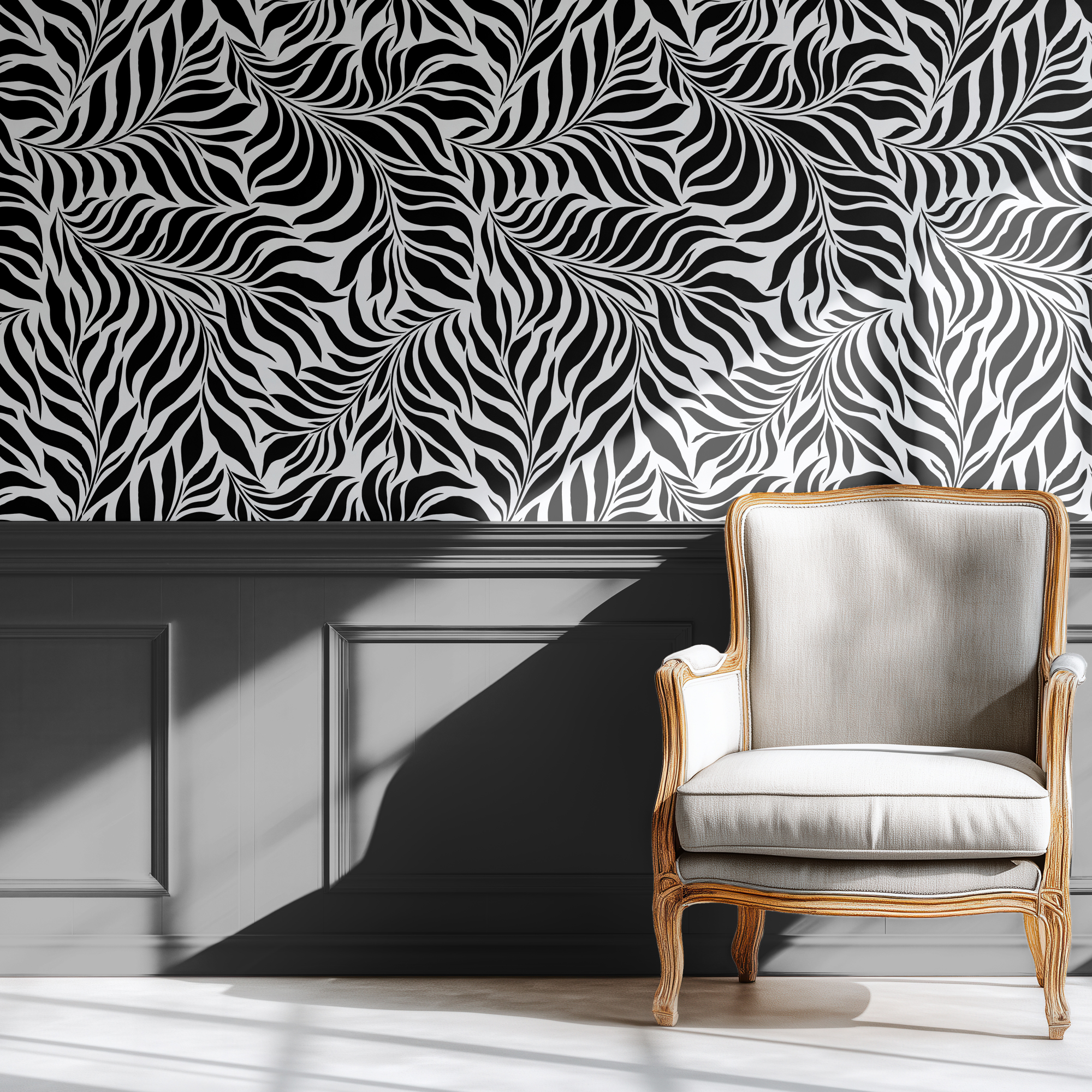 Make a bold statement with our Black and White Tropical Leaf Wallpaper, featuring stylized flowing leaves in a striking monochrome palette.