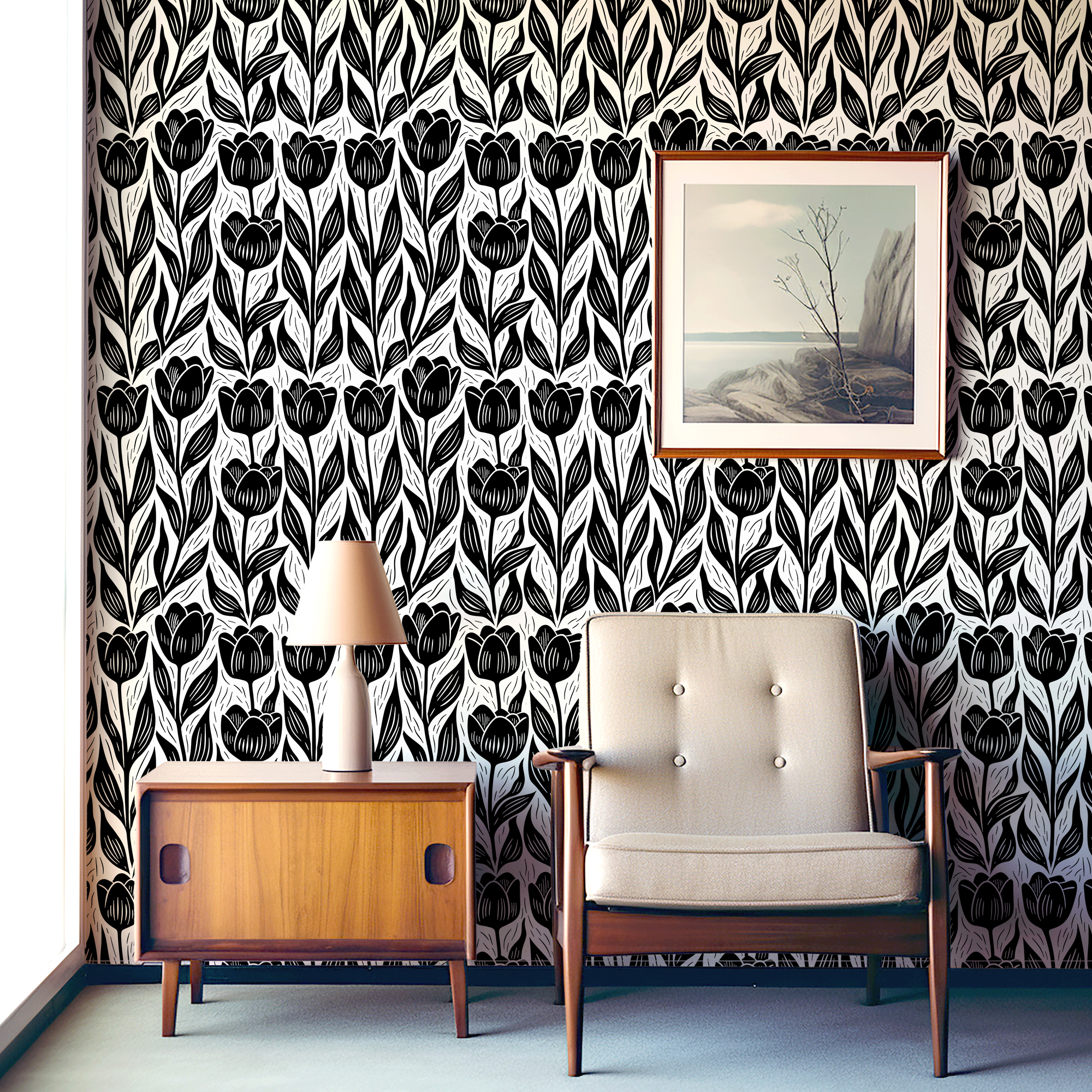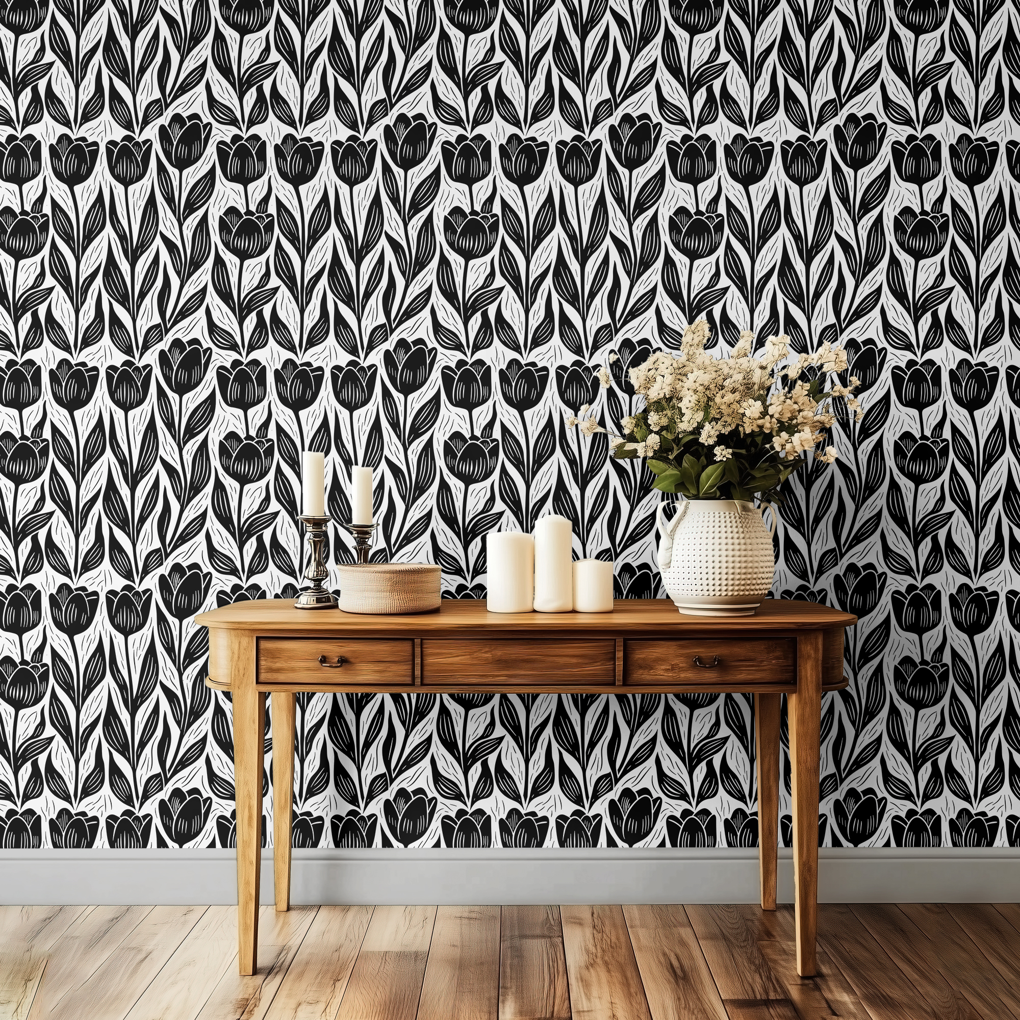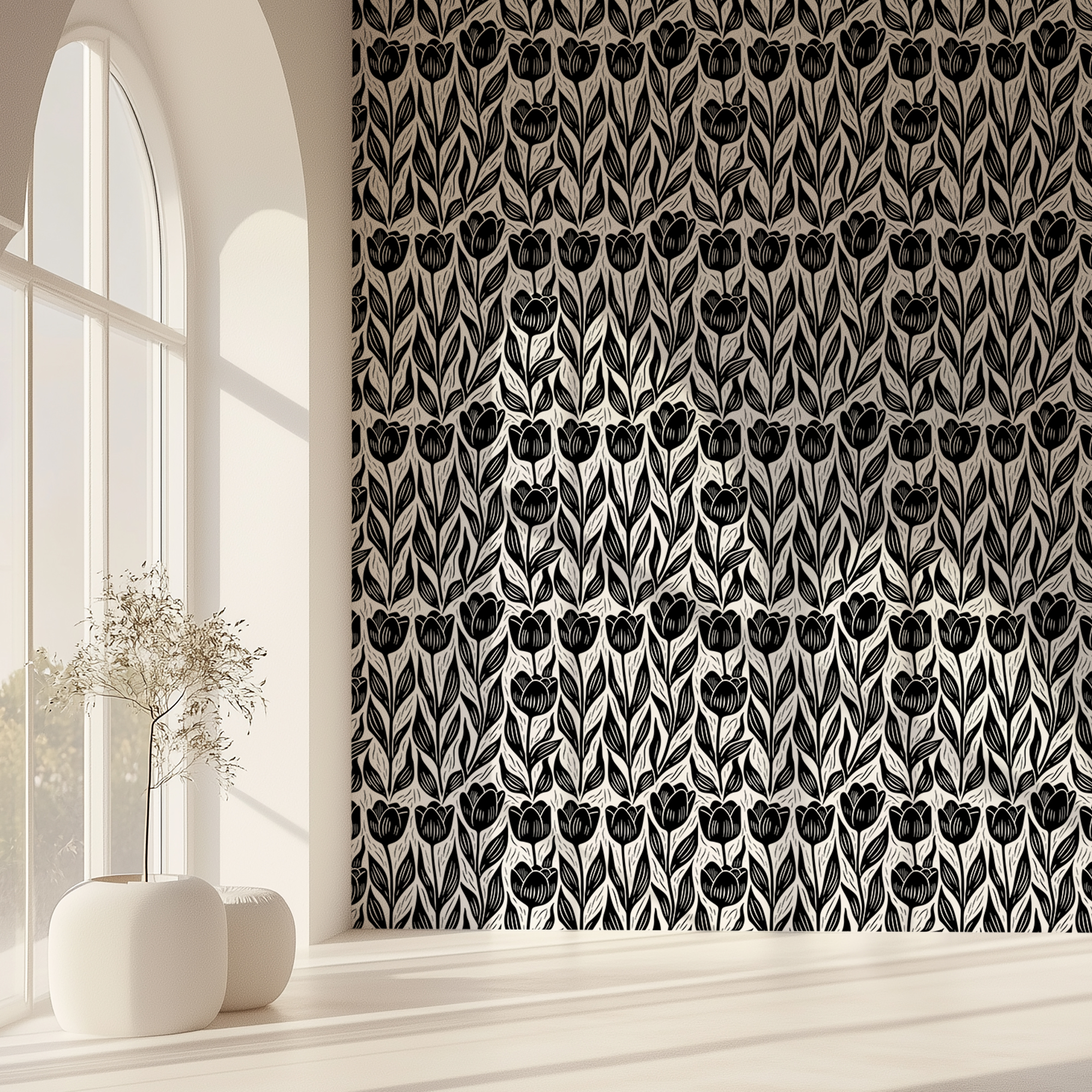 Make a statement with our Black and White Tulip Wallpaper, featuring bold floral silhouettes in a striking monochrome palette. The repeating tulip and leaf motifs create a modern and artistic look, blending botanical inspiration with graphic minimalism.