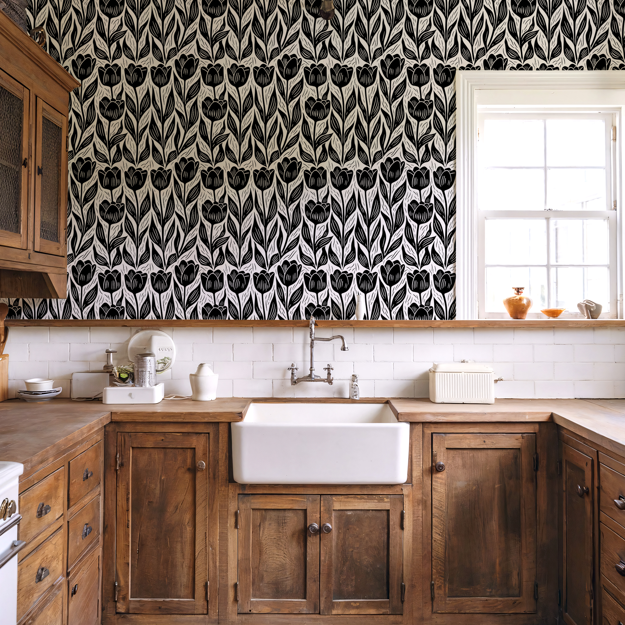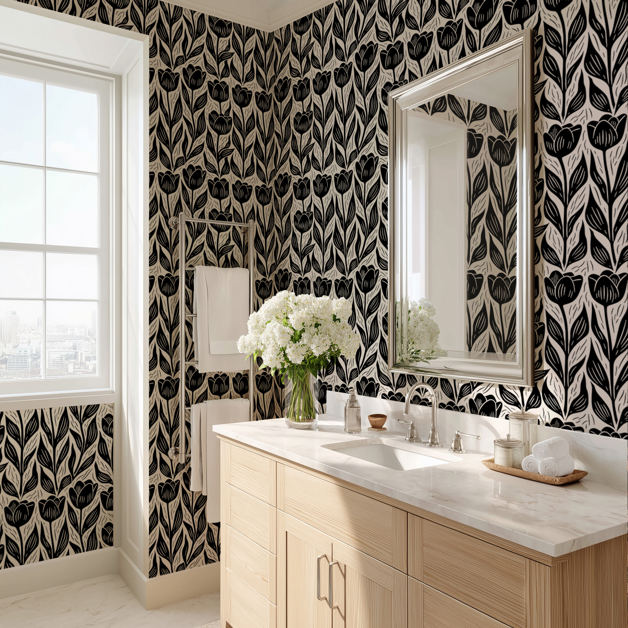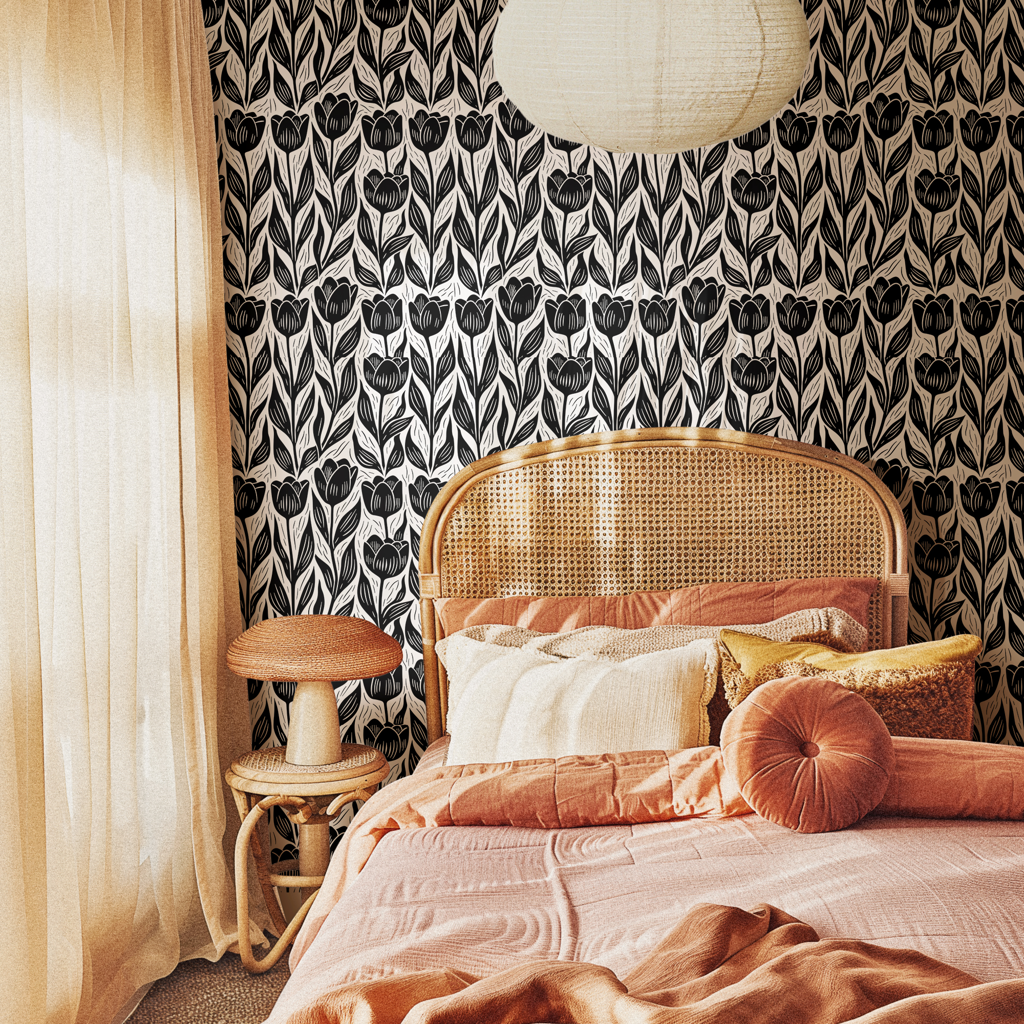 Make a statement with our Black and White Tulip Wallpaper, featuring bold floral silhouettes in a striking monochrome palette. The repeating tulip and leaf motifs create a modern and artistic look, blending botanical inspiration with graphic minimalism.