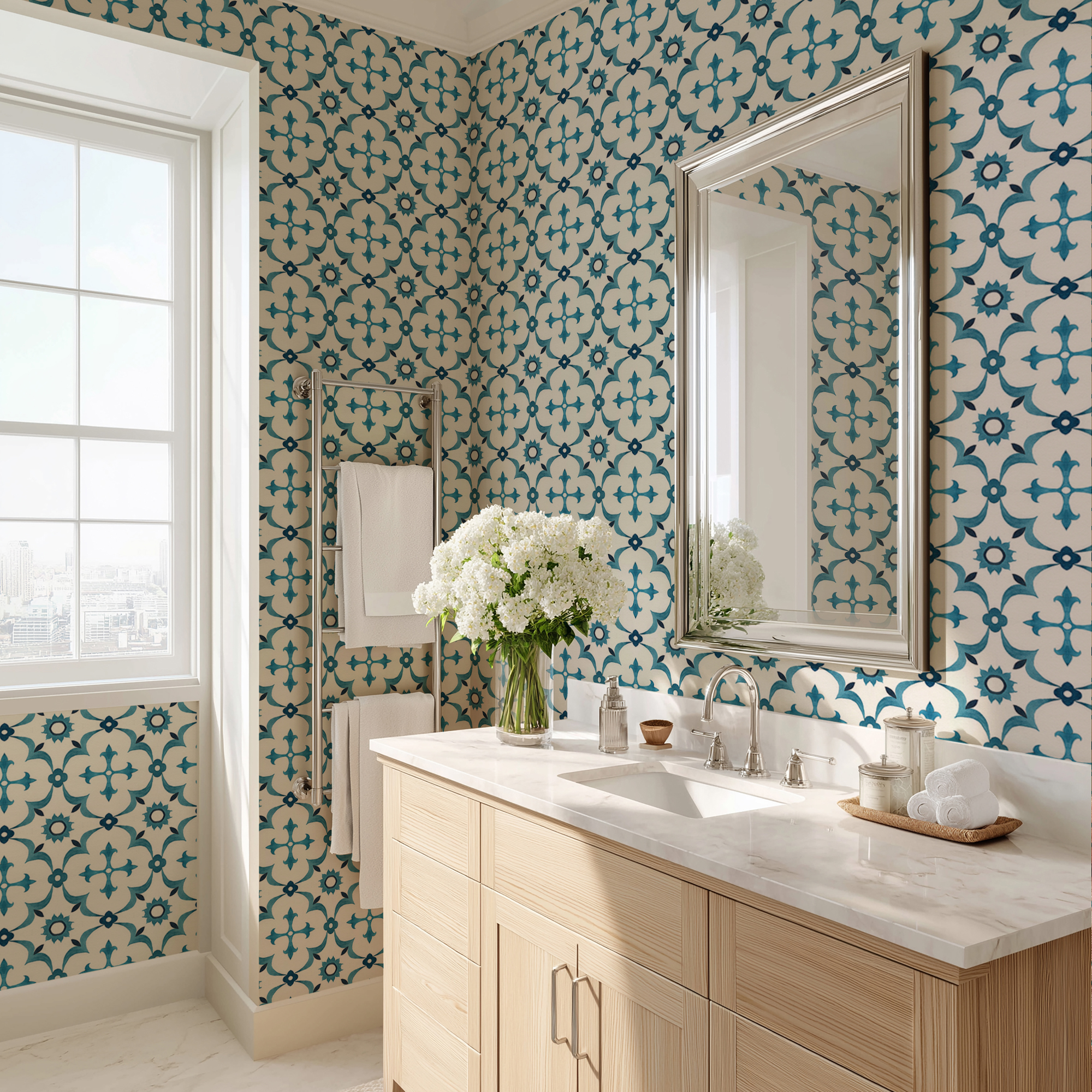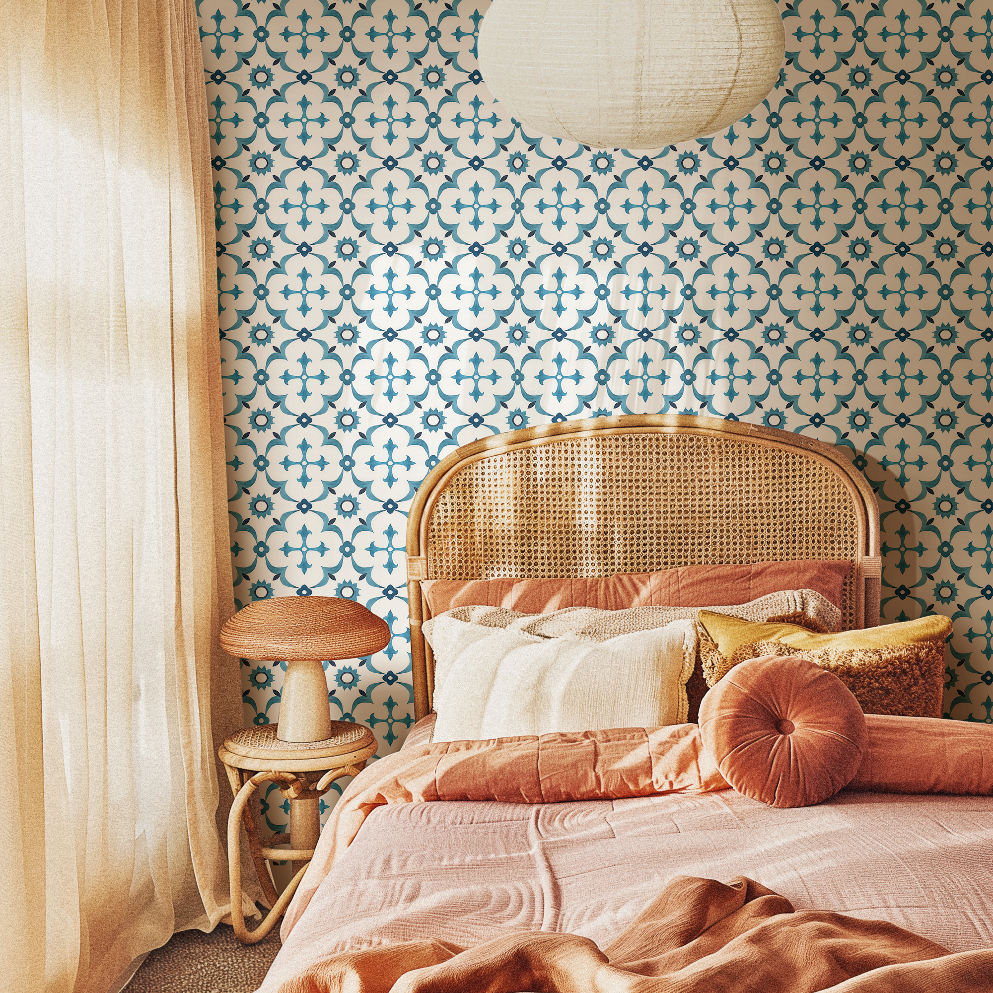 Available in peel and stick removable finish, this wallpaper is renter-friendly, easy to install, and easy to remove, making it an ideal choice for both modern and classic interiors. Add a touch of Mediterranean charm to your home with this versatile wallcovering.