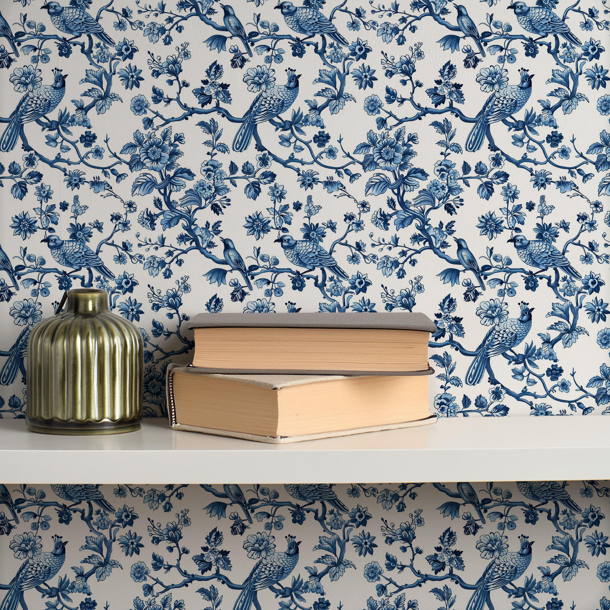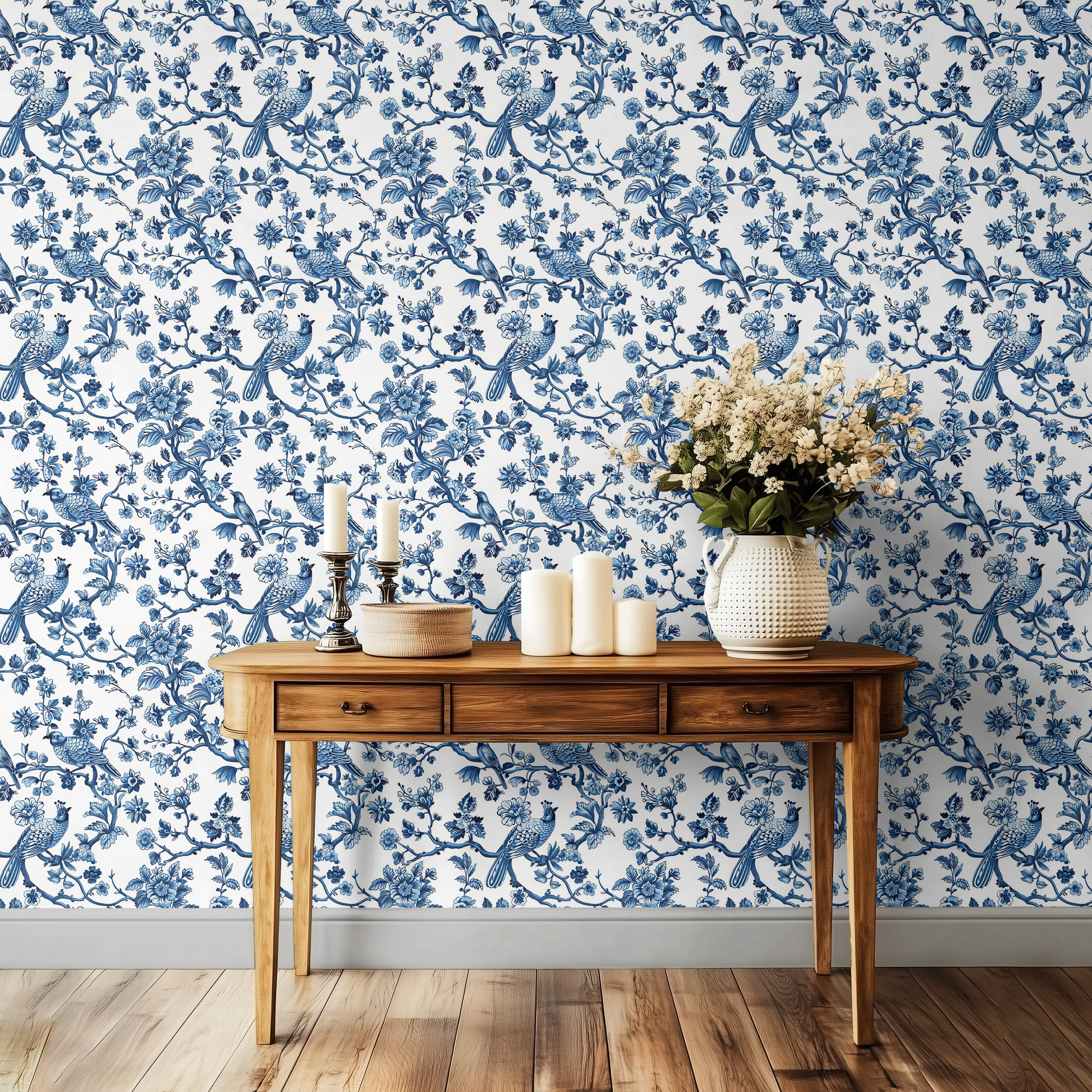Bring timeless elegance to your home with our Blue Toile Wallpaper, featuring delicate birds perched among floral branches in a classic blue and white palette. Inspired by traditional toile de Jouy patterns, this design adds a touch of European charm and sophistication to any room.