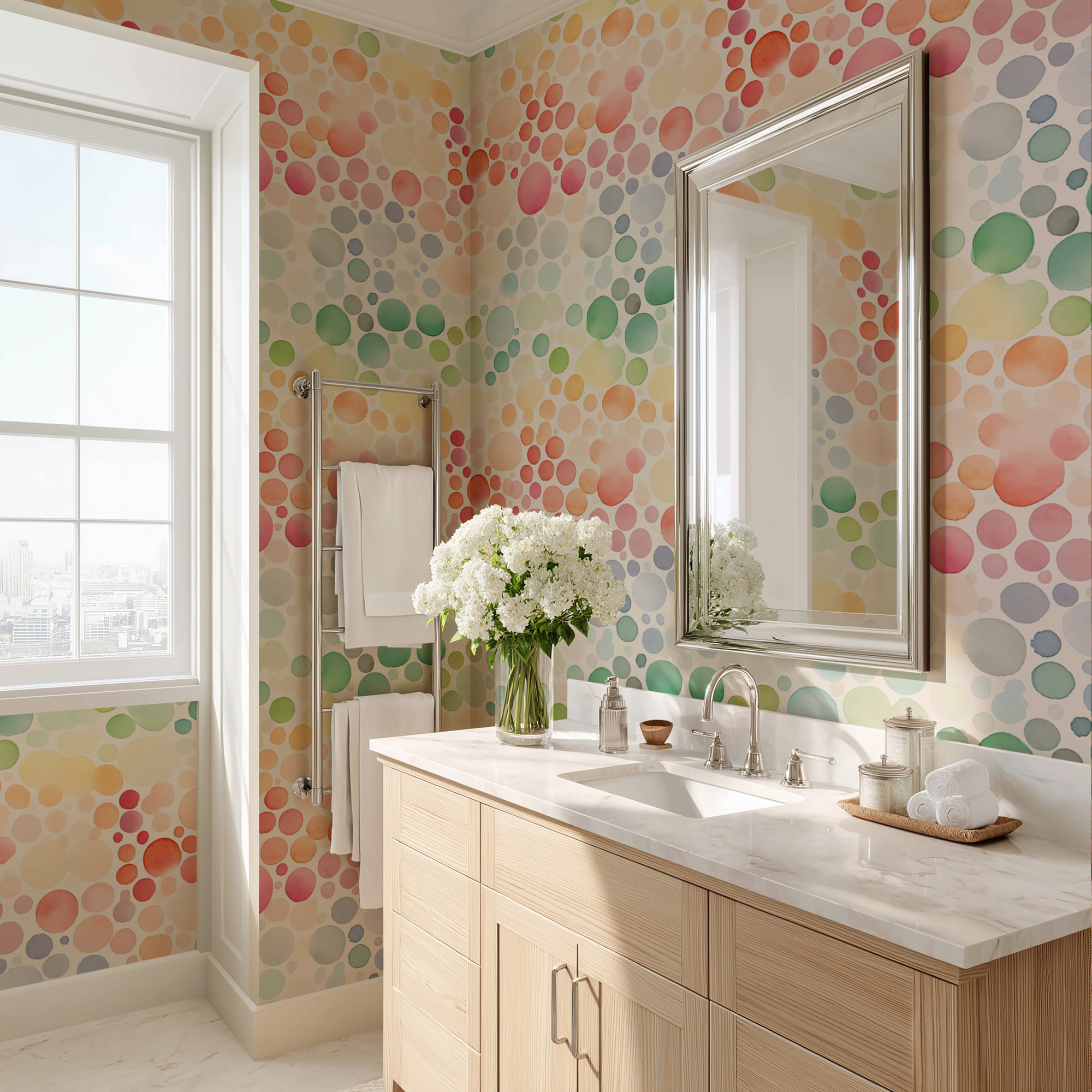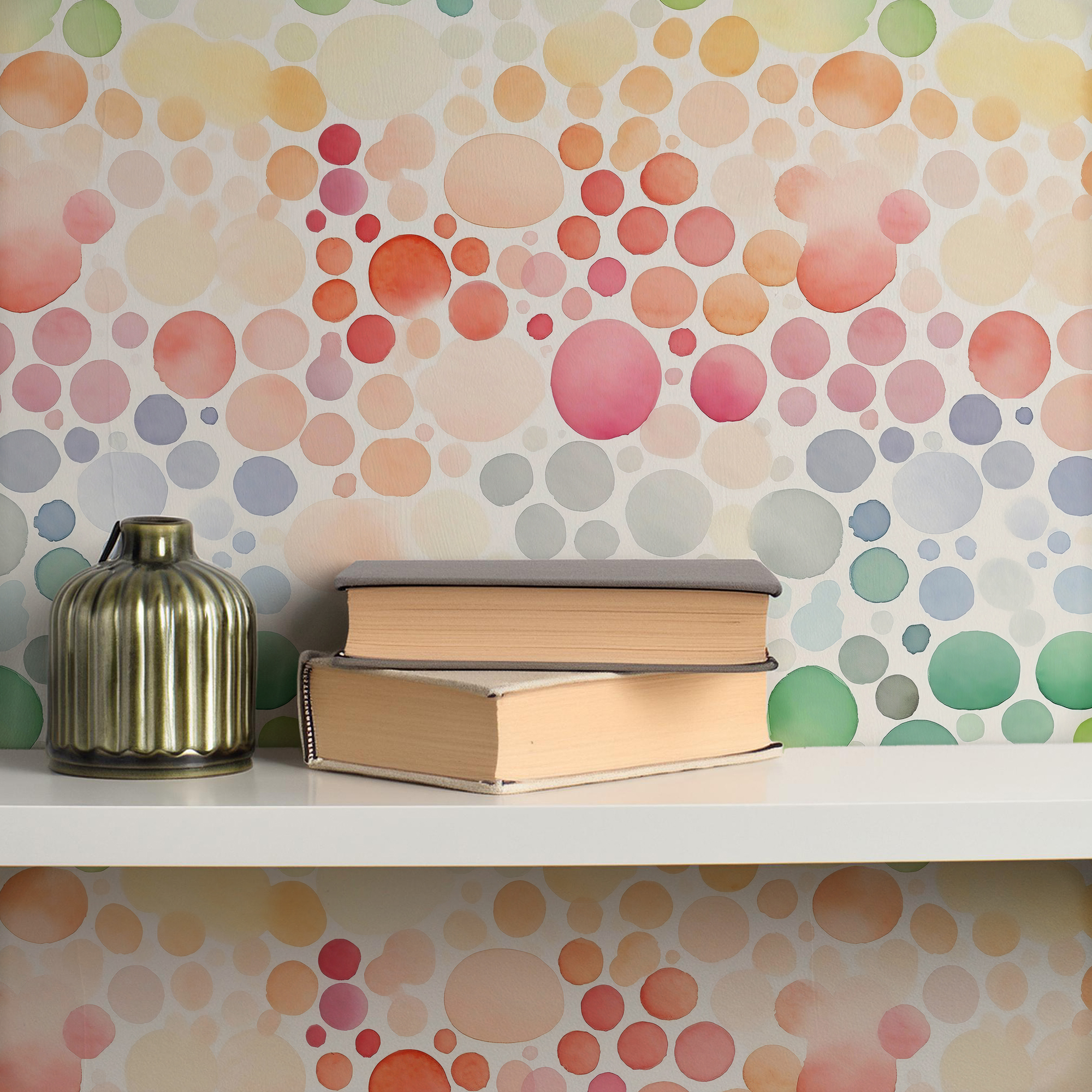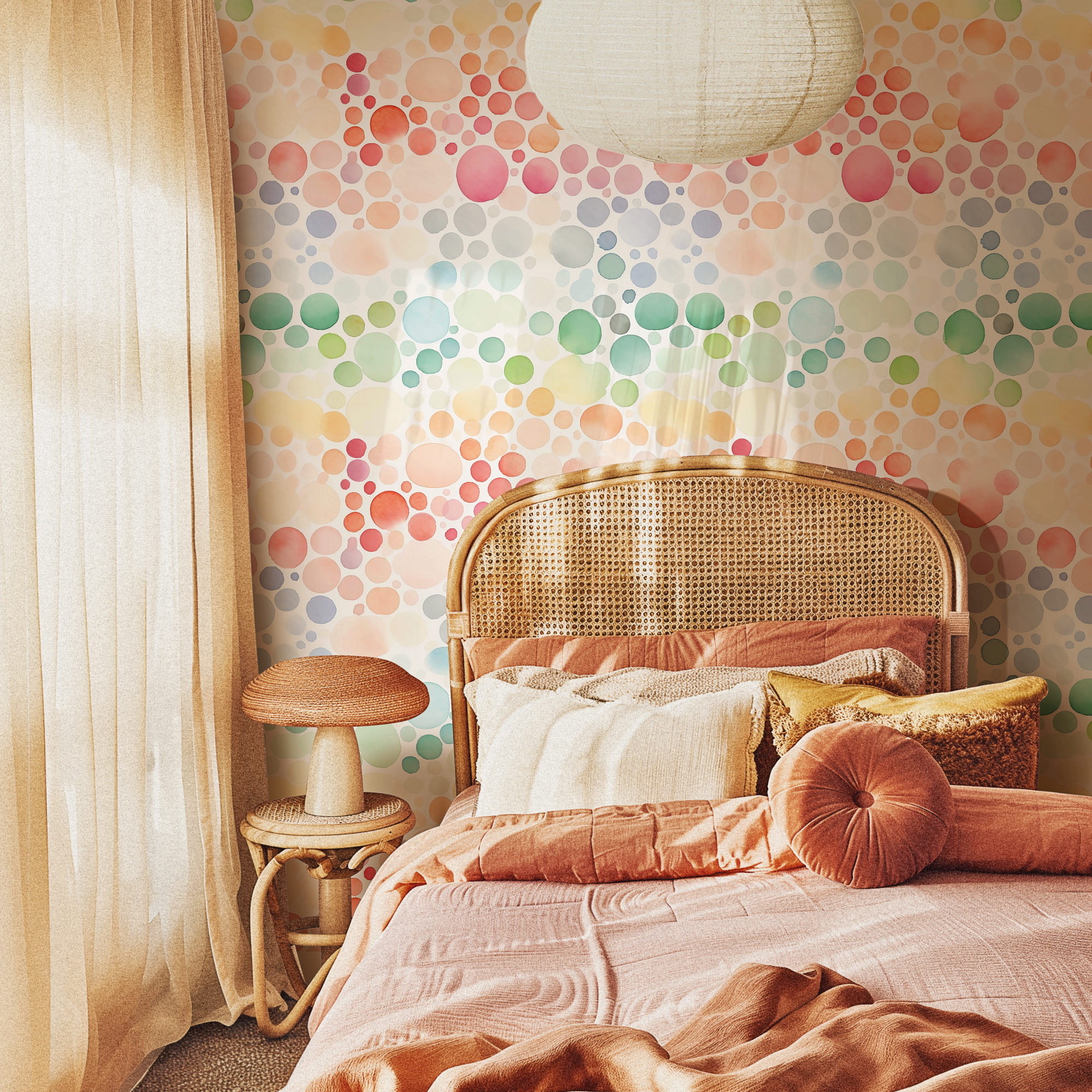 Bring playful energy to your home with our Colorful Bubble Wallpaper, featuring watercolor circles in a rainbow of shades including red, orange, pink, green, and blue. The flowing hand-painted style creates a whimsical and cheerful atmosphere, perfect for bright and creative spaces.