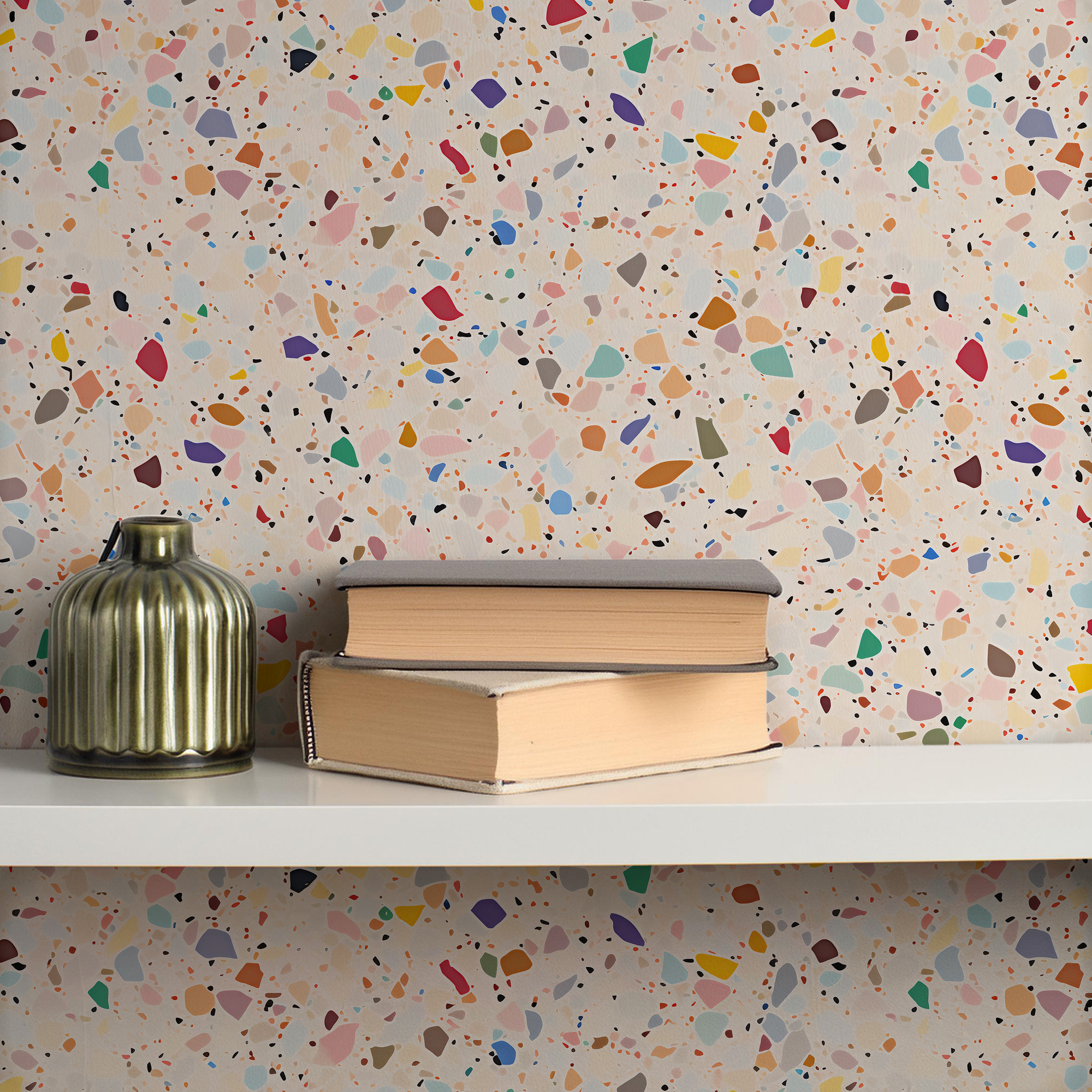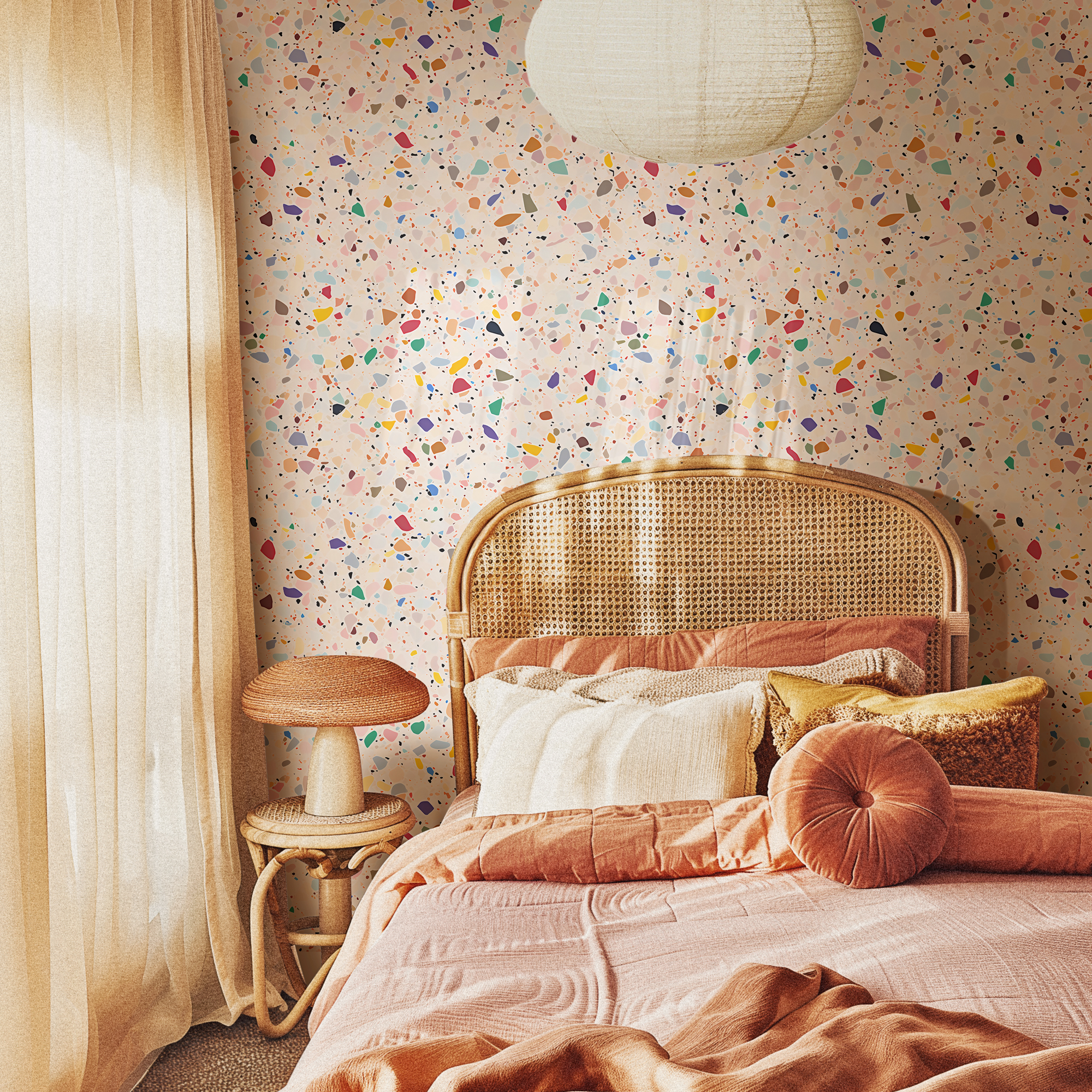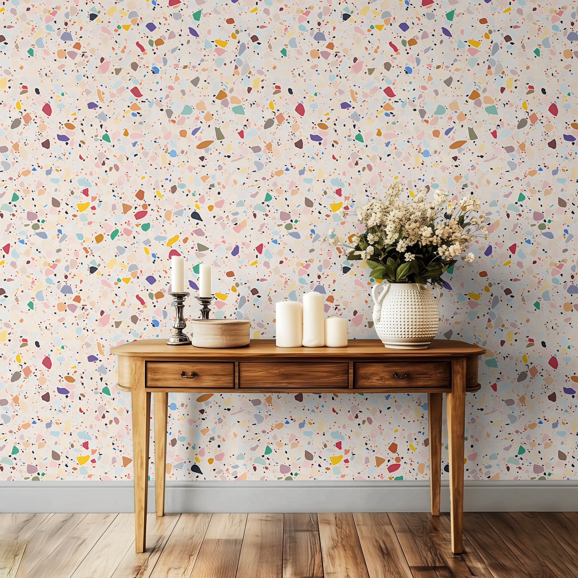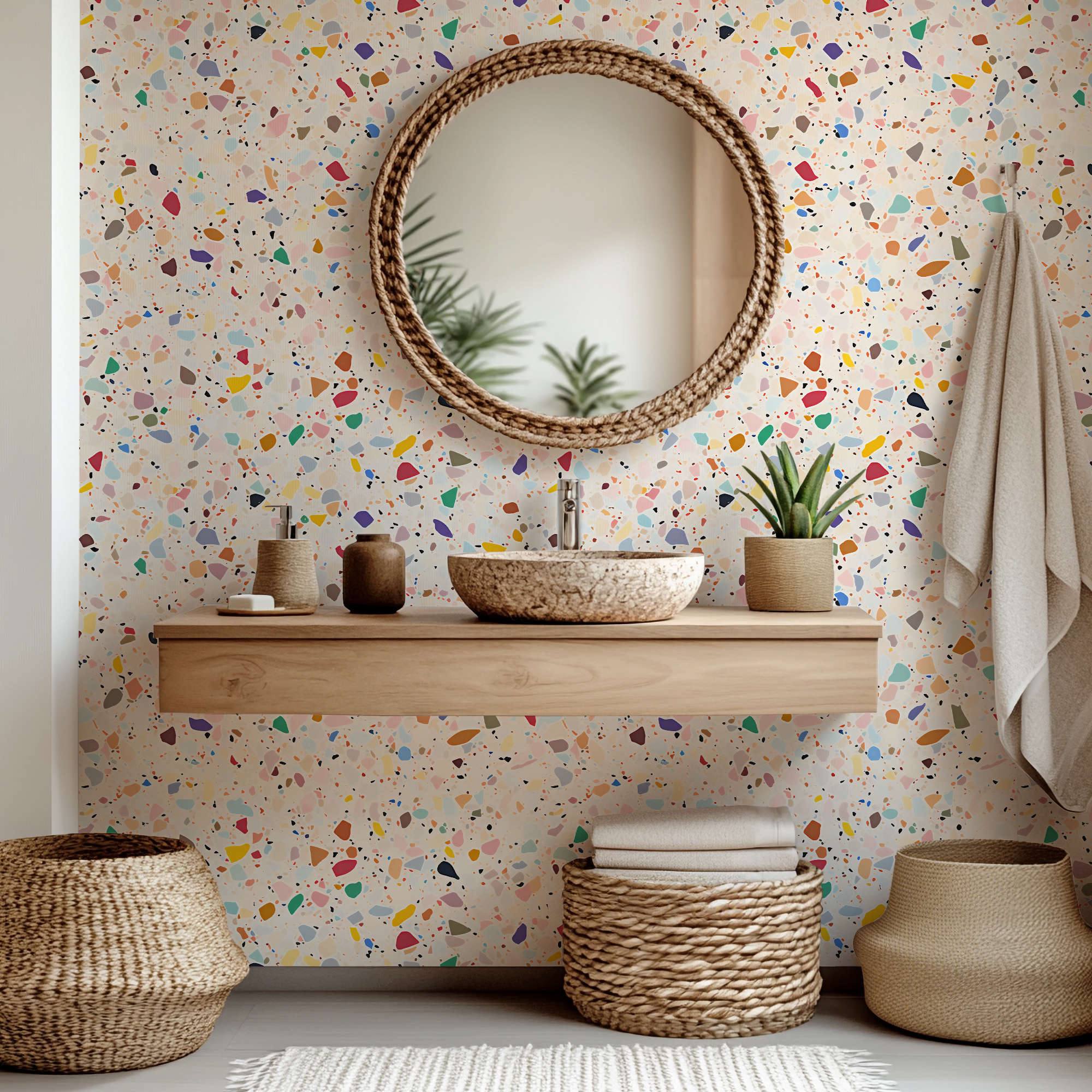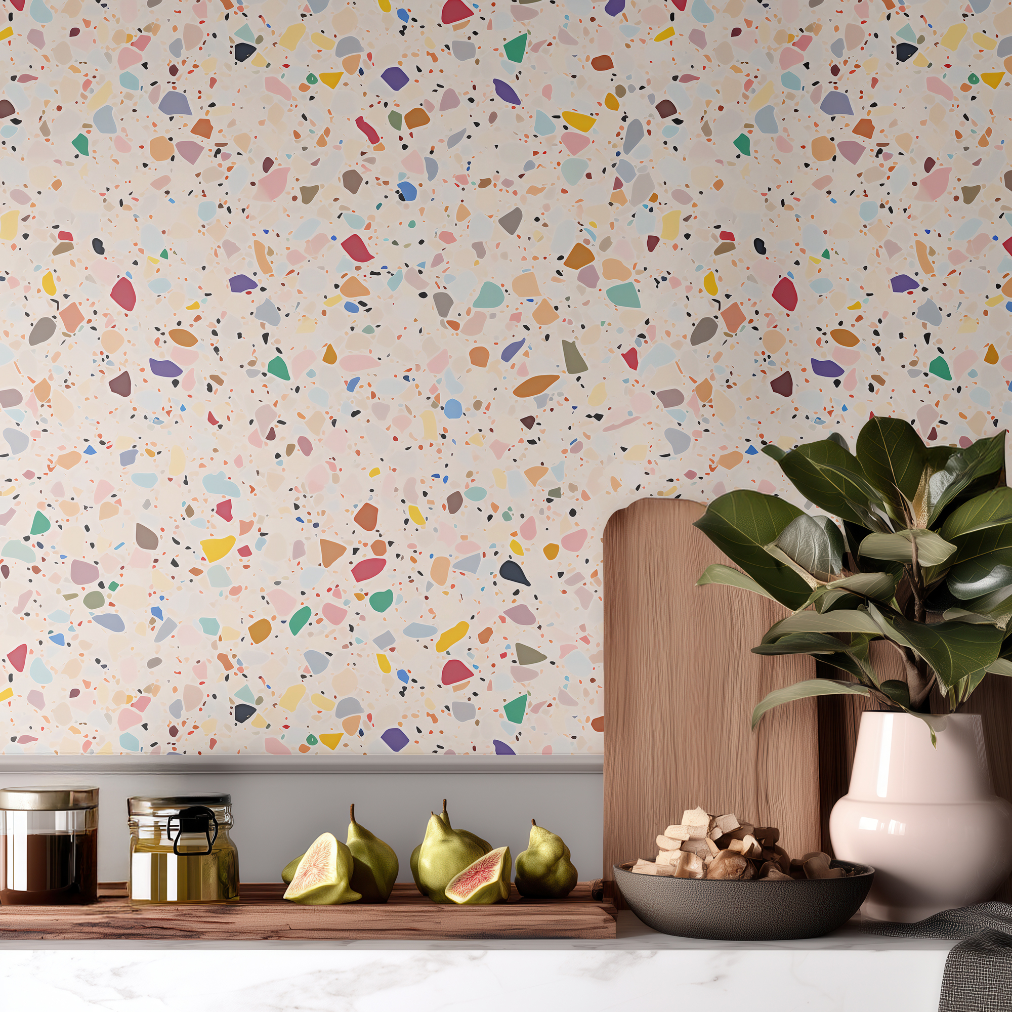 Bring joy and color to your space with our Colorful Rainbow Terrazzo Wallpaper, a playful take on the classic terrazzo style. Featuring vibrant chips in pink, blue, green, yellow, and terracotta over a soft neutral background, this design adds instant personality to any room.