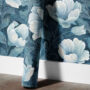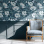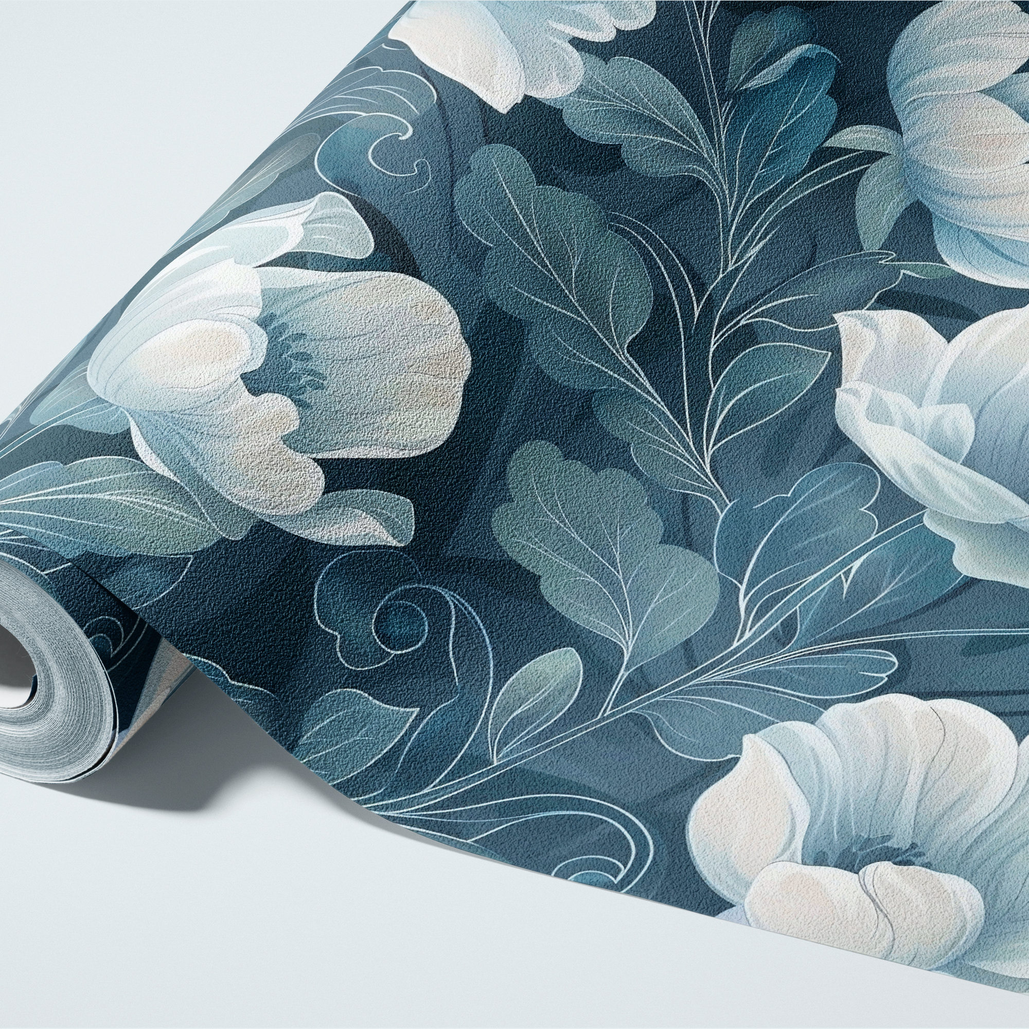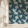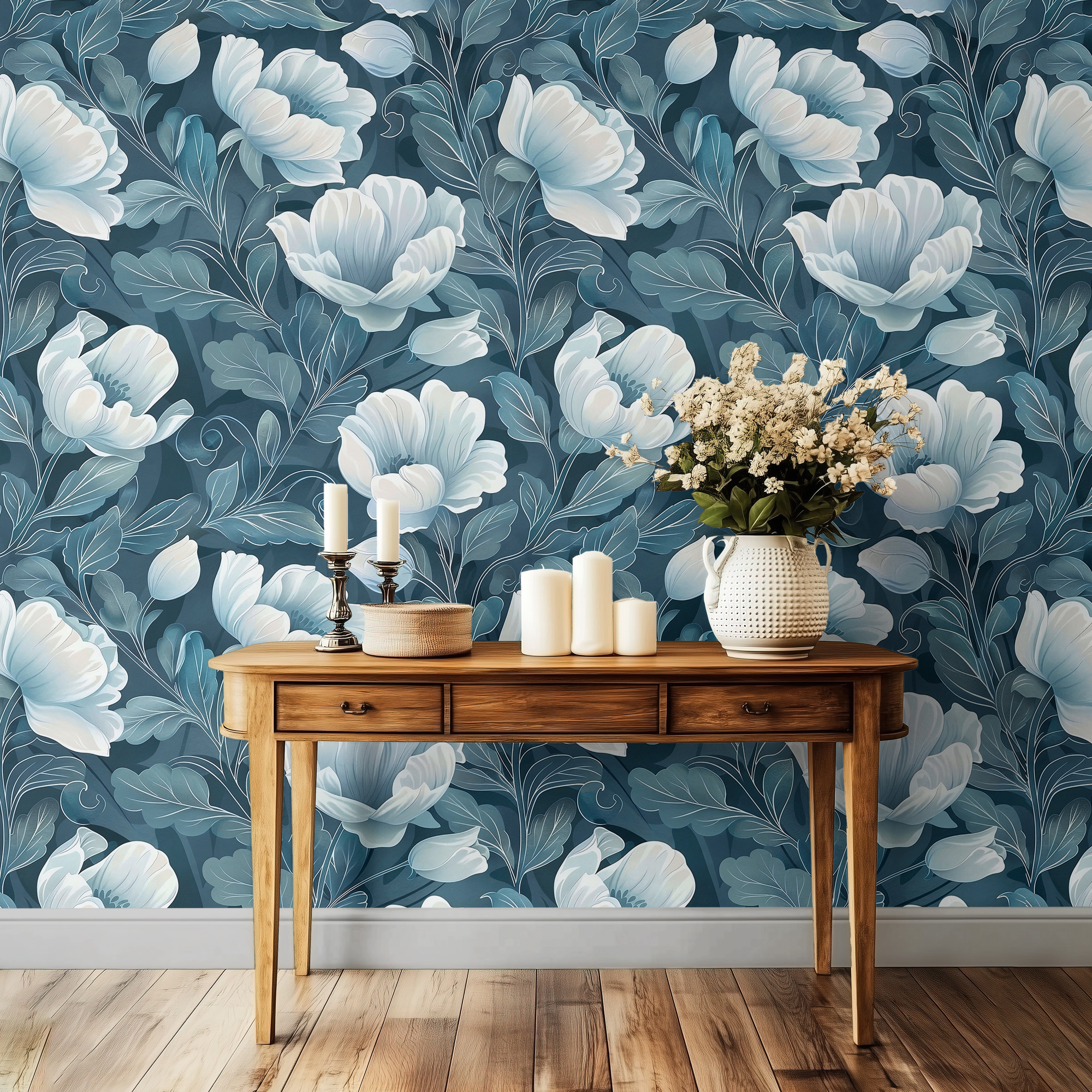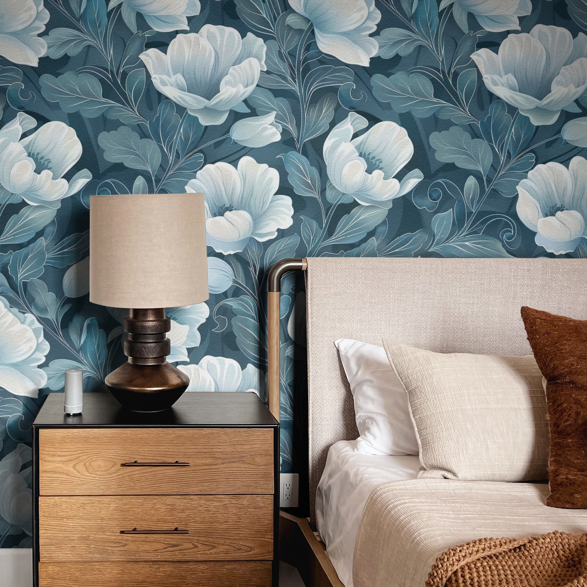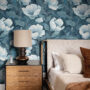 Bring timeless charm and modern sophistication to your home with our Blue Floral Wallpaper, featuring large, hand-painted blooms in shades of white, slate, and indigo over a deep blue background.