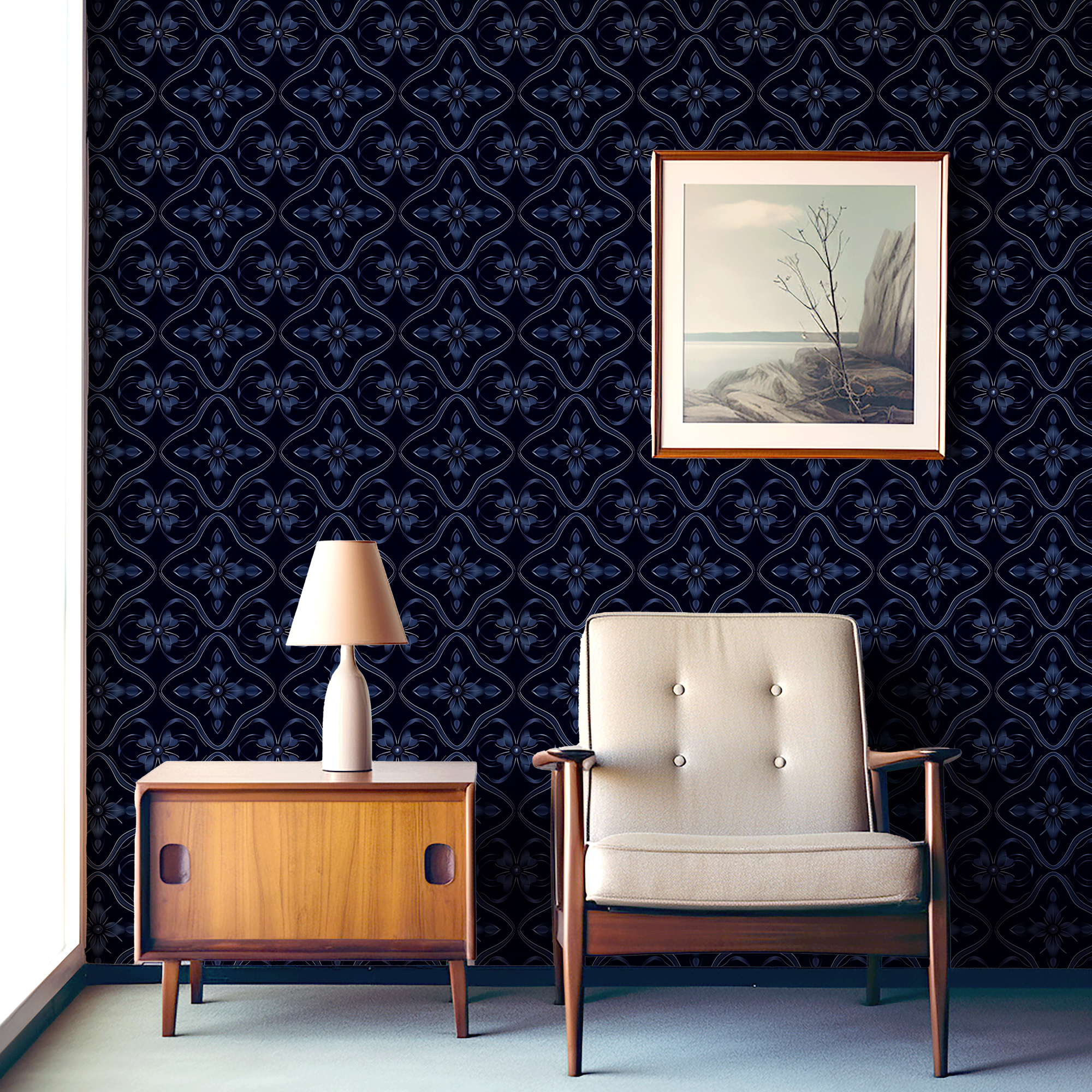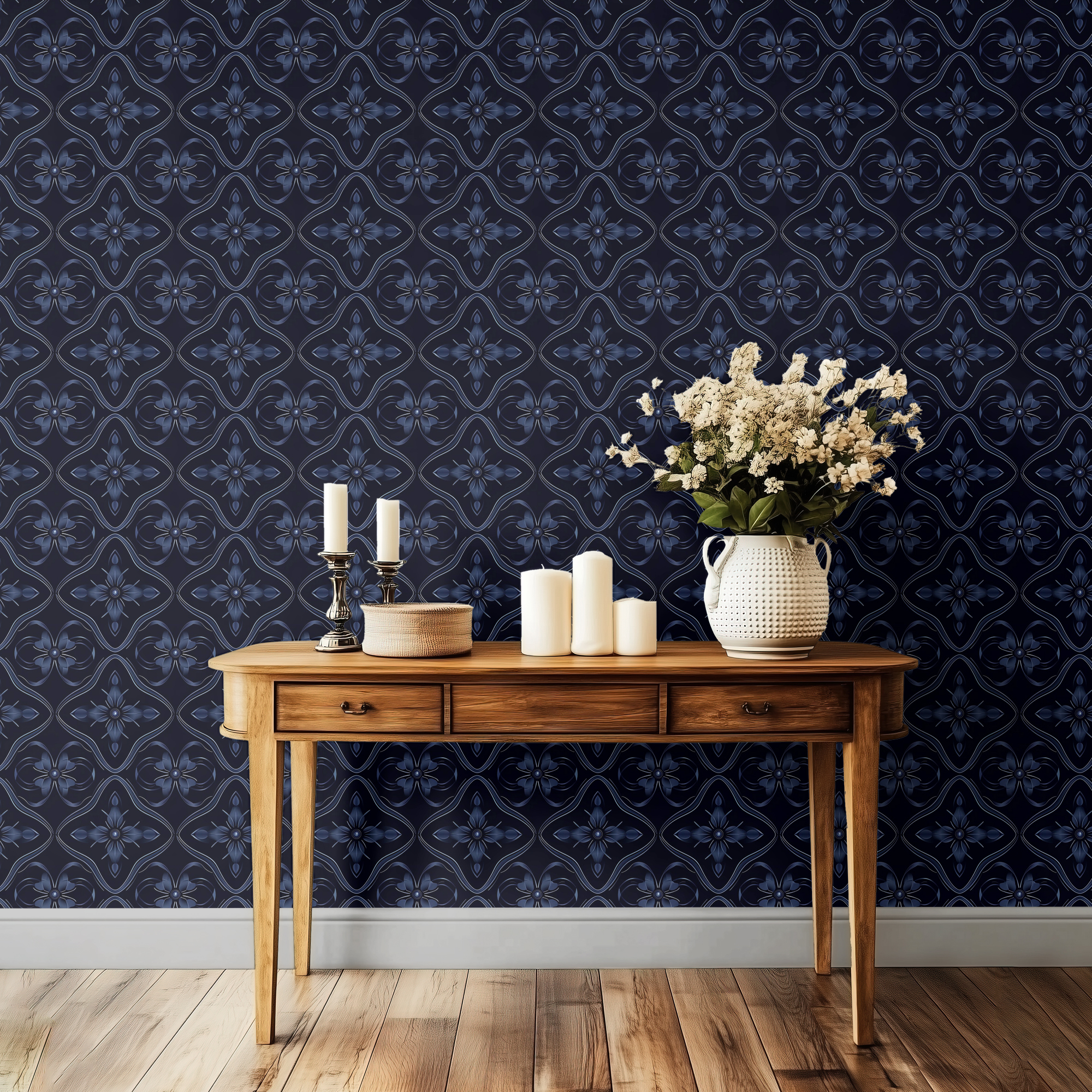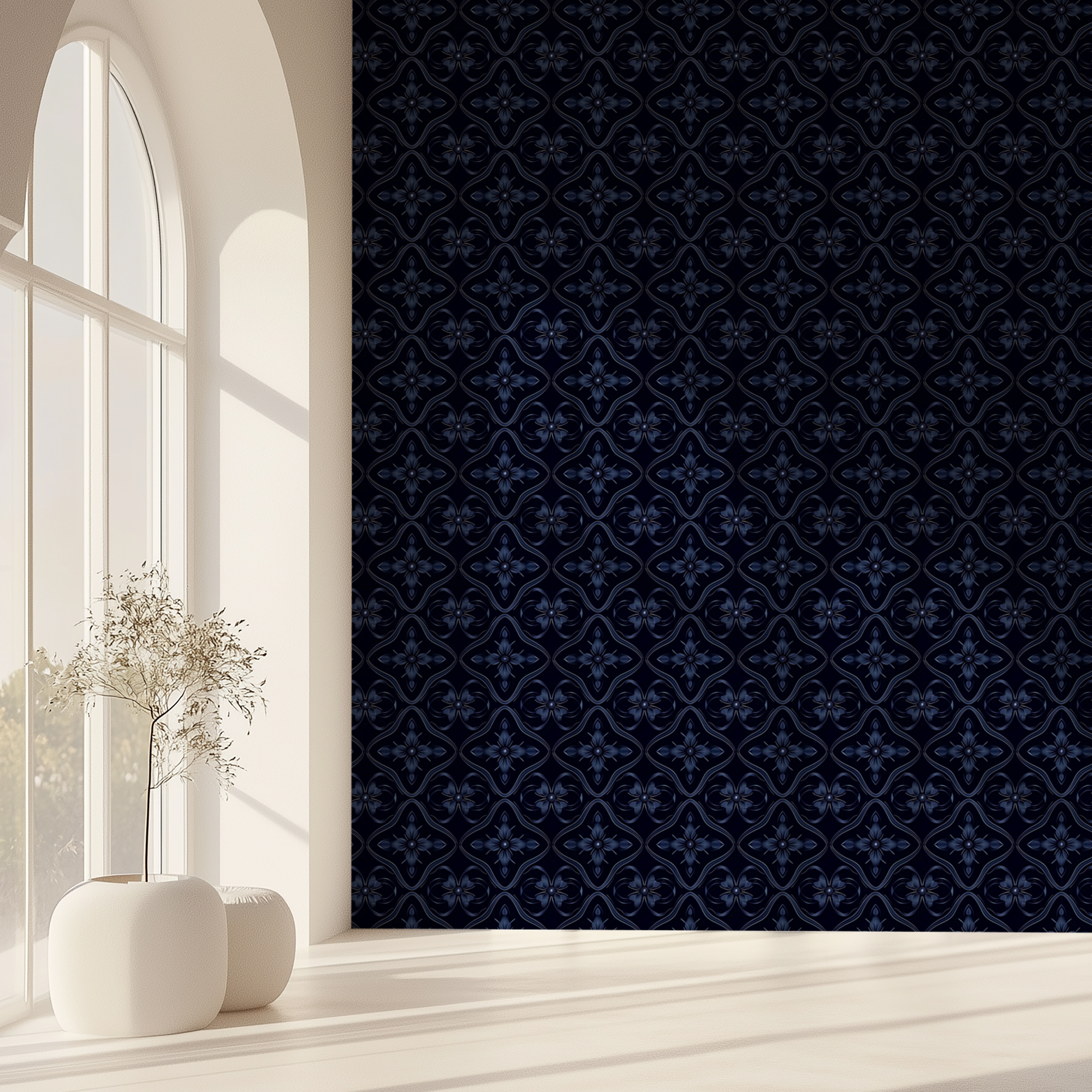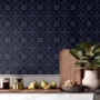 Add depth and sophistication to your home with our Dark Blue Tile Wallpaper, featuring a repeating geometric motif with floral-inspired details in rich navy tones. The bold dark background enhances the luxurious and dramatic feel, making it a statement piece for modern interiors.