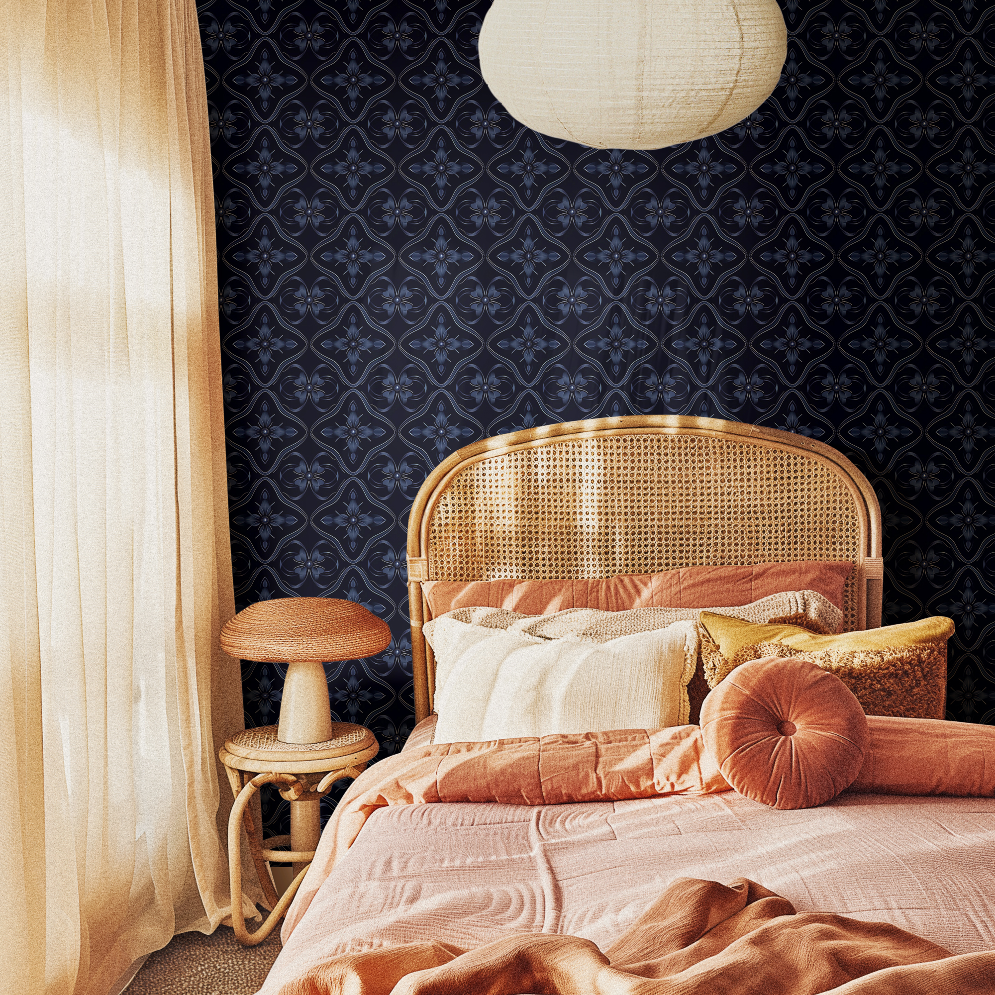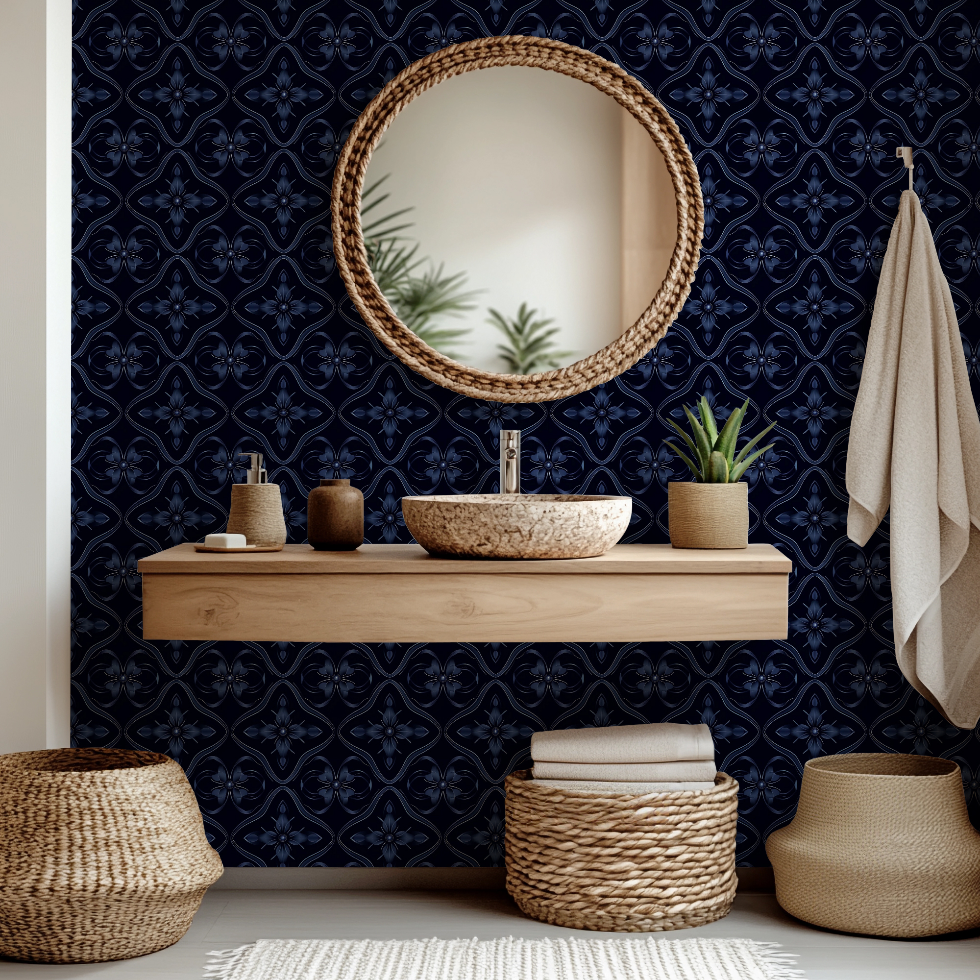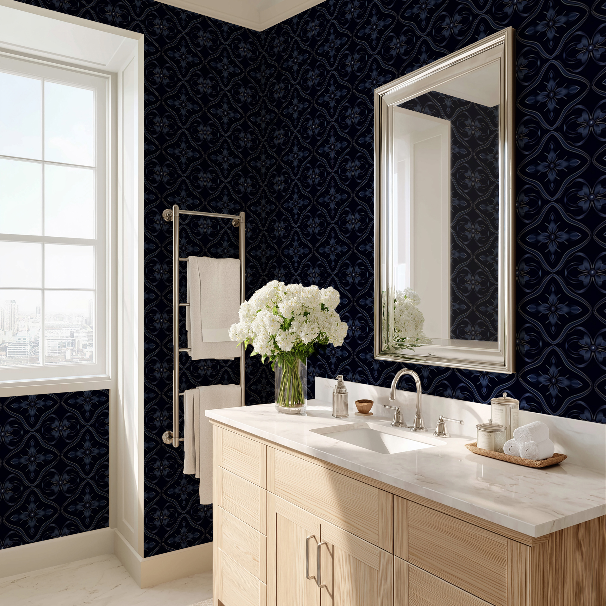 Add depth and sophistication to your home with our Dark Blue Tile Wallpaper, featuring a repeating geometric motif with floral-inspired details in rich navy tones. The bold dark background enhances the luxurious and dramatic feel, making it a statement piece for modern interiors.