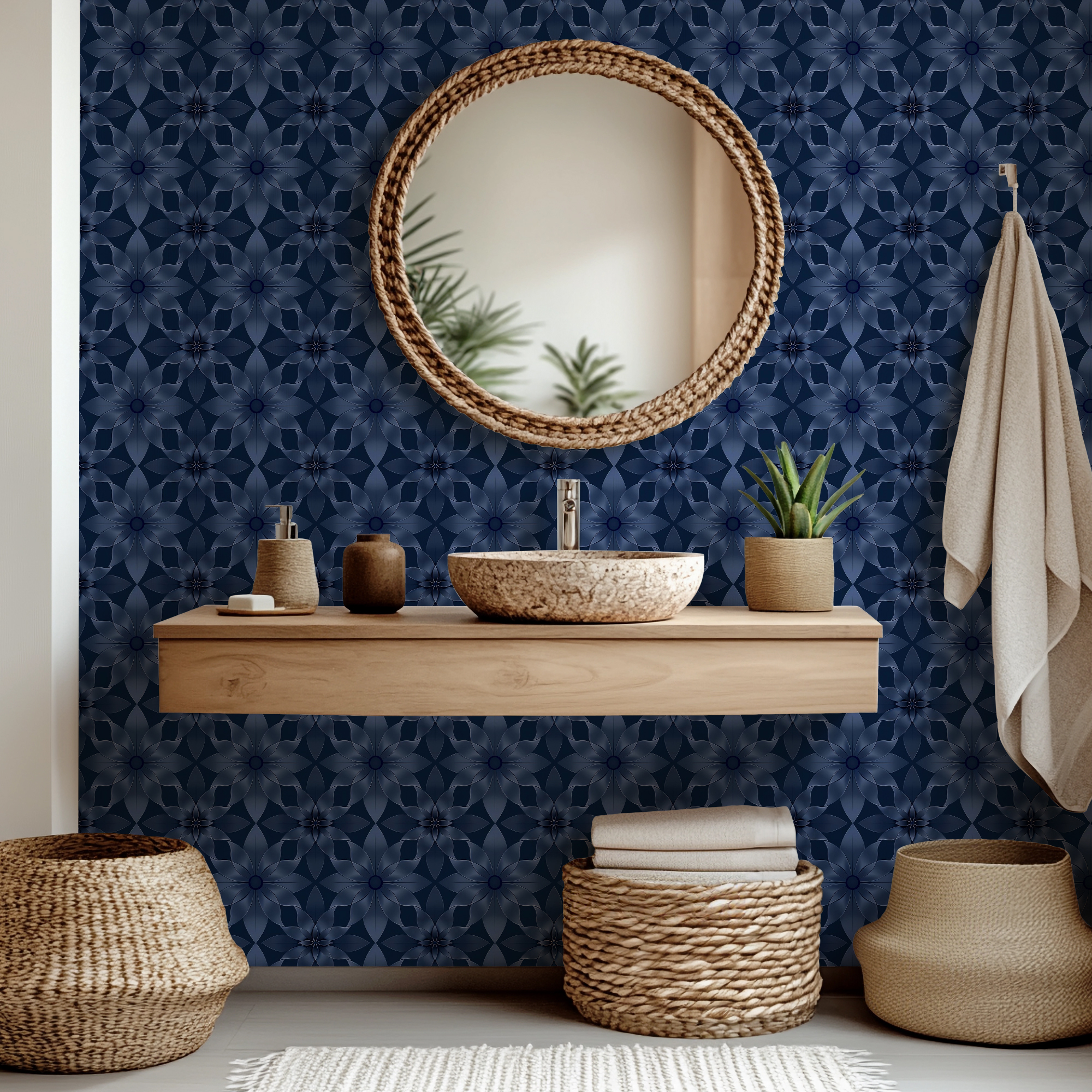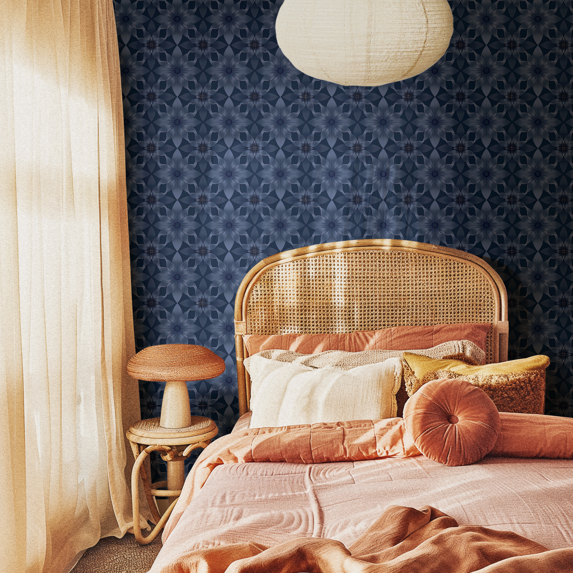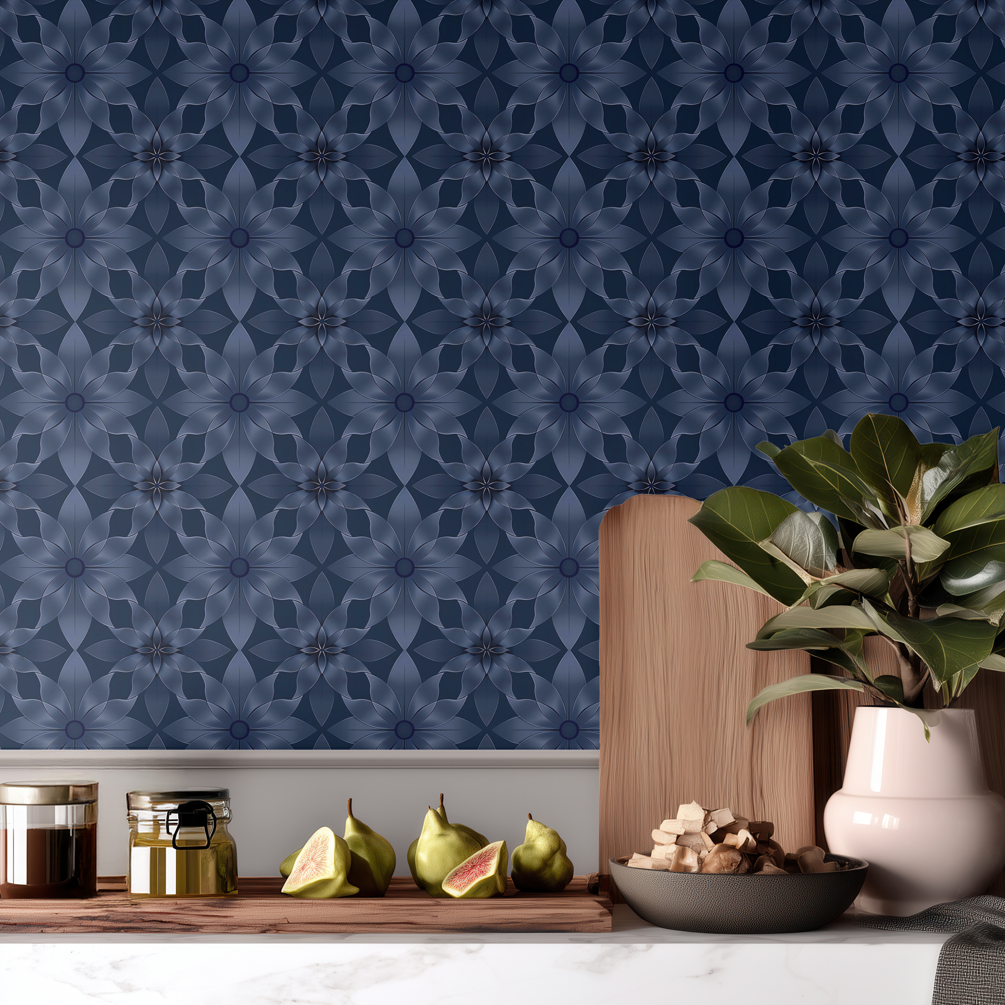 Transform your space with our Dark Blue Tile Wallpaper, featuring a geometric floral-inspired pattern in layered shades of blue over a deep background. The repeating design creates a sophisticated, bold, and modern look, perfect for adding depth and elegance to any wall.