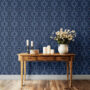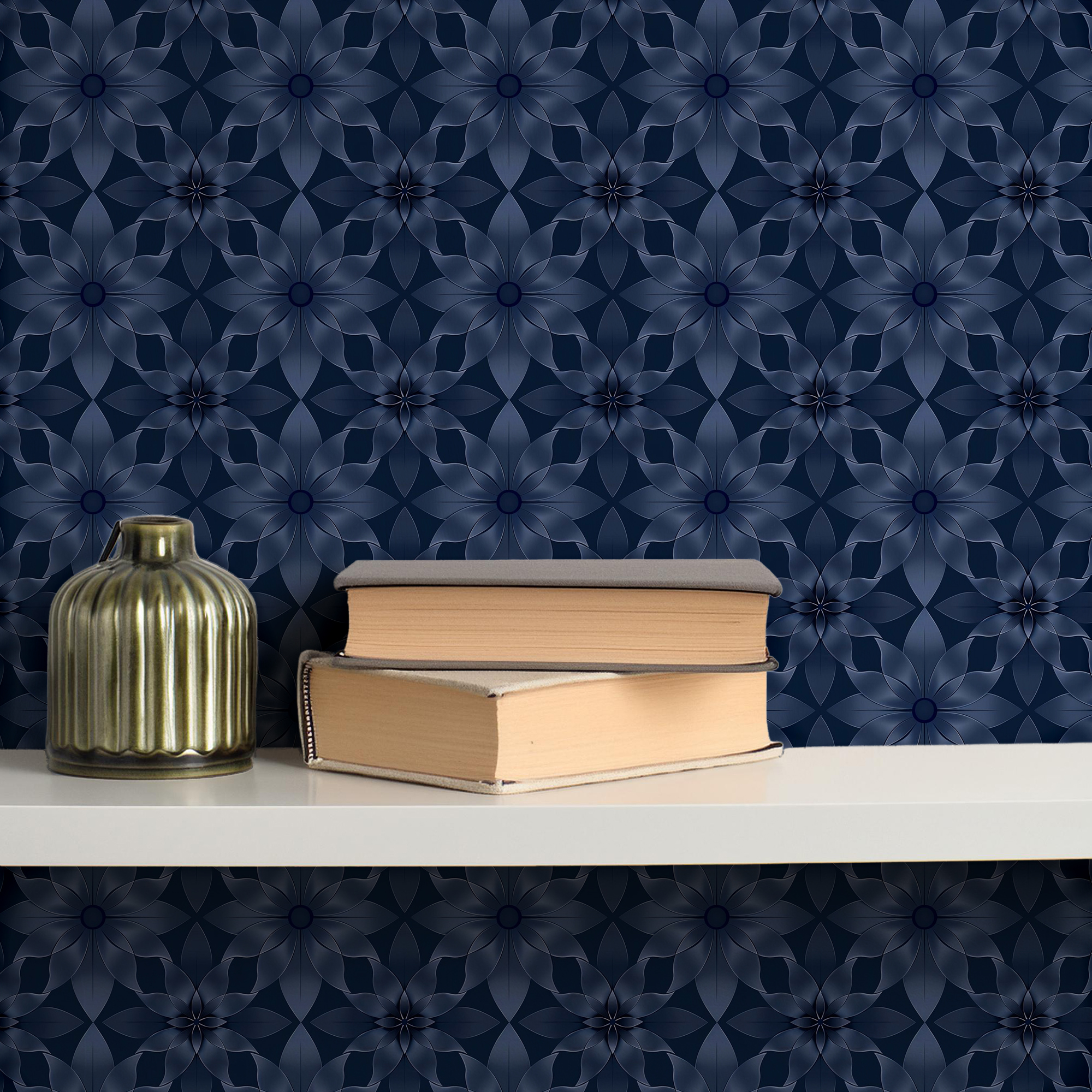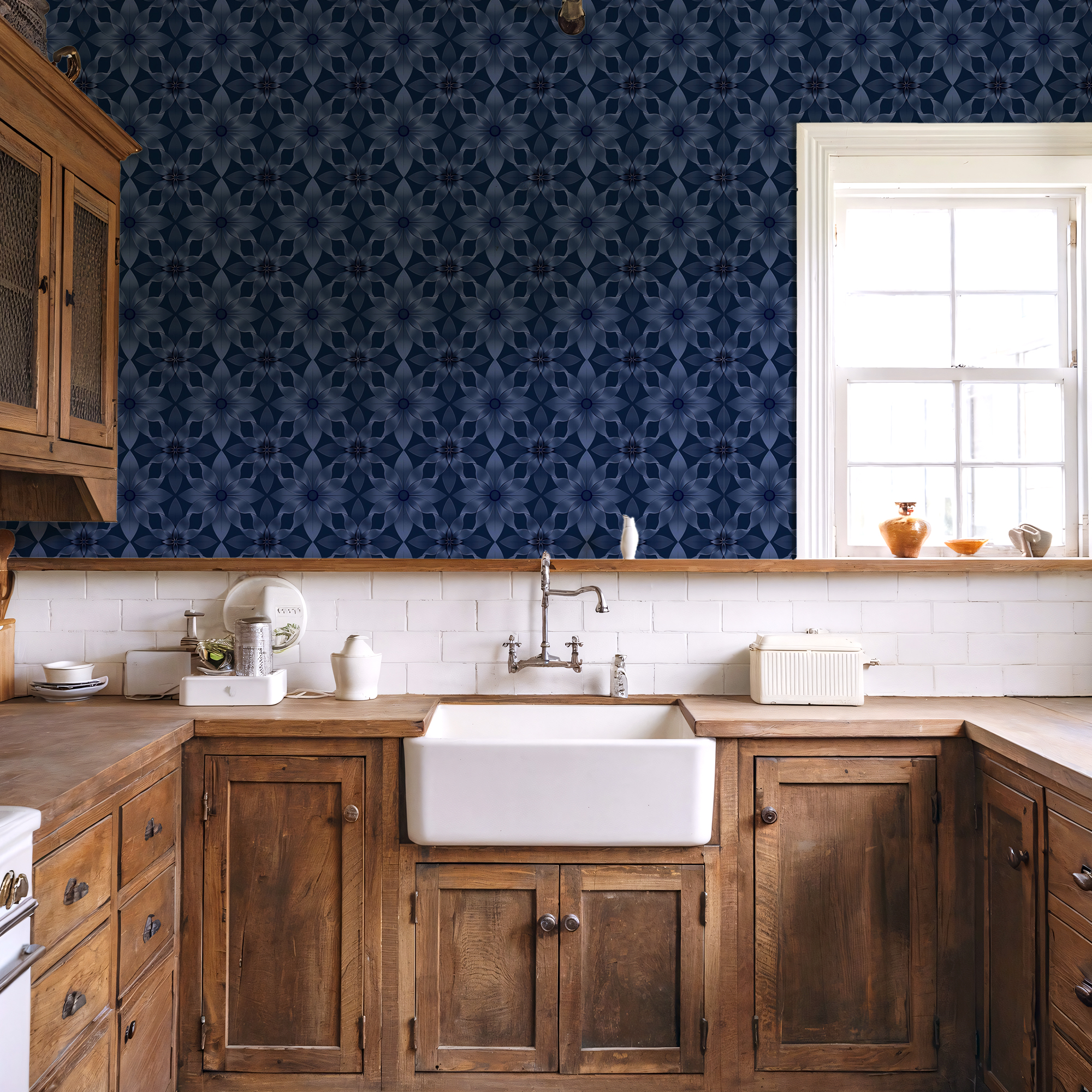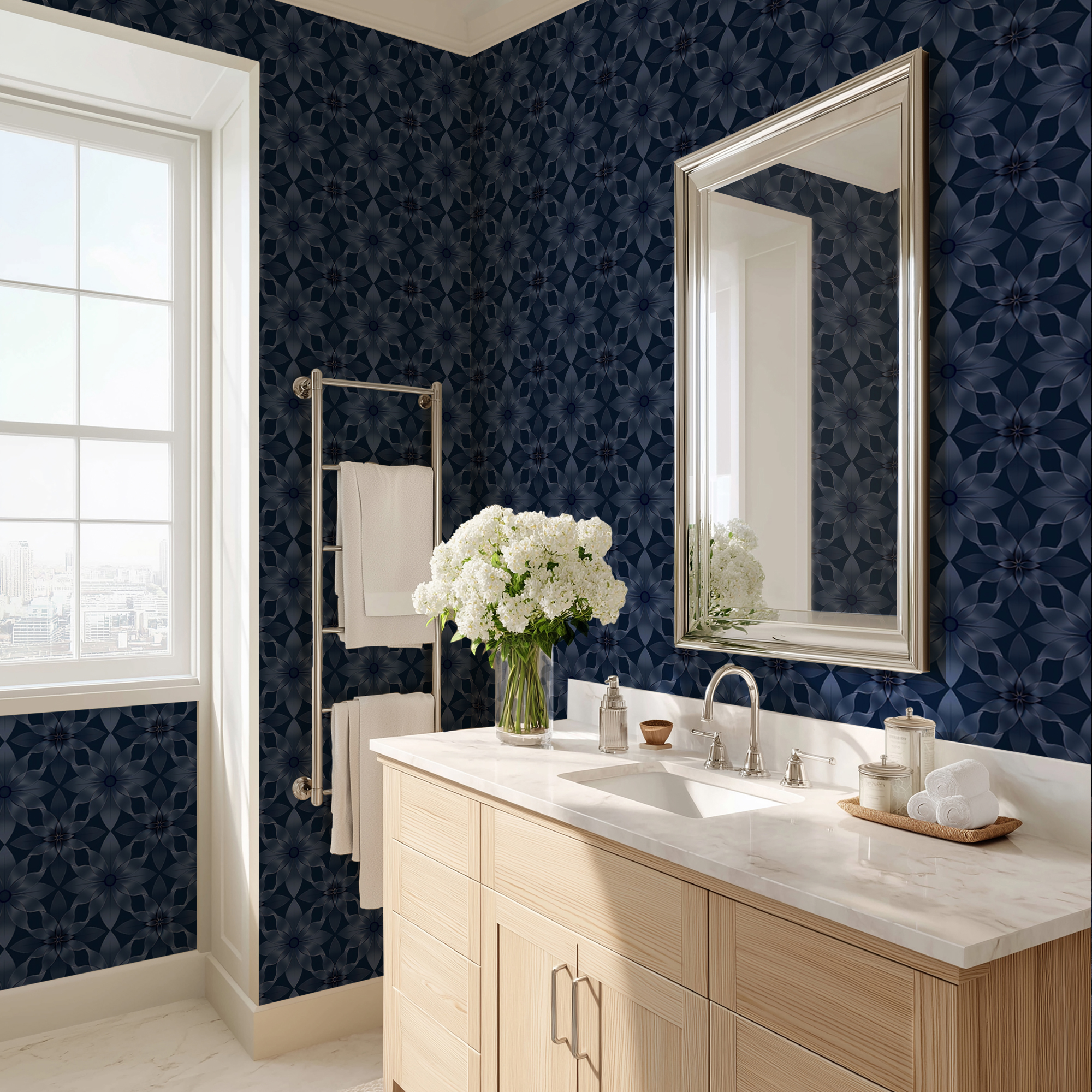 Transform your space with our Dark Blue Tile Wallpaper, featuring a geometric floral-inspired pattern in layered shades of blue over a deep background. The repeating design creates a sophisticated, bold, and modern look, perfect for adding depth and elegance to any wall.