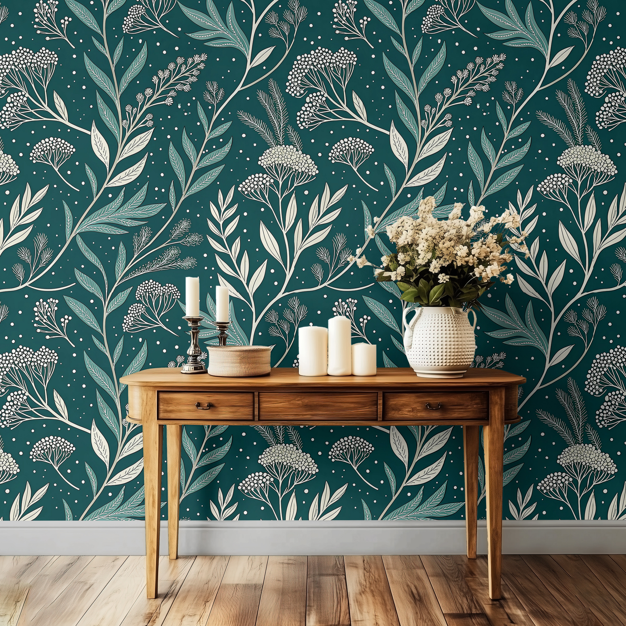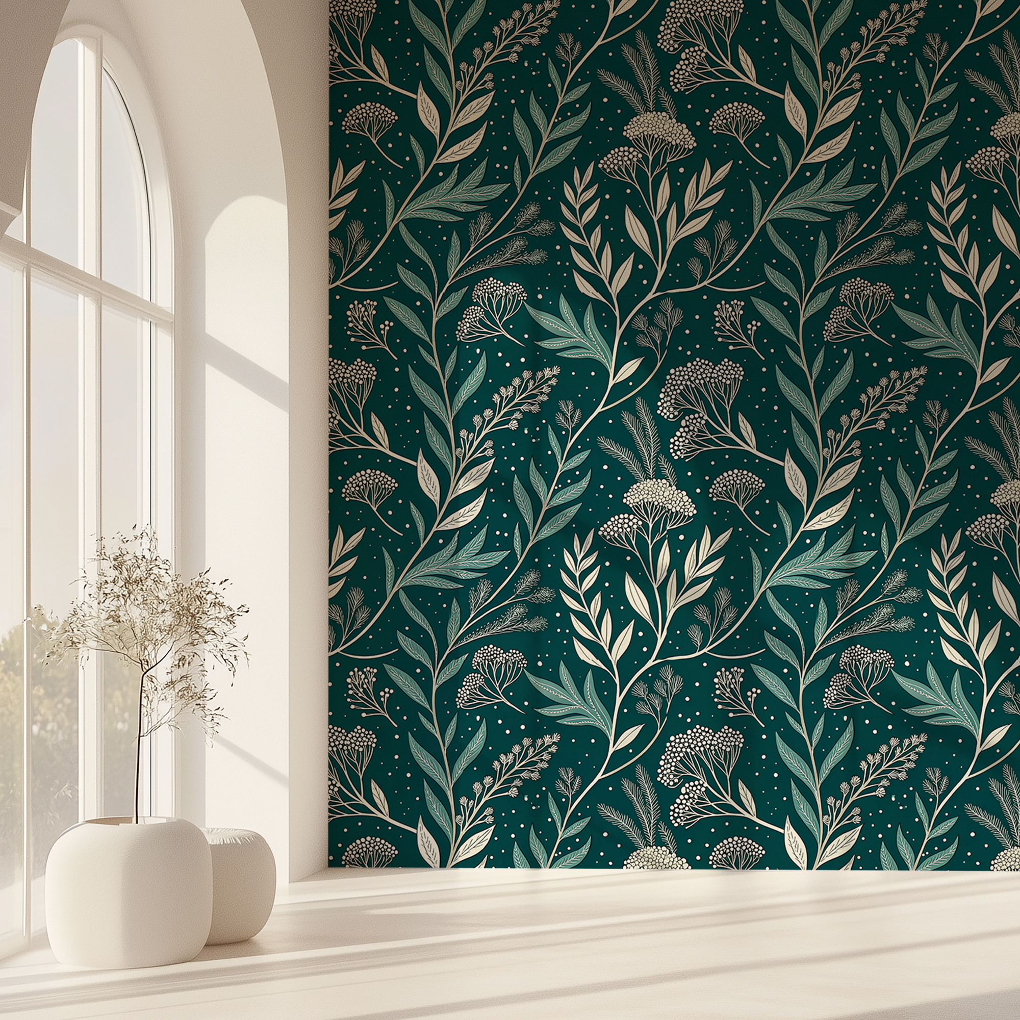 This design captures the harmony between modern minimalism and vintage botanical art, creating a luxurious statement wall that feels both bold and serene.