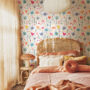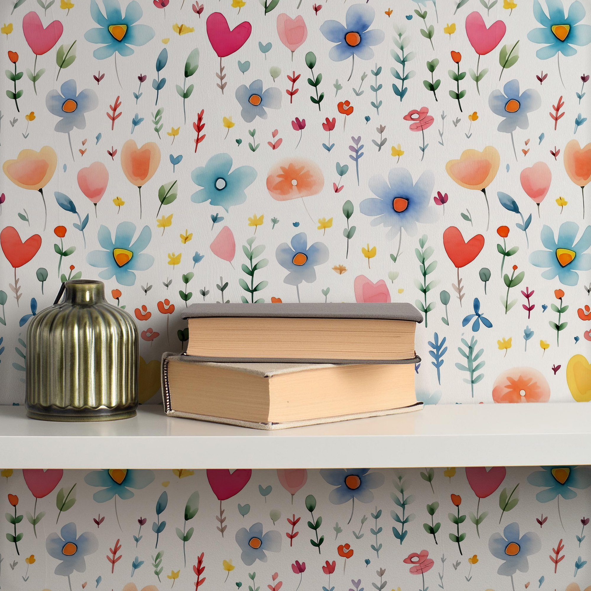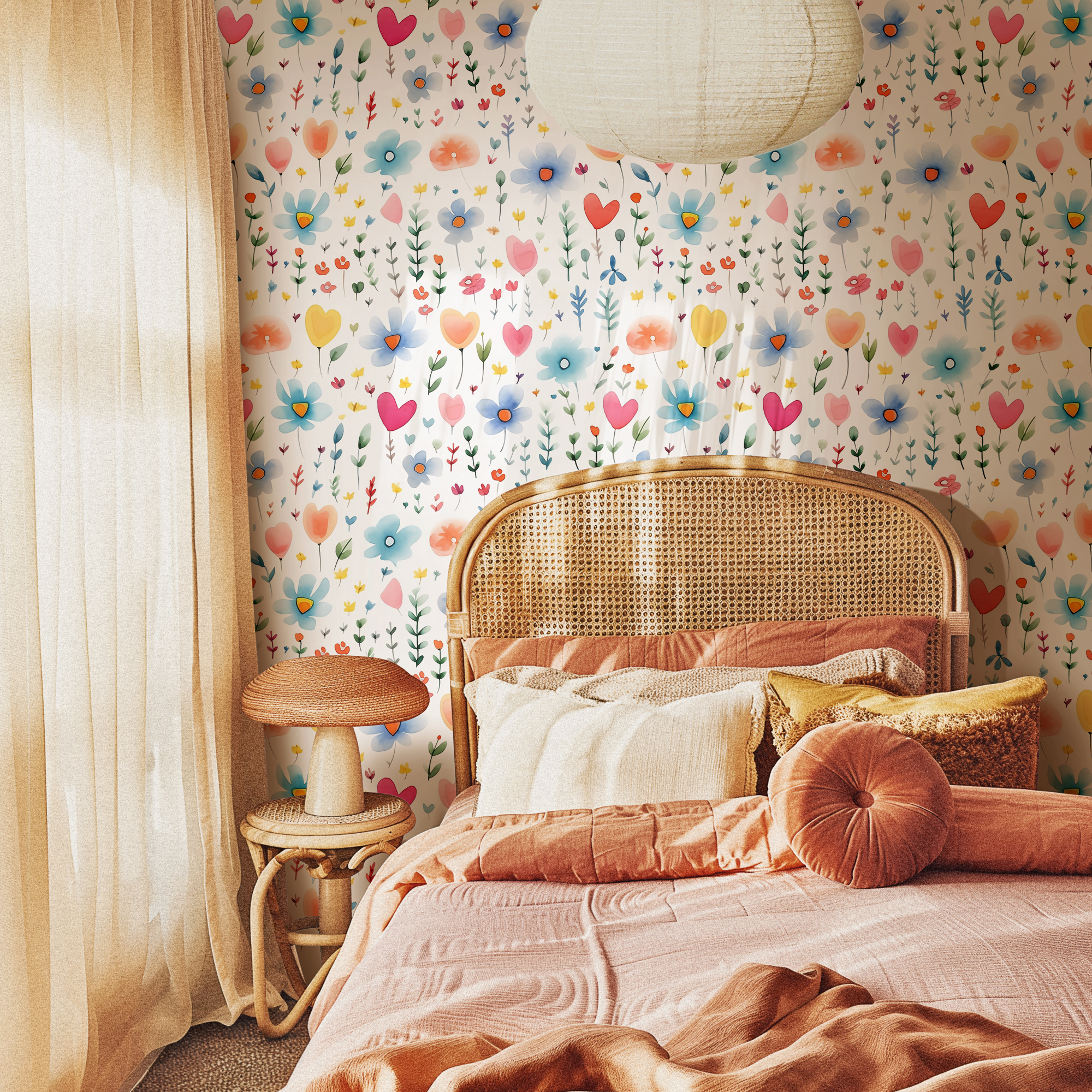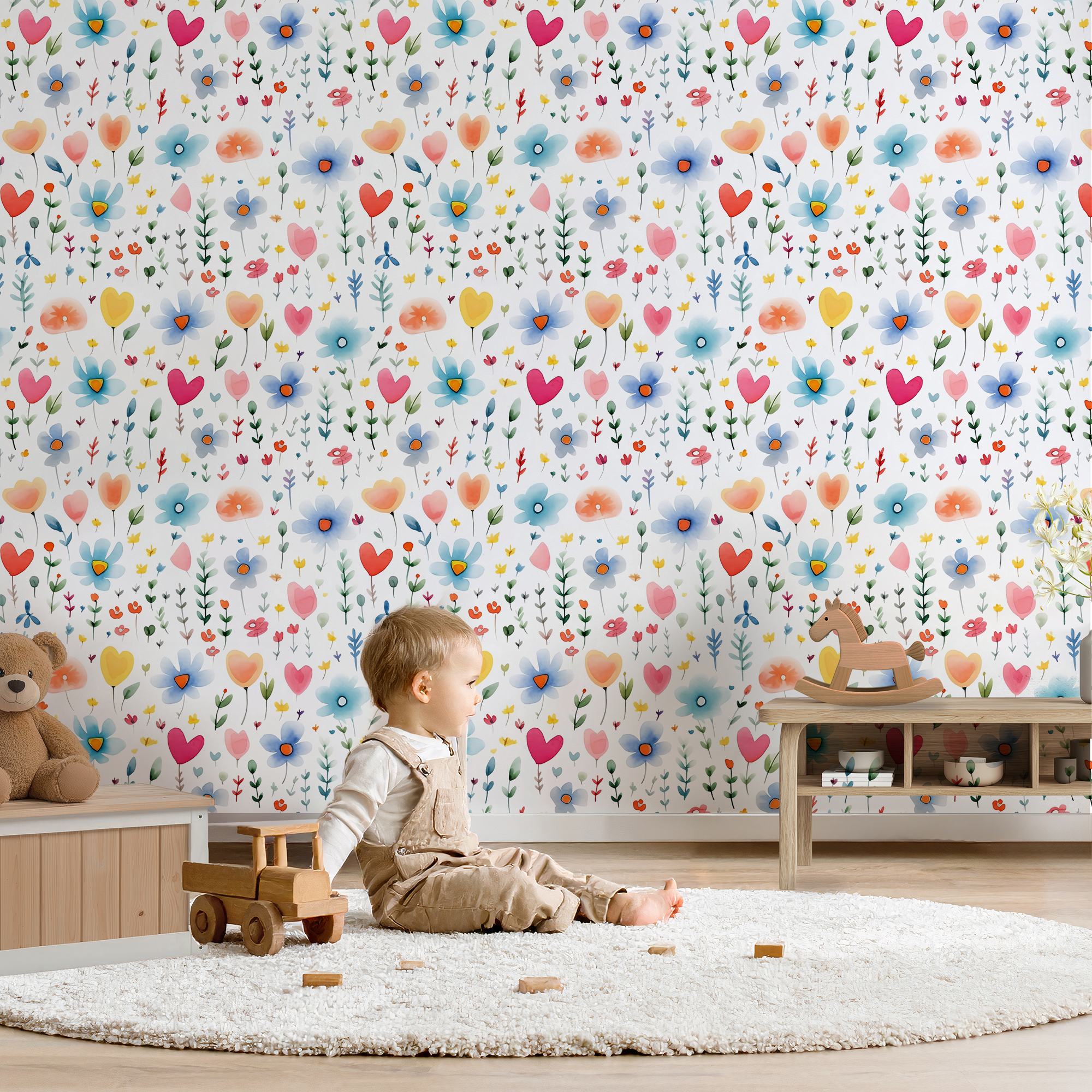 Brighten up your home with our Colorful Floral Wallpaper, featuring hand-painted flowers and hearts in vibrant watercolor shades of blue, pink, red, orange, and yellow. This playful design brings a cheerful and artistic vibe, making any space feel fun and inviting.