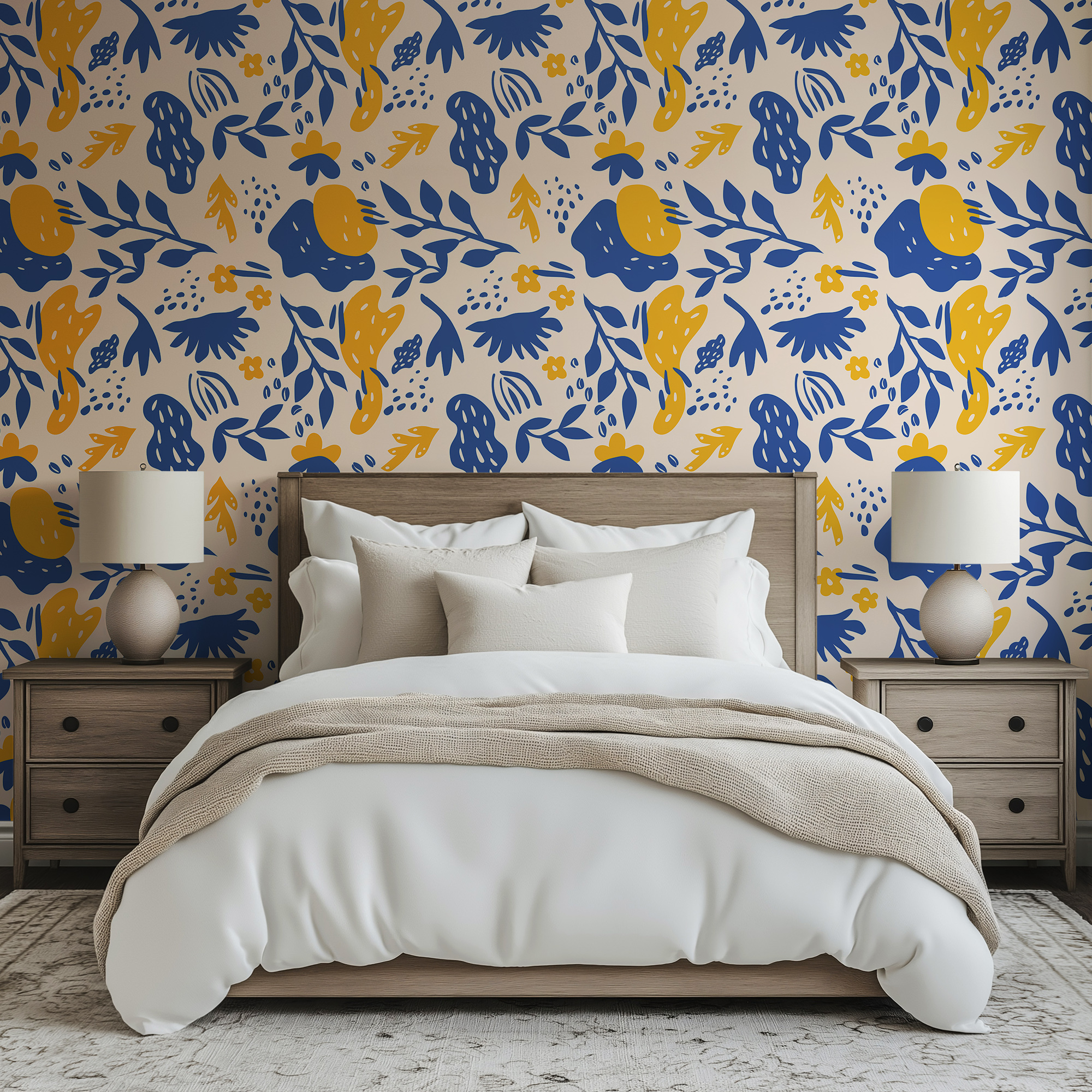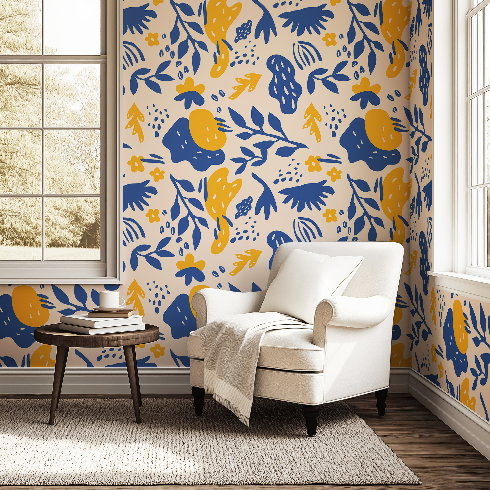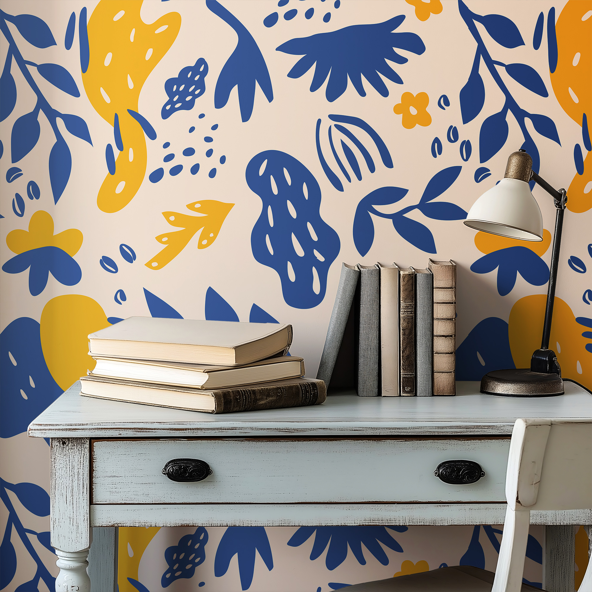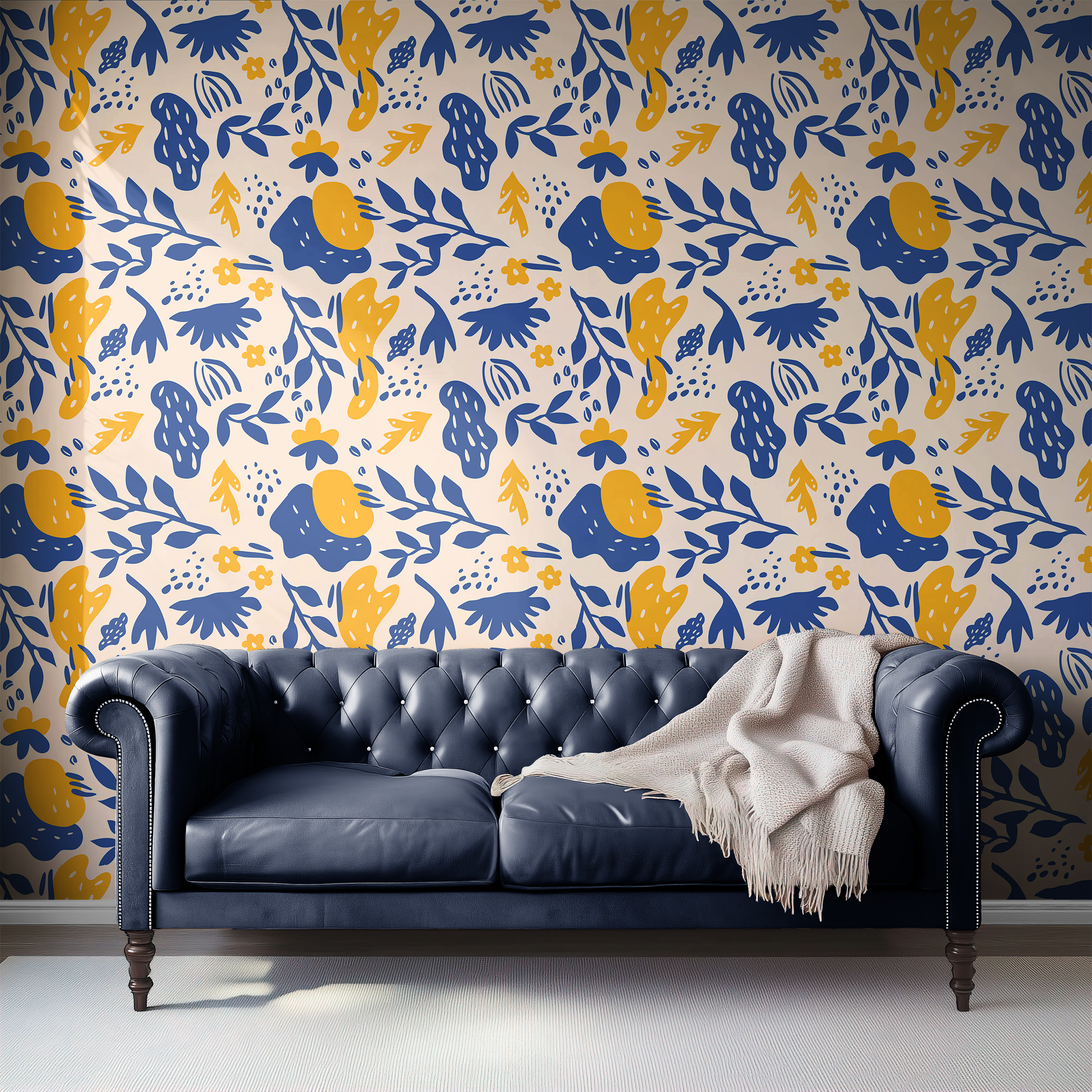 Energize your space with our Modern Abstract Wallpaper, featuring bold botanical silhouettes, organic shapes, and playful details in striking navy blue and mustard yellow on a warm cream background.