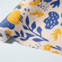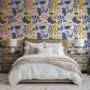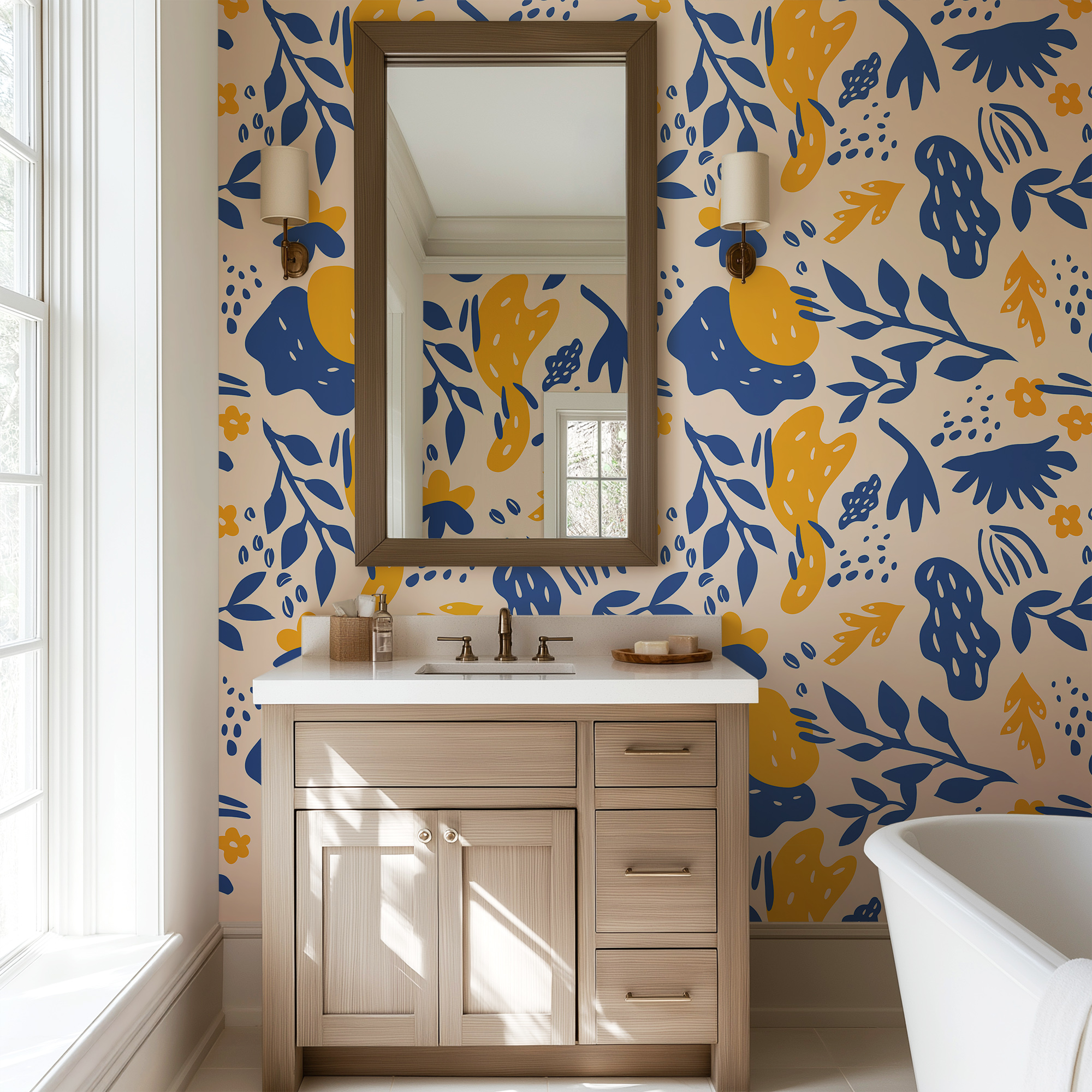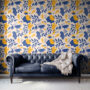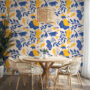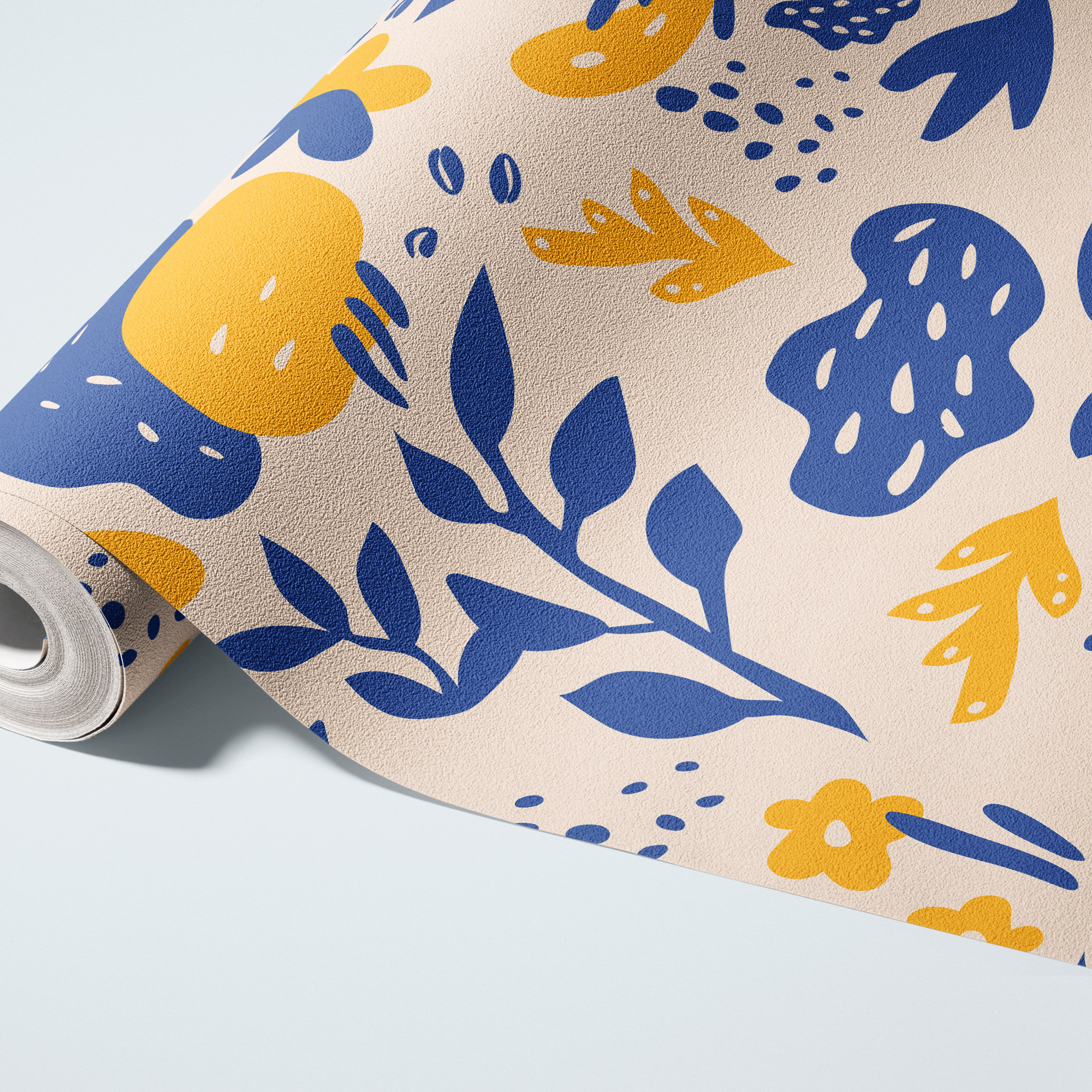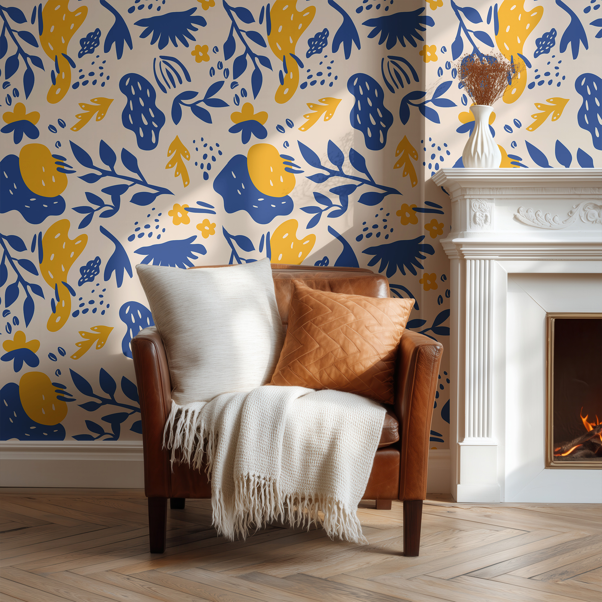 Energize your space with our Modern Abstract Wallpaper, featuring bold botanical silhouettes, organic shapes, and playful details in striking navy blue and mustard yellow on a warm cream background.