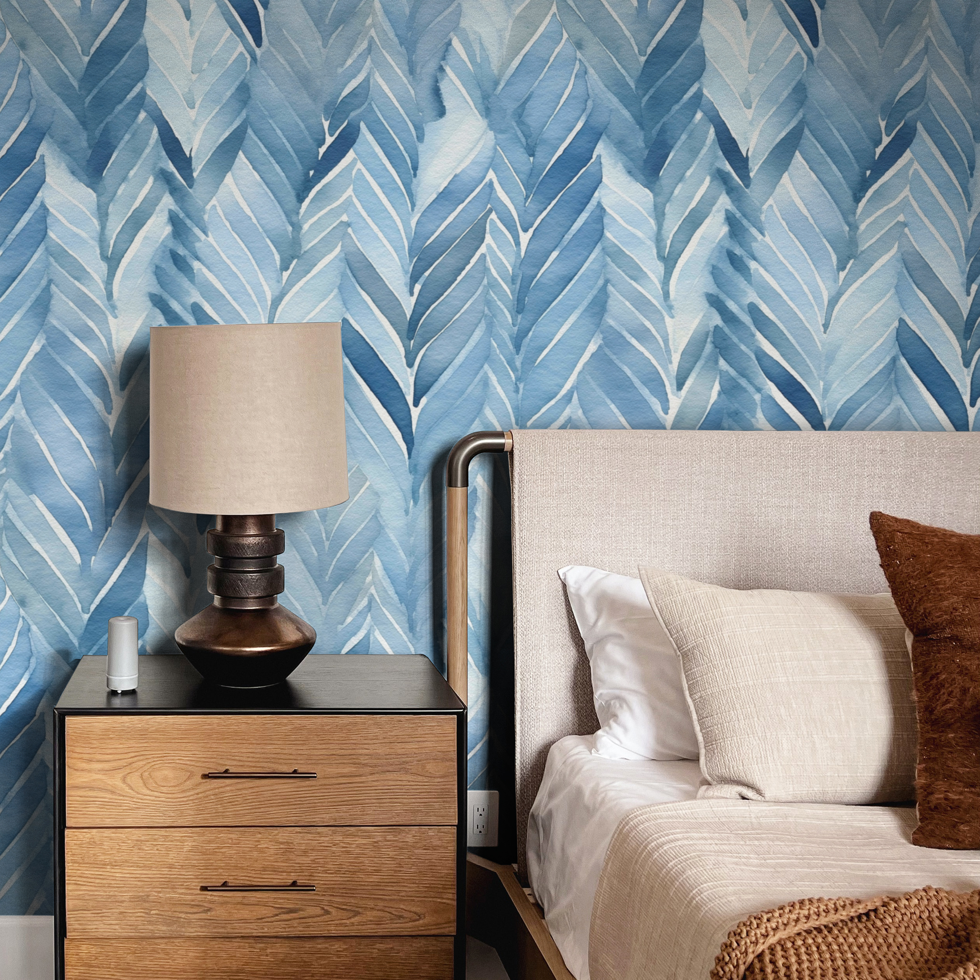 Add a refreshing modern touch to your home with our Blue Watercolor Herringbone Wallpaper, featuring bold brushstroke patterns in layered shades of sky, denim, and deep ocean blue.