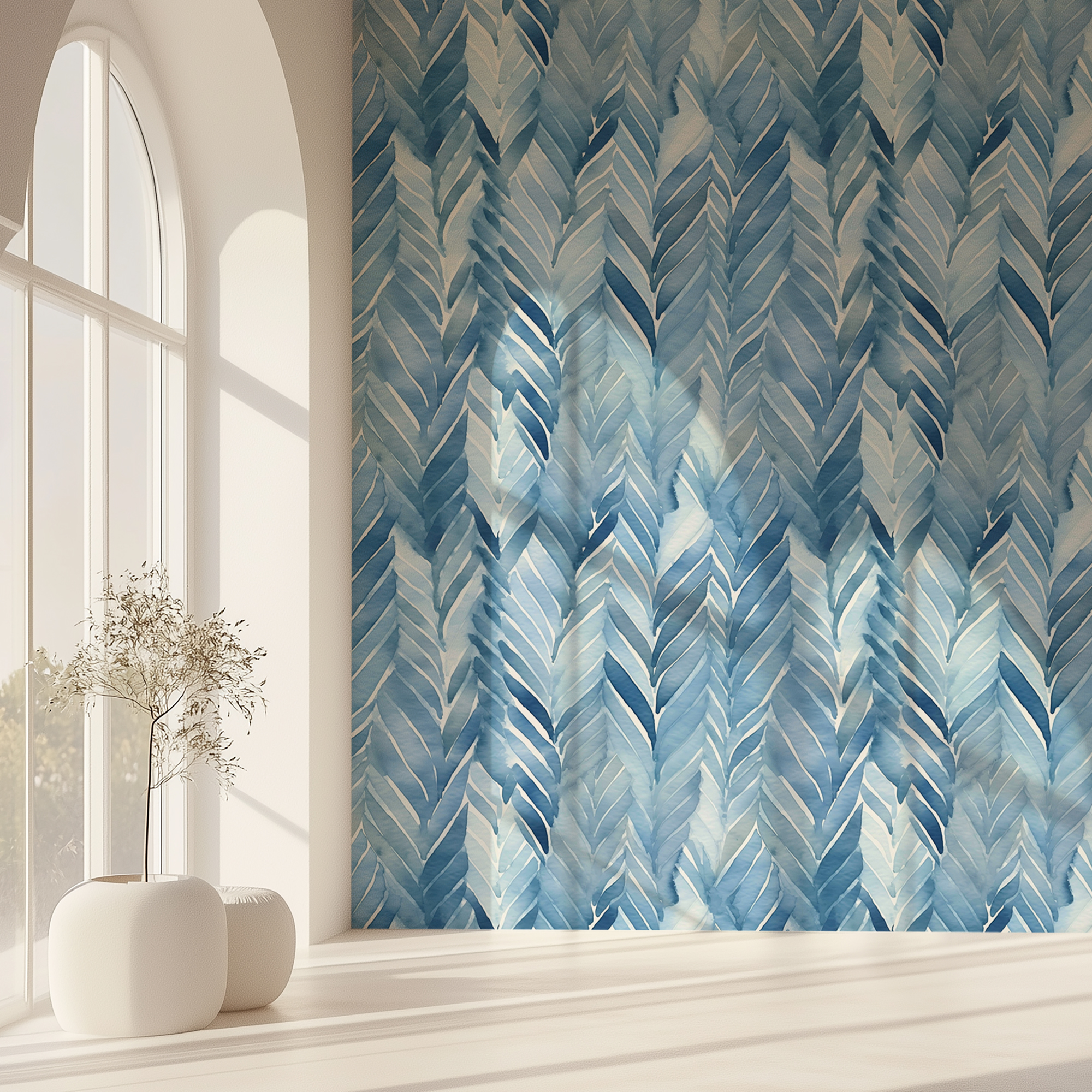 This dynamic design blends the structure of herringbone geometry with the softness of watercolor texture, creating a look that’s both artistic and contemporary.