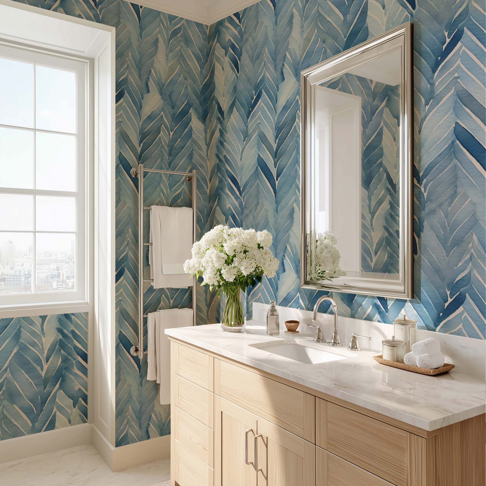 Perfect for living rooms, offices, or creative studios, this wallpaper instantly brightens up any space, evoking a coastal, airy vibe with a sophisticated modern twist. It pairs beautifully with natural wood, white decor, and minimalist interiors.