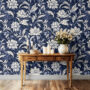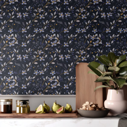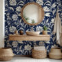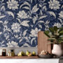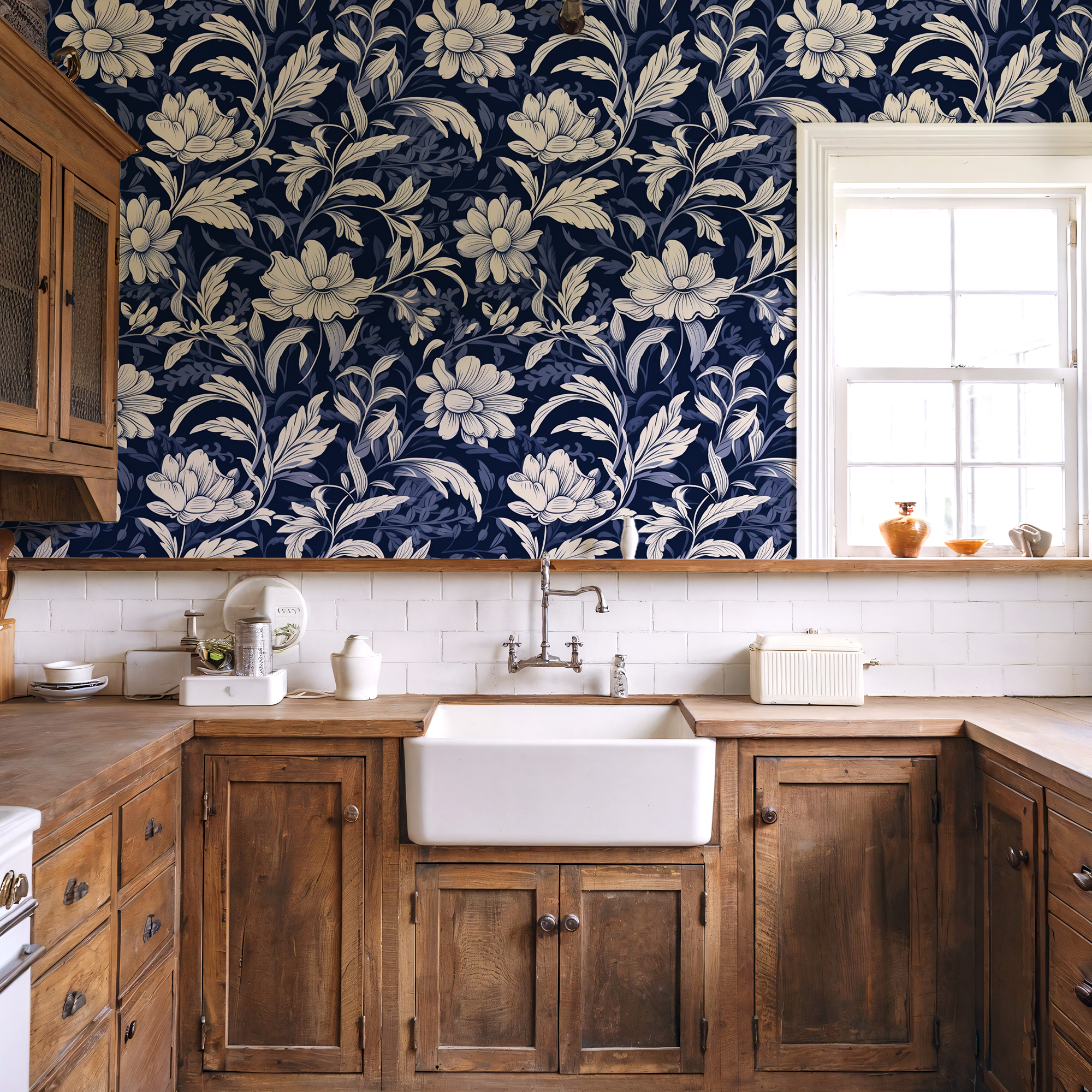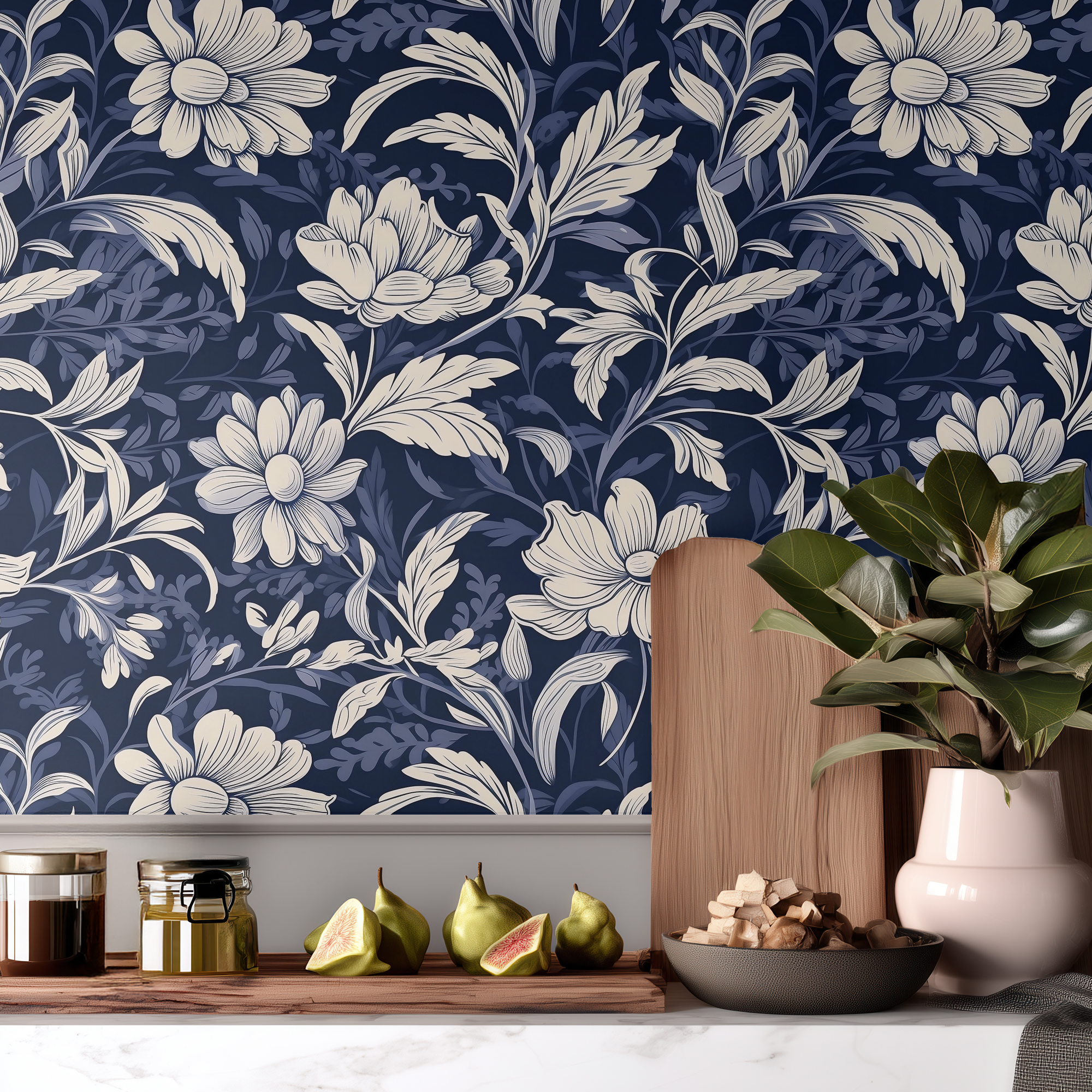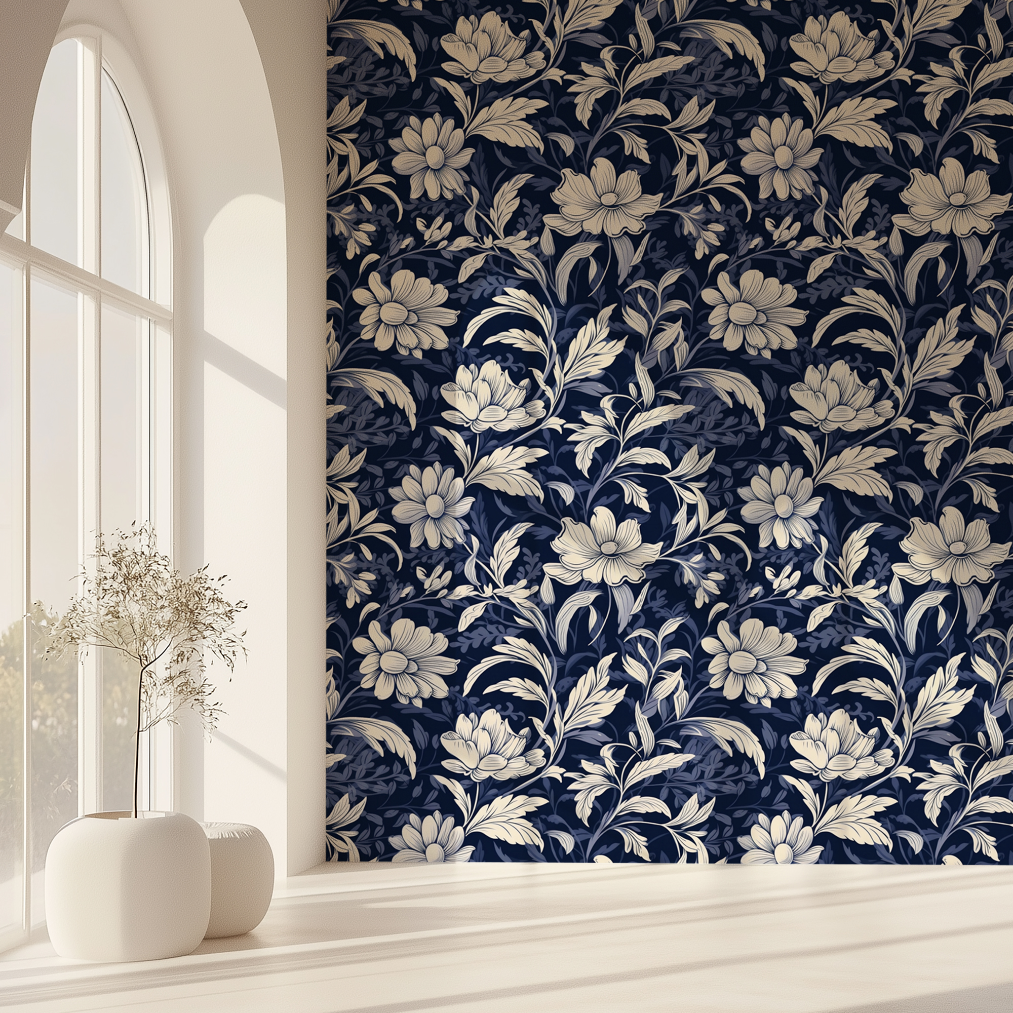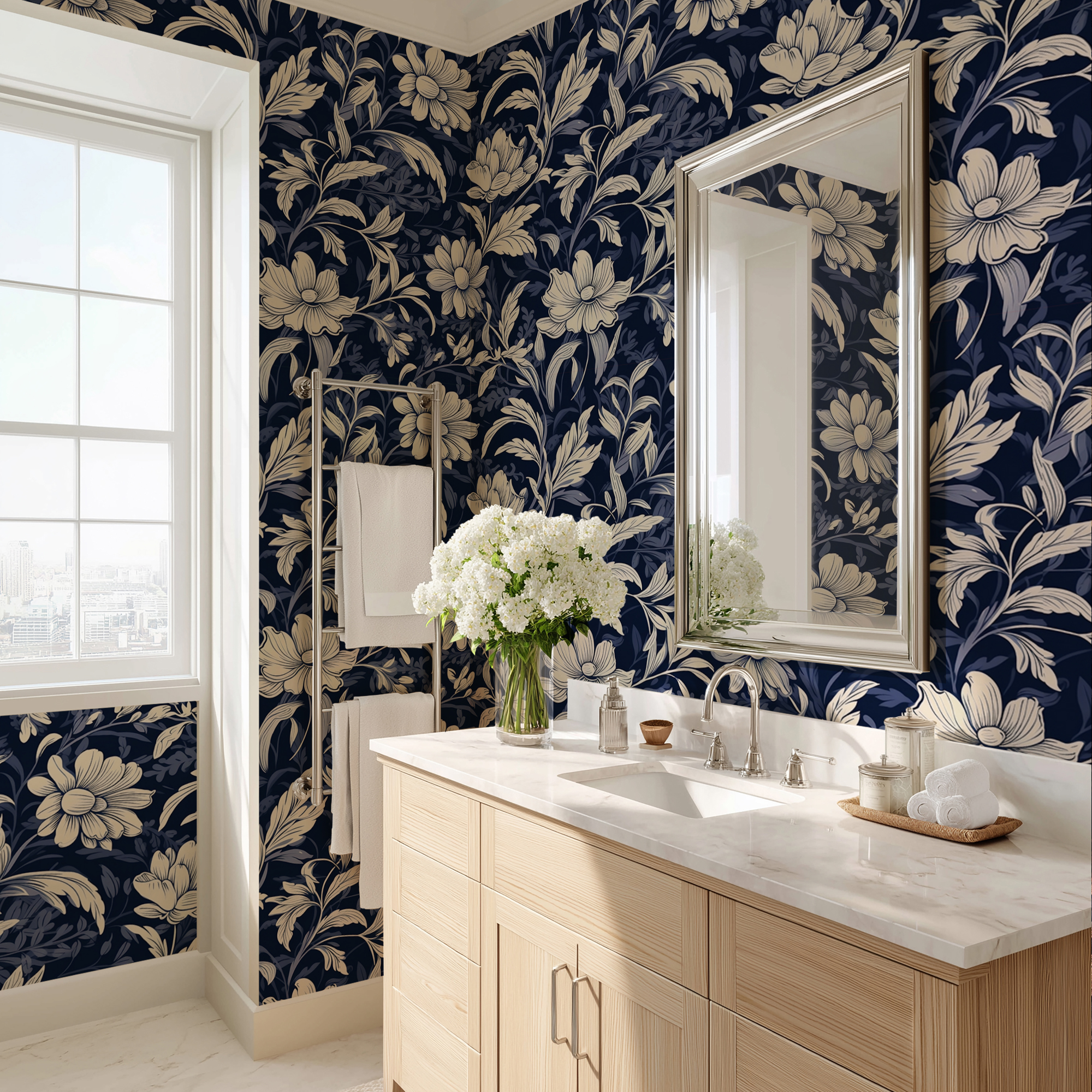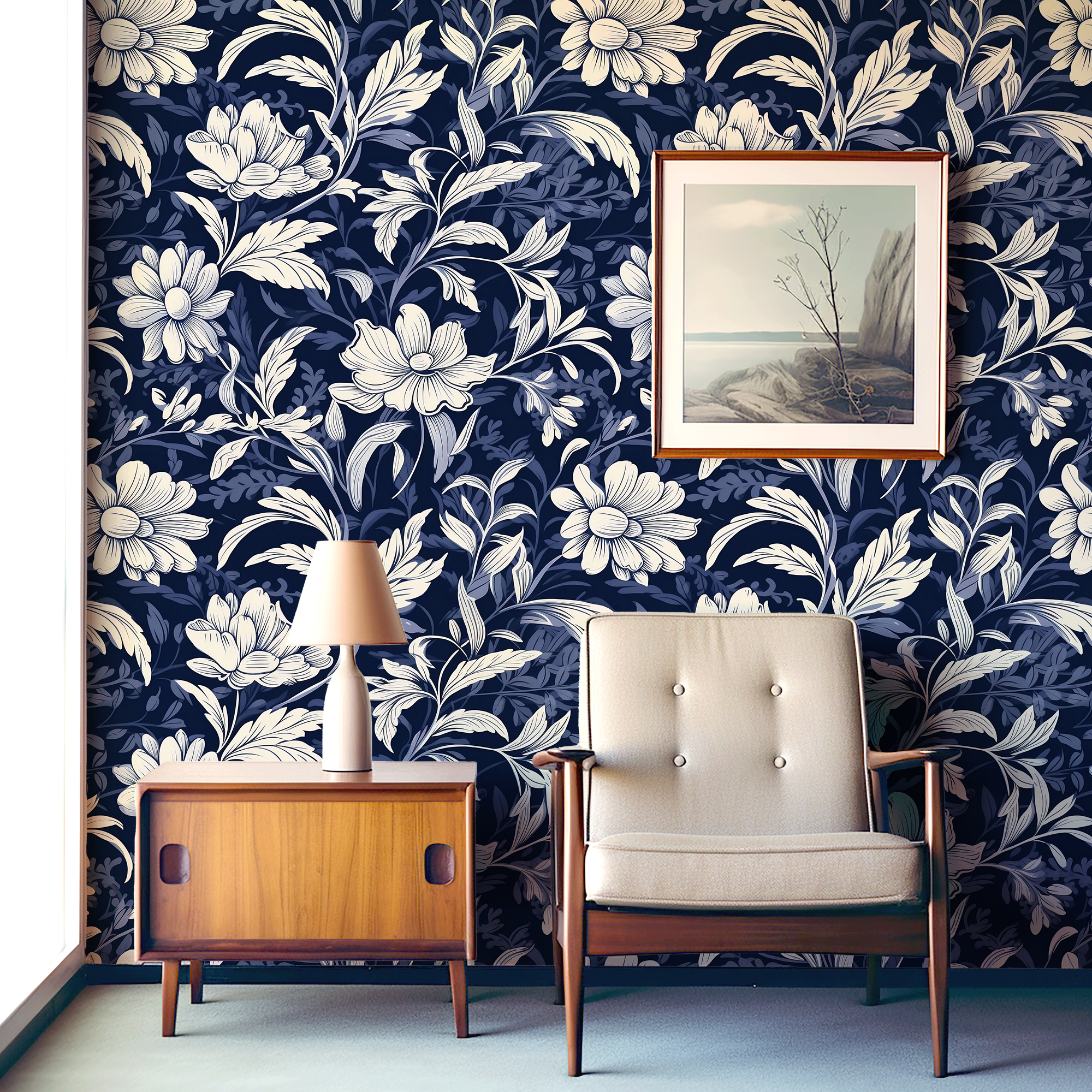 Elevate your walls with our Navy Blue Floral Wallpaper, featuring oversized blossoms and flowing leaves in soft neutral tones set against a deep navy background. The bold contrast brings a timeless botanical elegance, making any space feel rich and inviting.