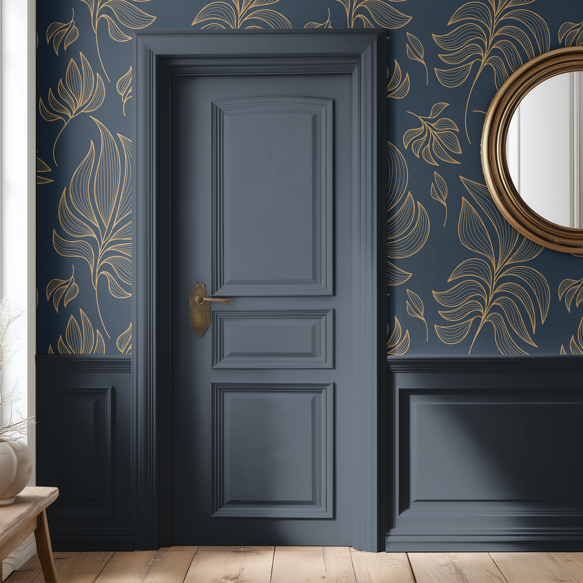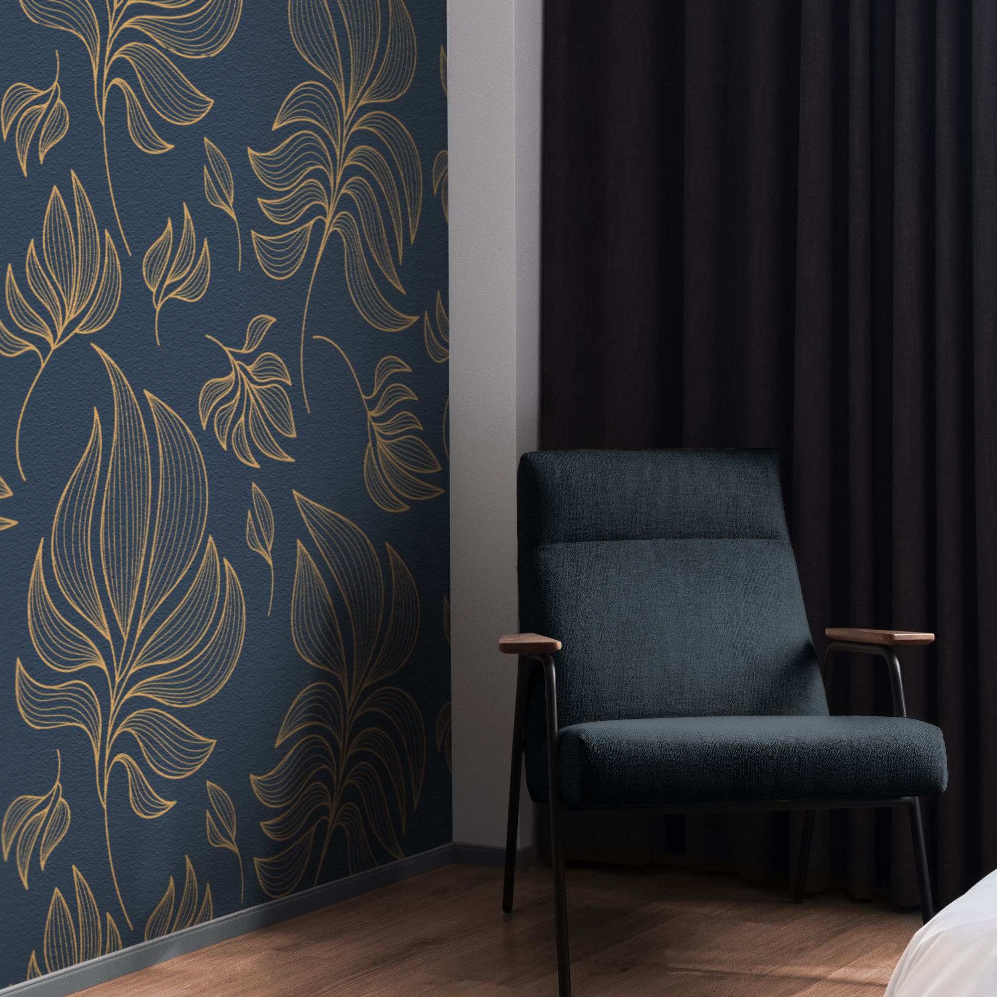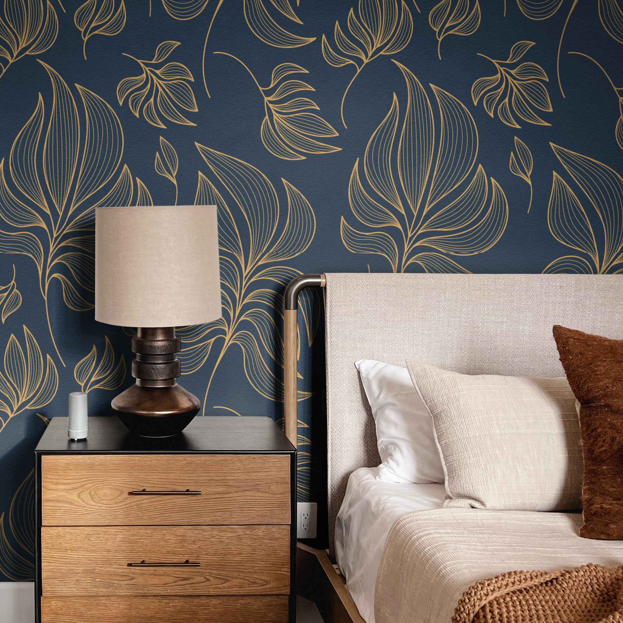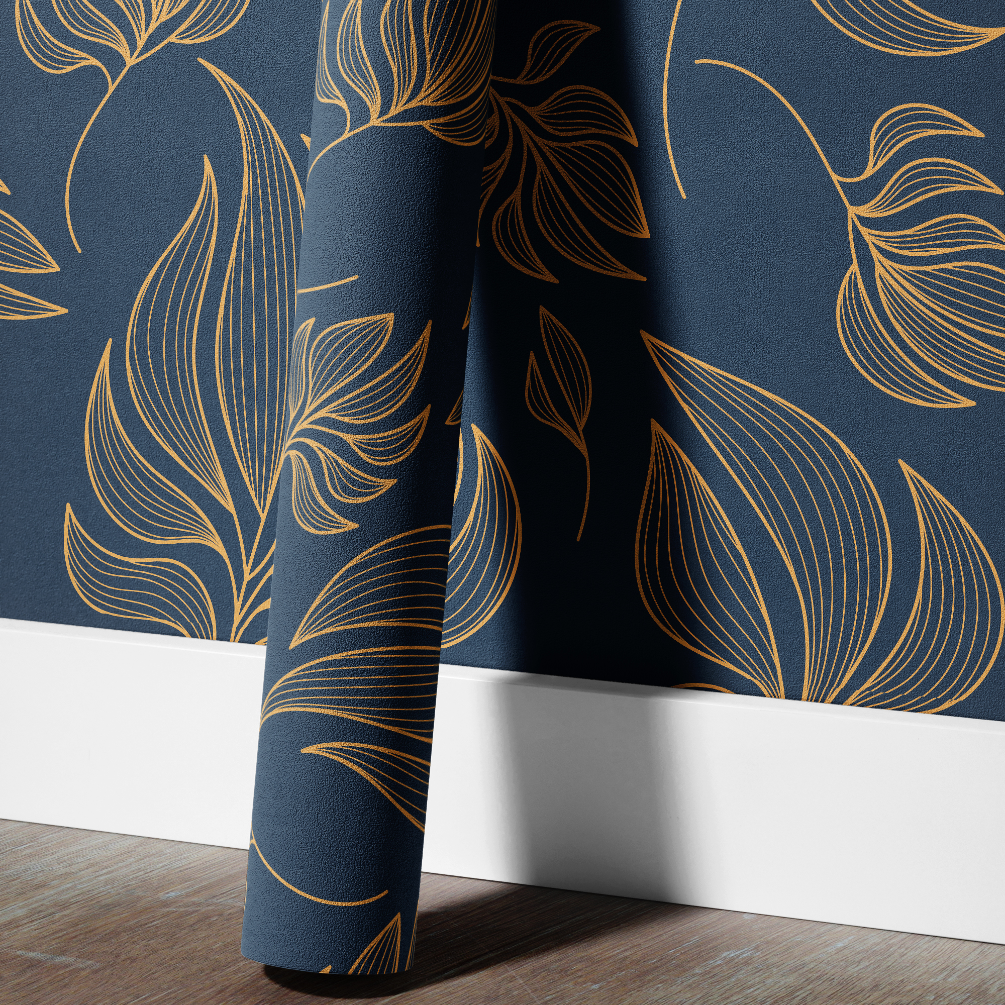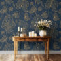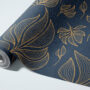 Elevate your space with our Blue and Gold Leaf Wallpaper, featuring flowing golden botanical outlines over a deep navy background.
