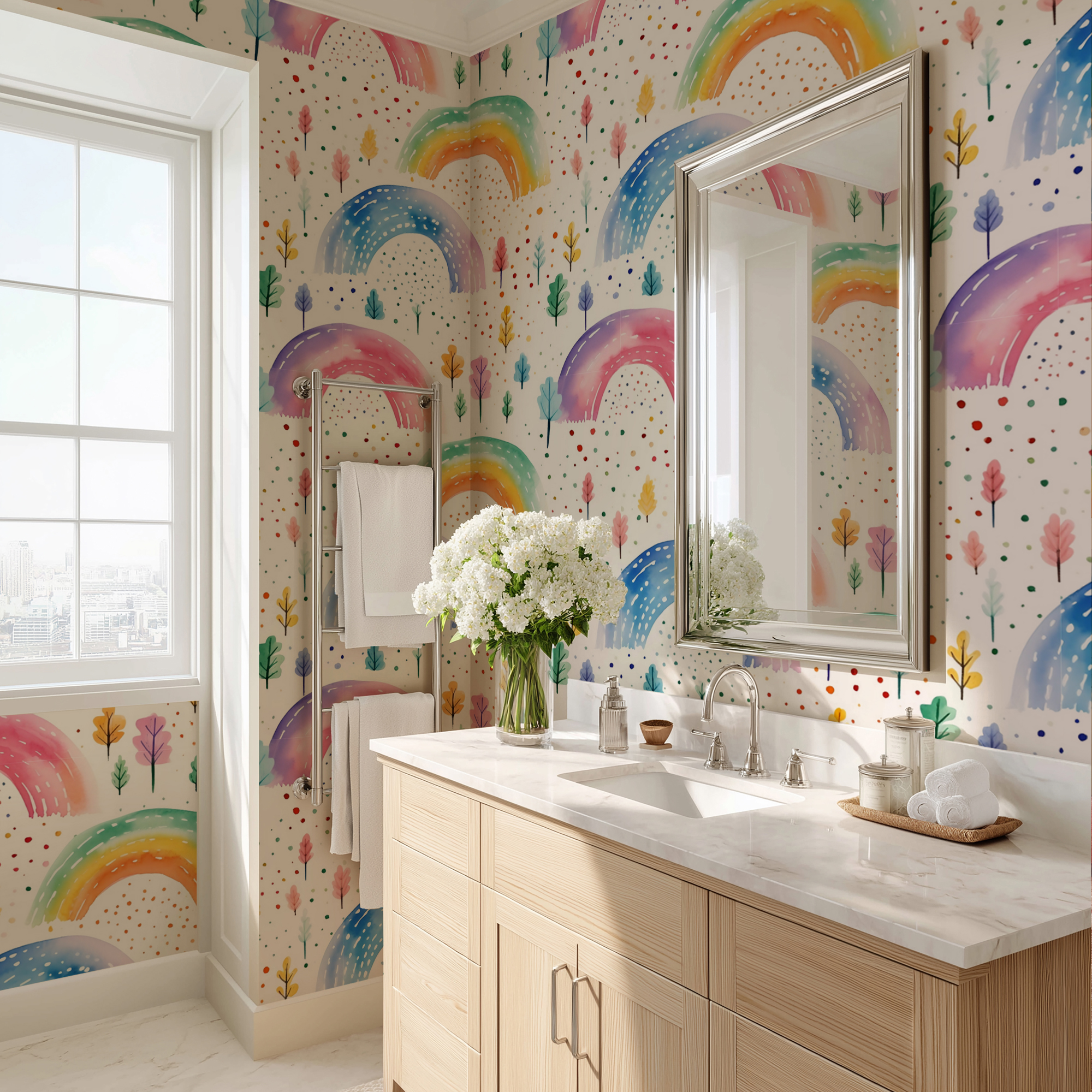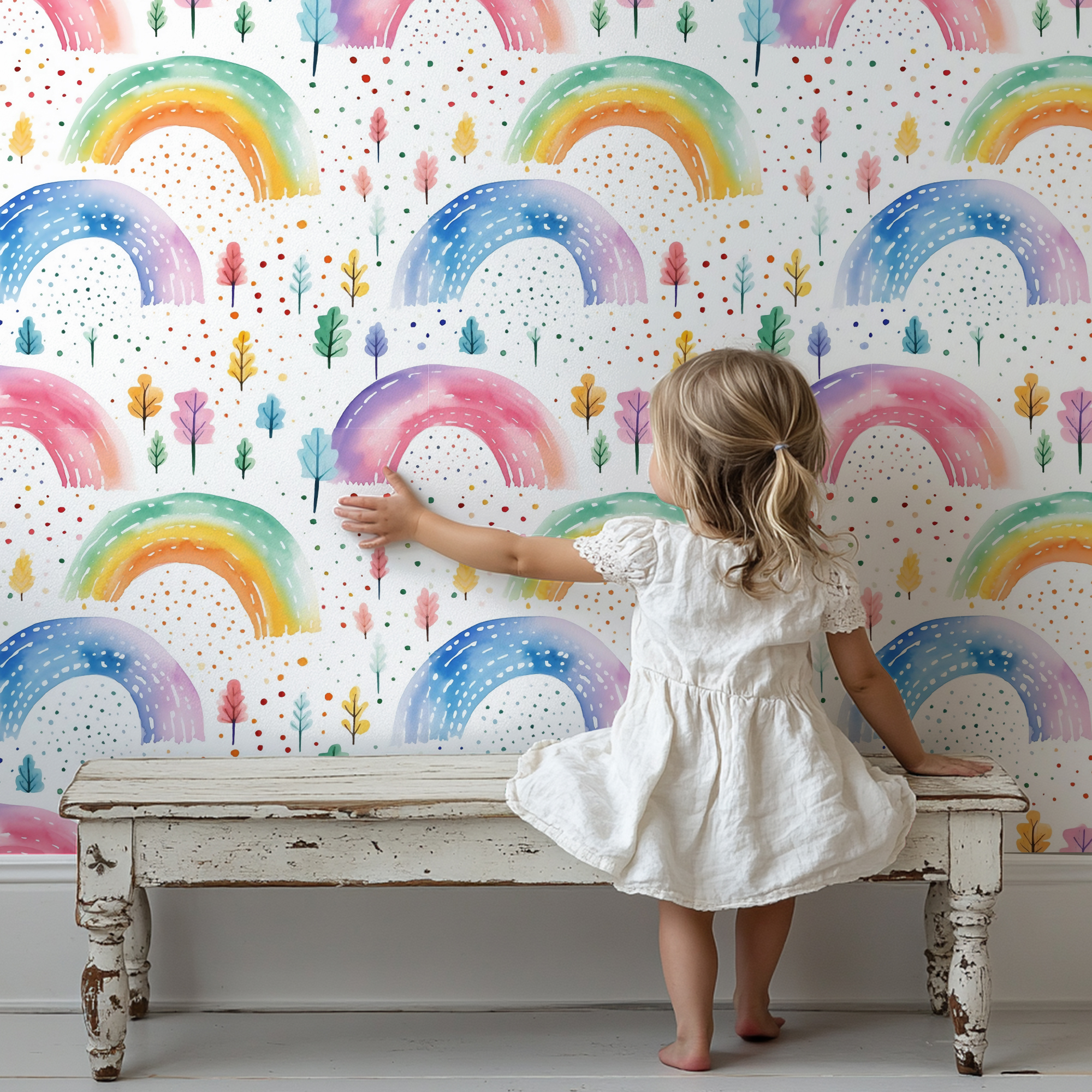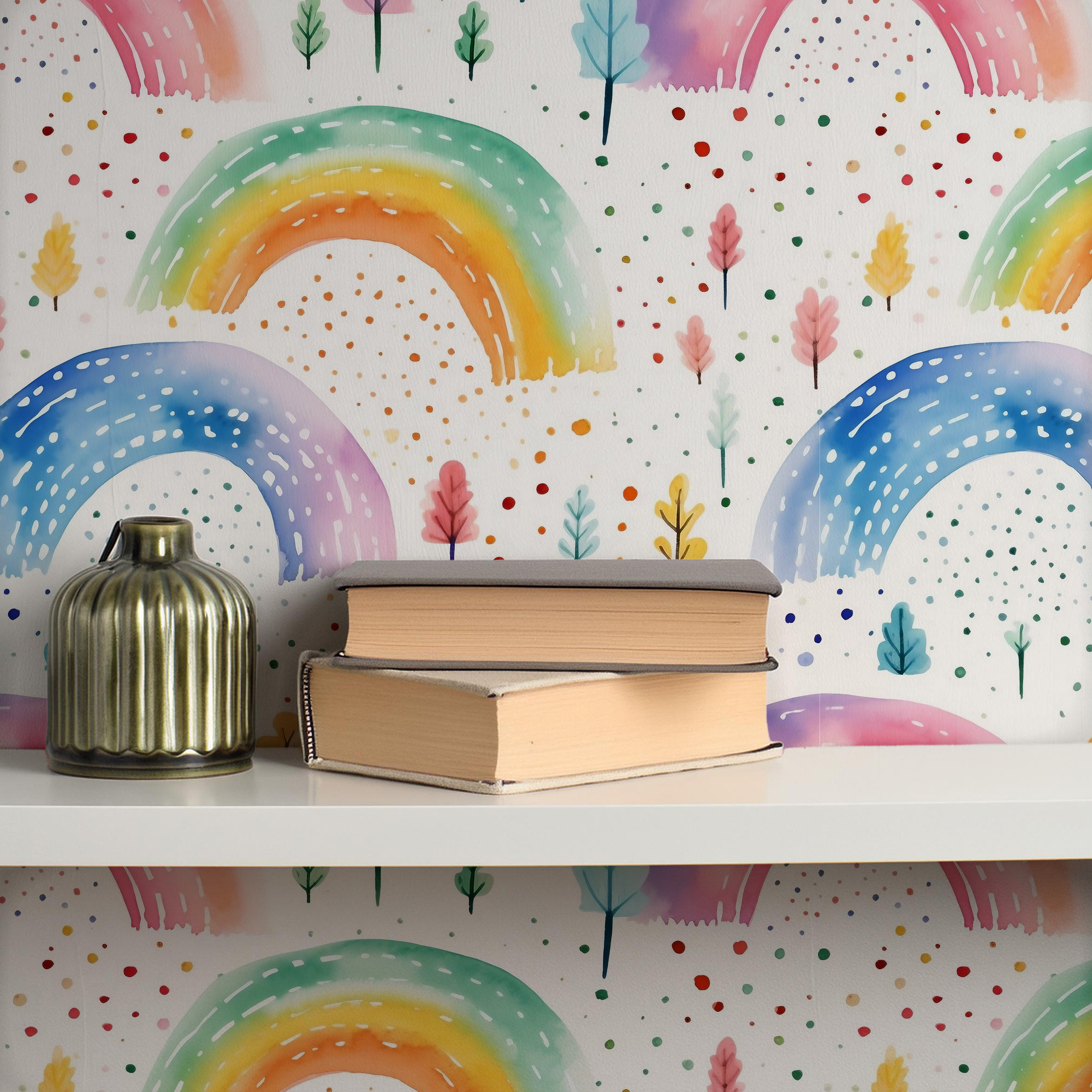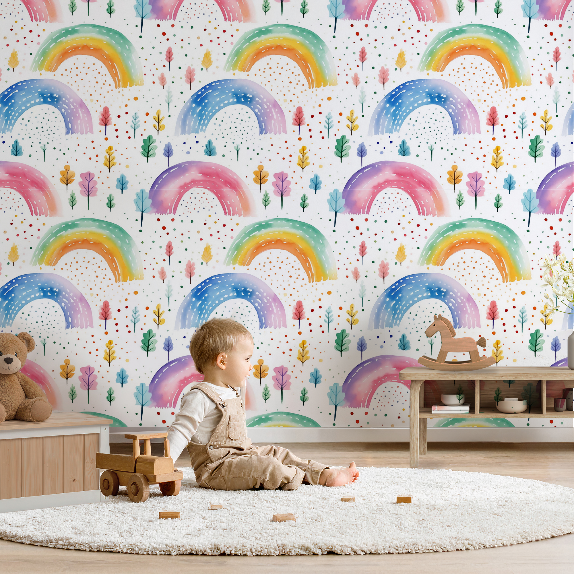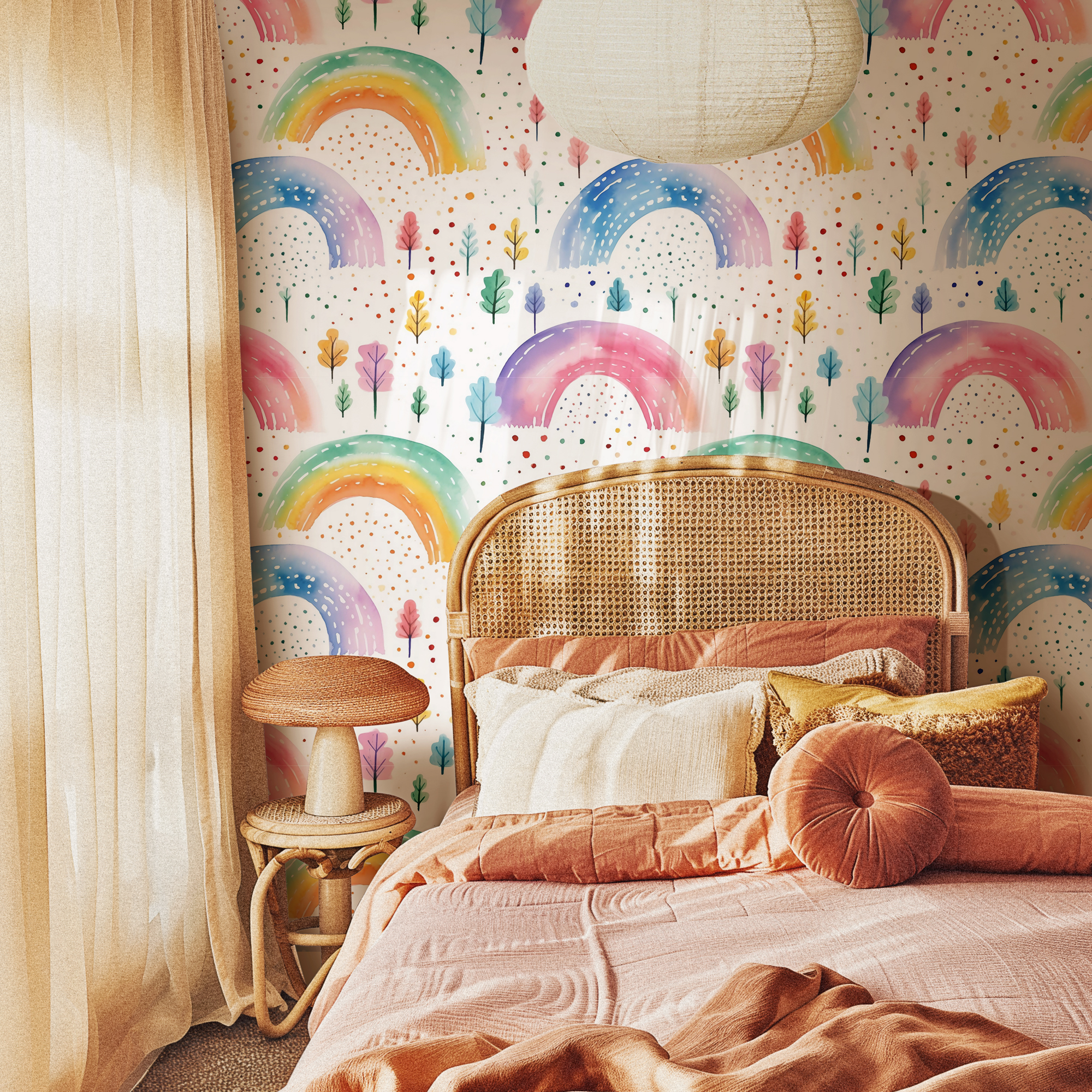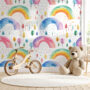 Brighten up your child’s space with our Rainbow Wallpaper, featuring hand-painted watercolor rainbows in soft pastel and vibrant hues. Accented with whimsical trees and colorful dotted details, this design creates a joyful and magical atmosphere that kids will love.