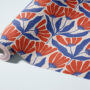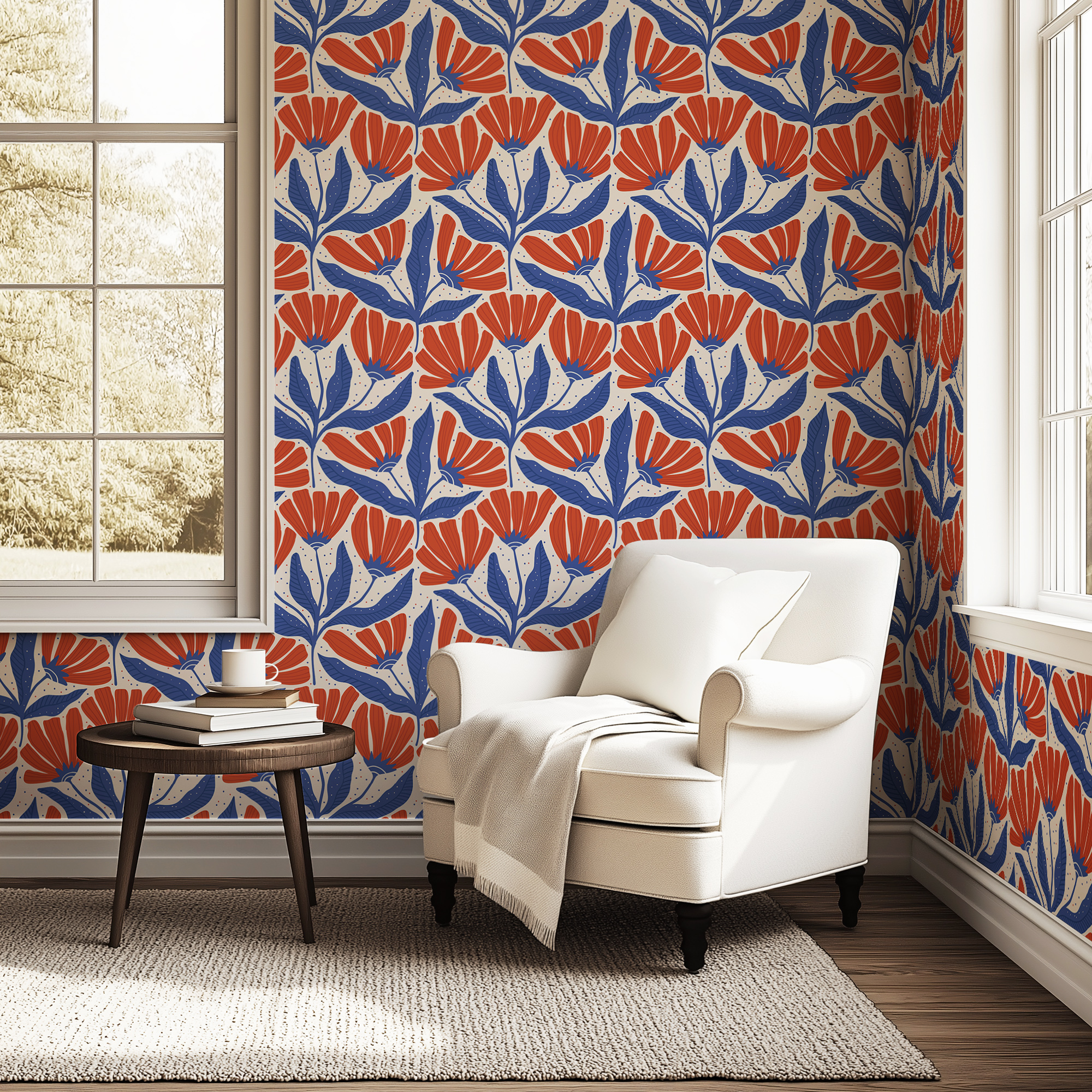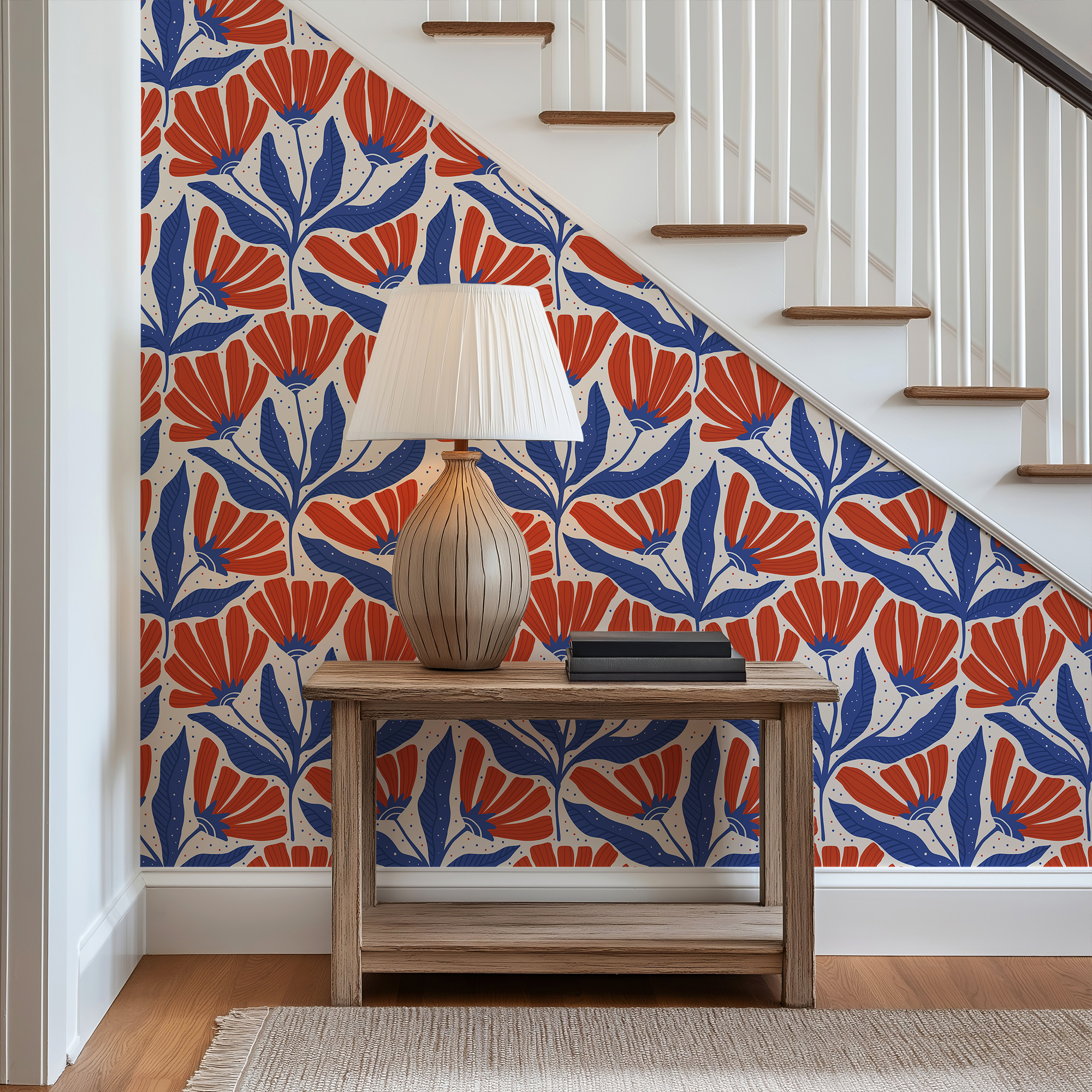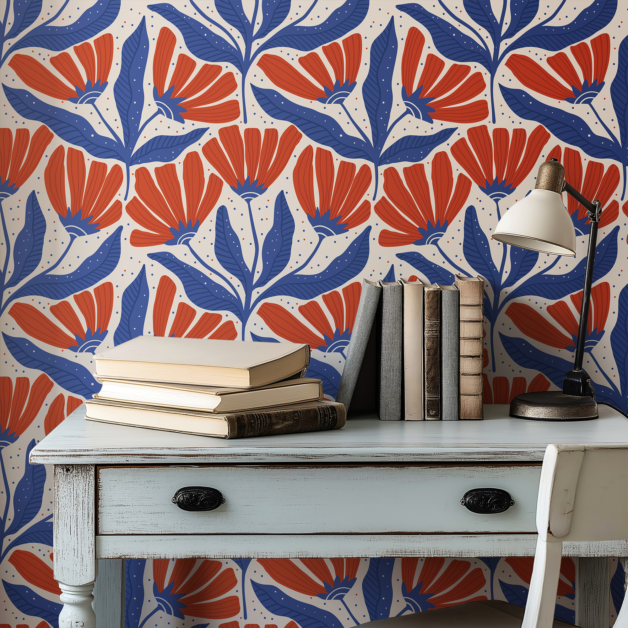 Make a bold statement with our Retro Folk Art Floral Wallpaper, featuring a striking geometric pattern of stylized navy blue leaves and vibrant burnt orange blooms against a soft cream background.