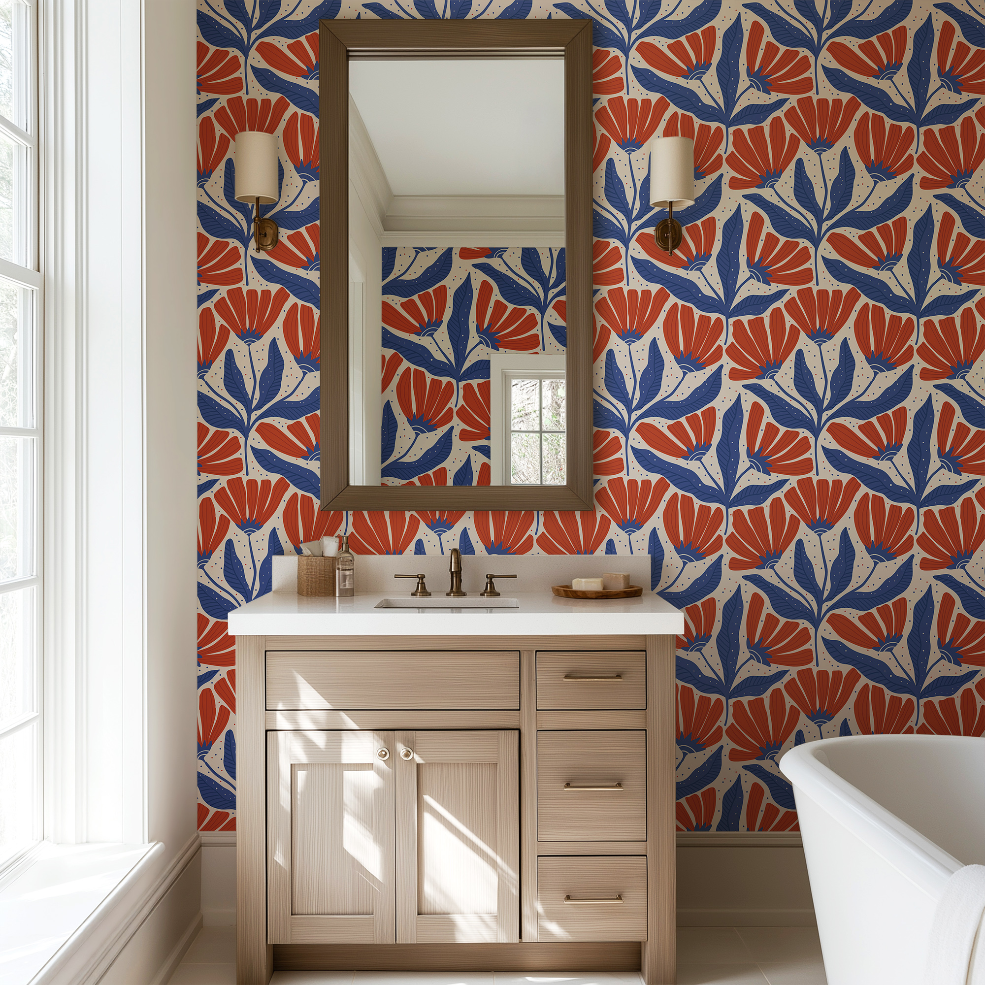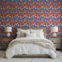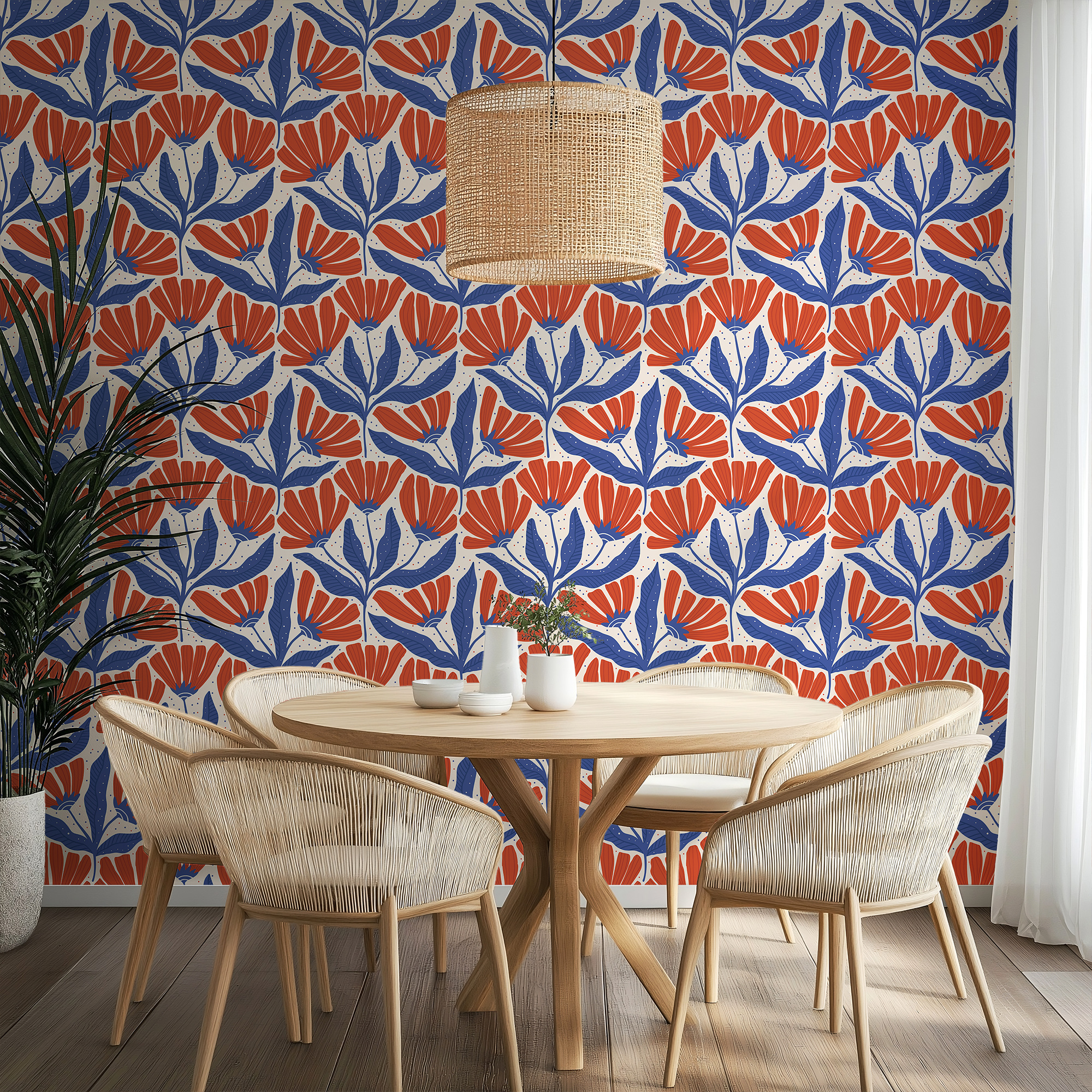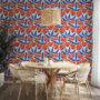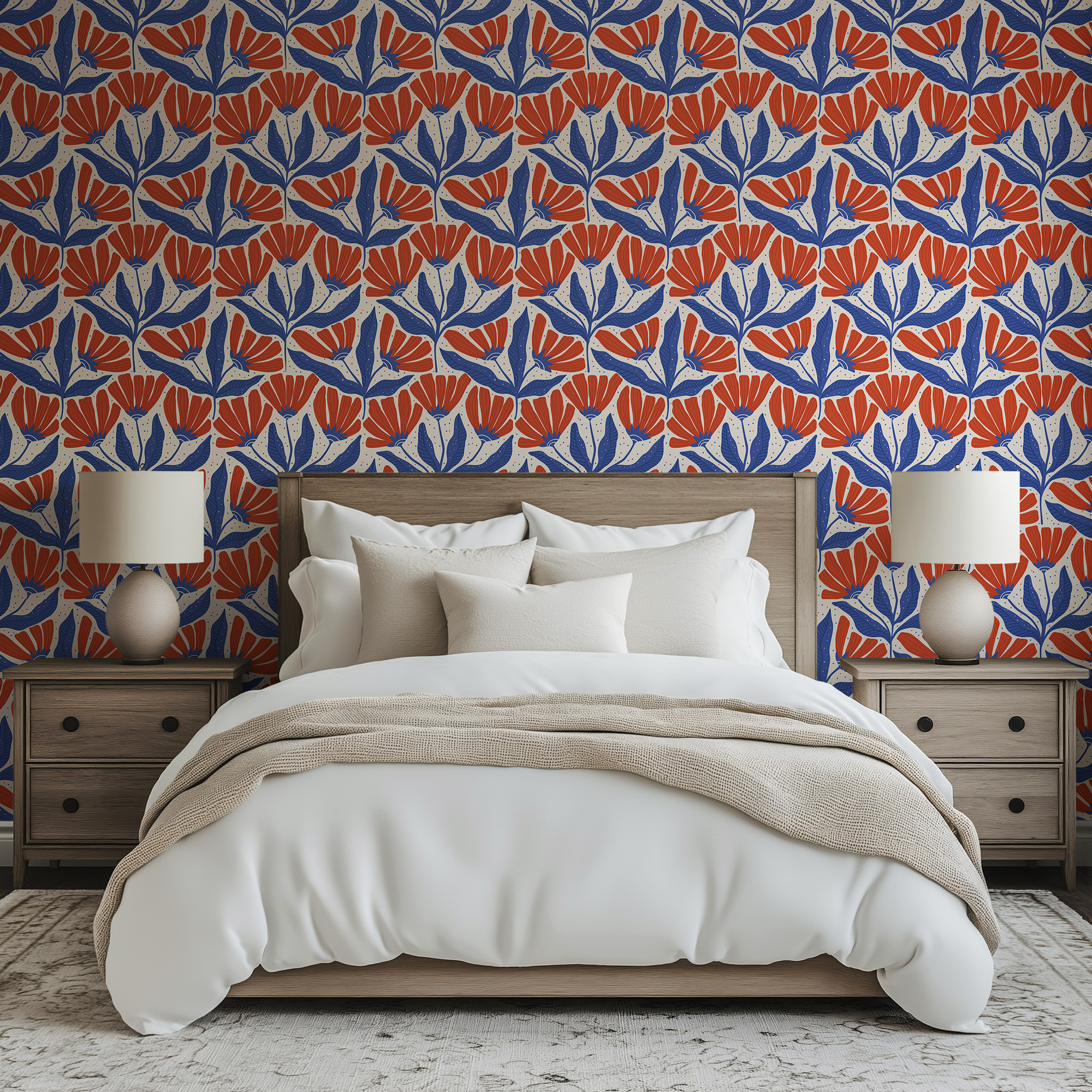 Make a bold statement with our Retro Folk Art Floral Wallpaper, featuring a striking geometric pattern of stylized navy blue leaves and vibrant burnt orange blooms against a soft cream background.