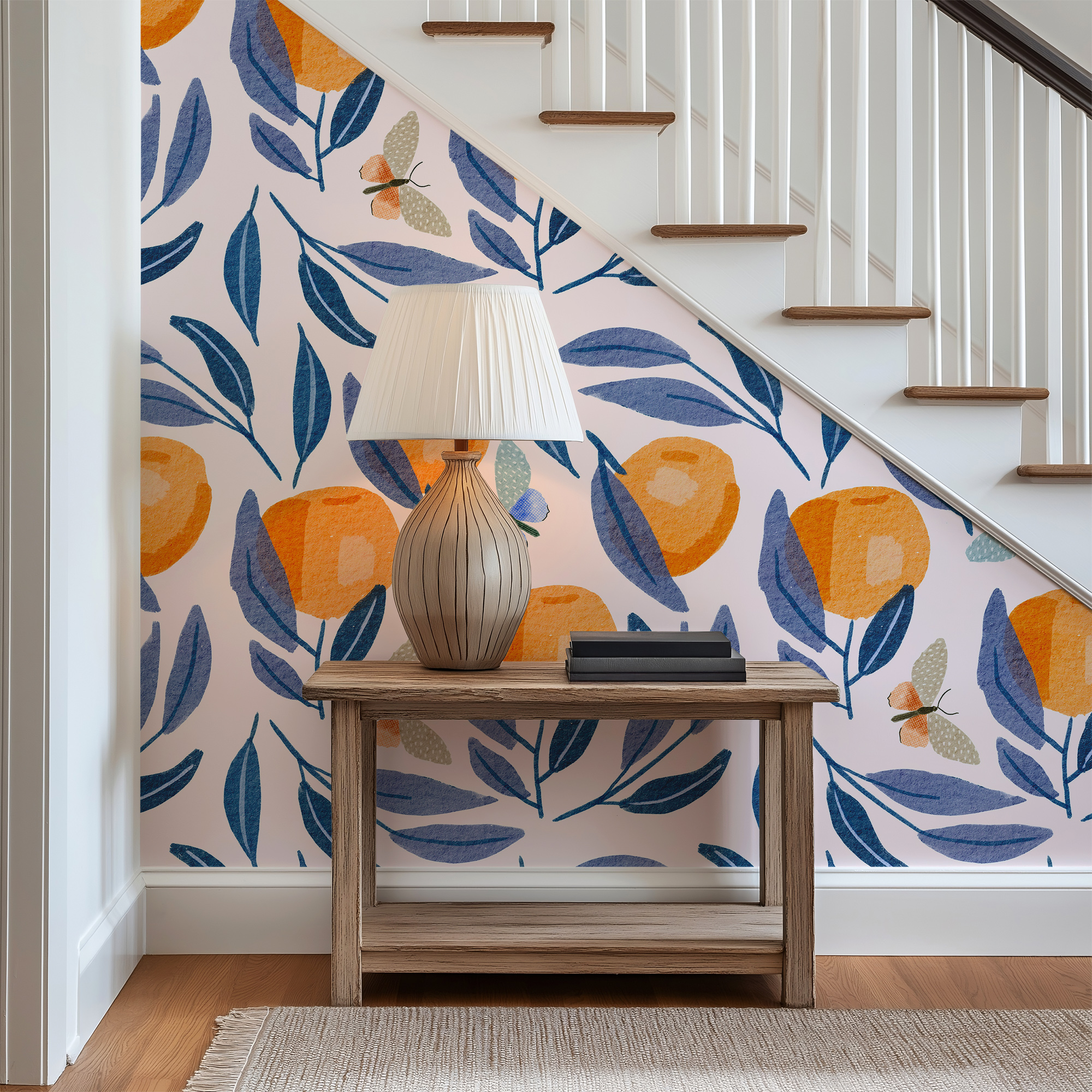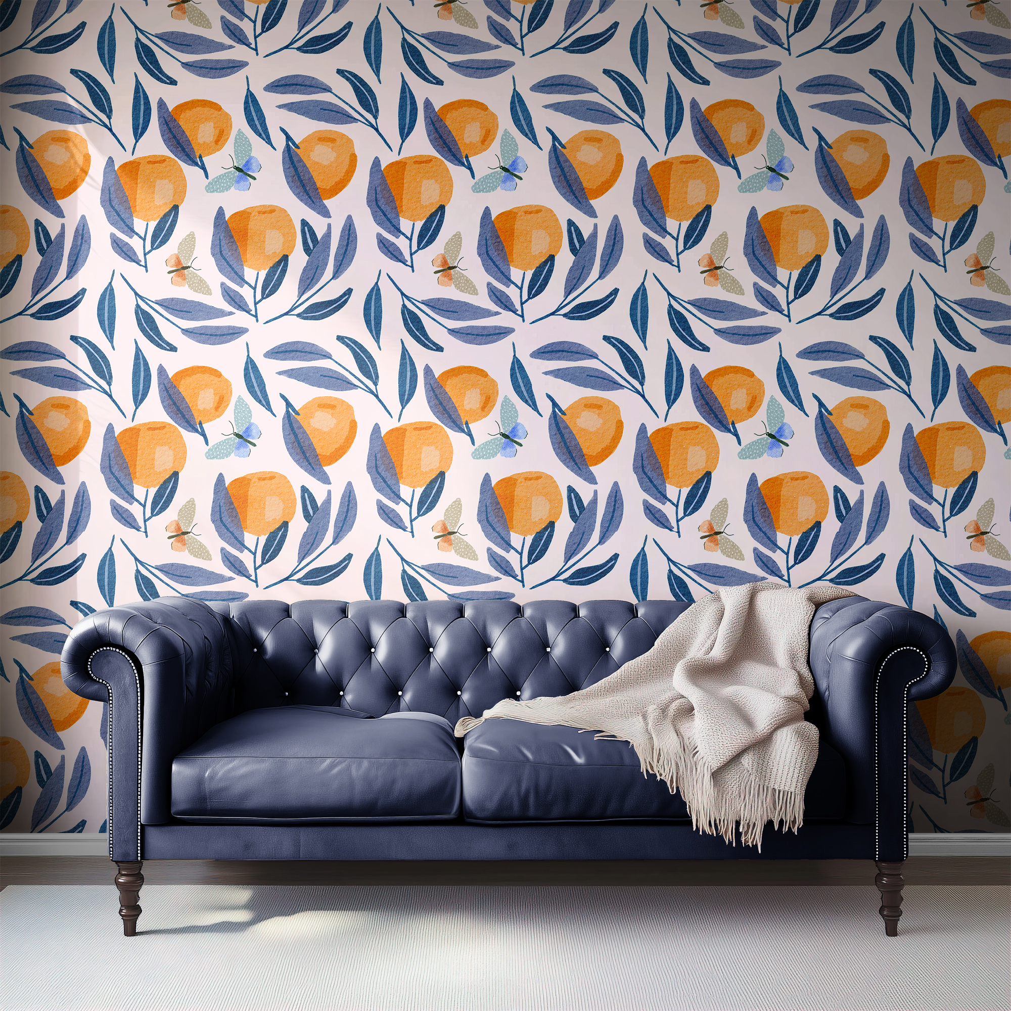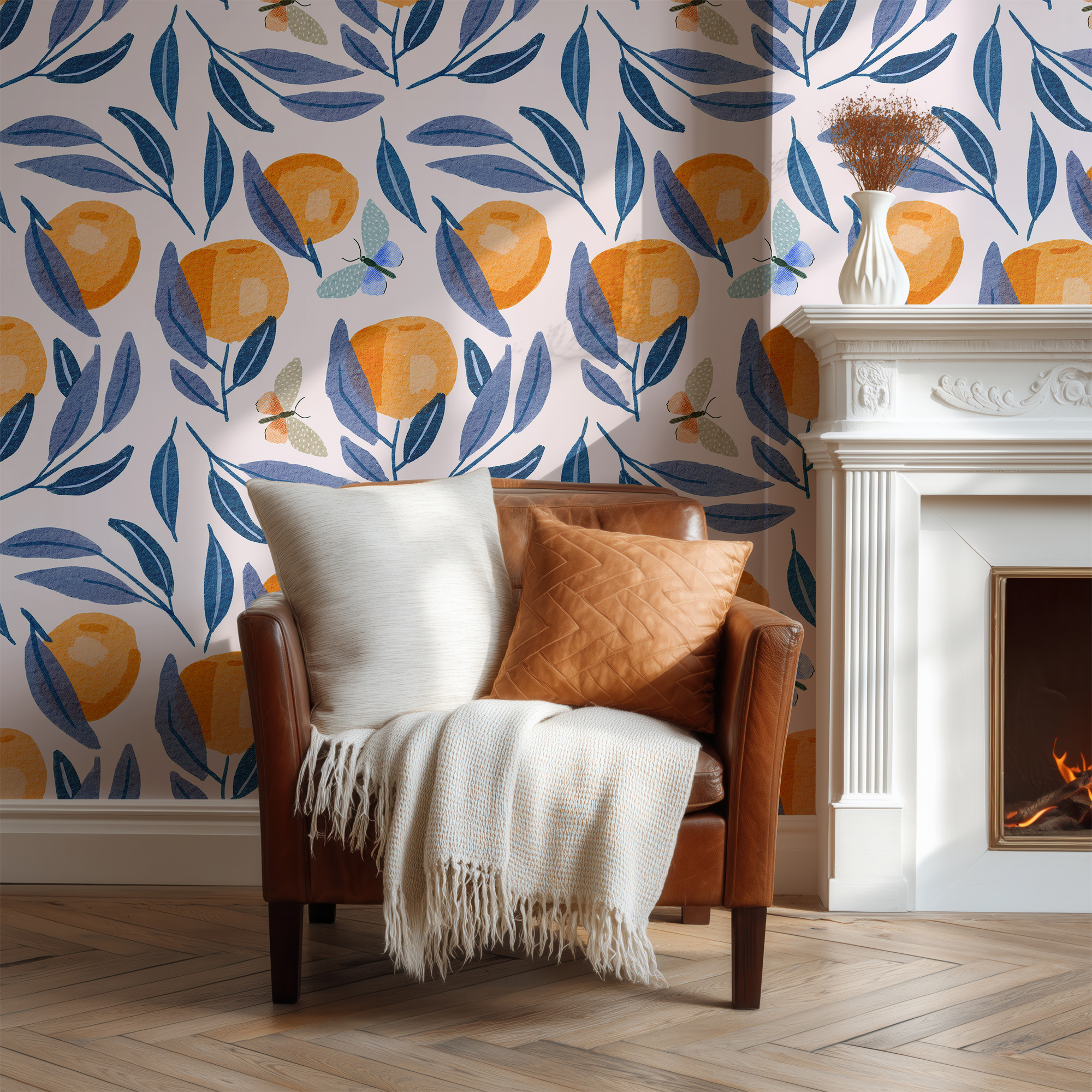 Brighten your space with our Watercolor Citrus Wallpaper, featuring vibrant oranges, playful butterflies, and bold blue leaves against a soft, airy background.