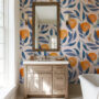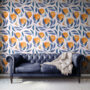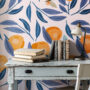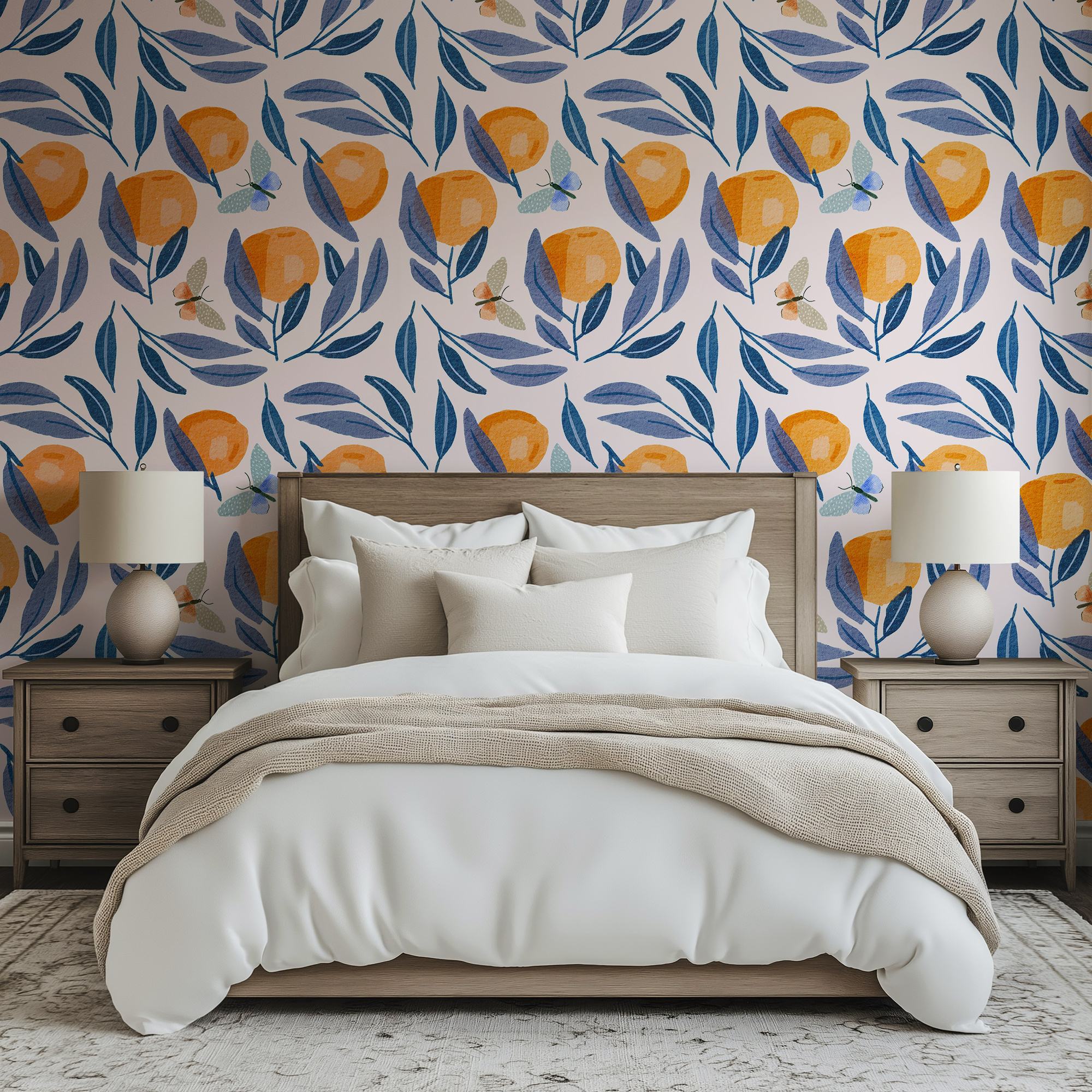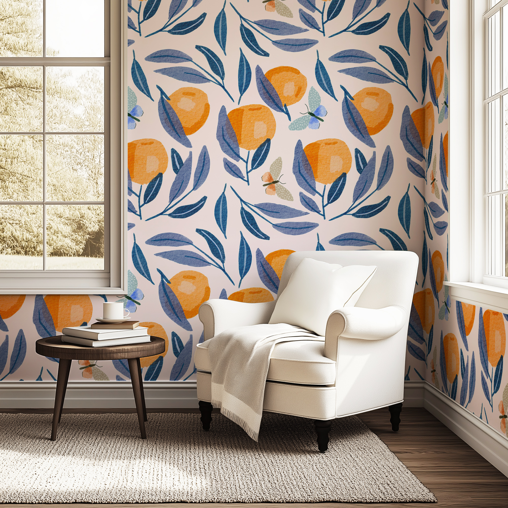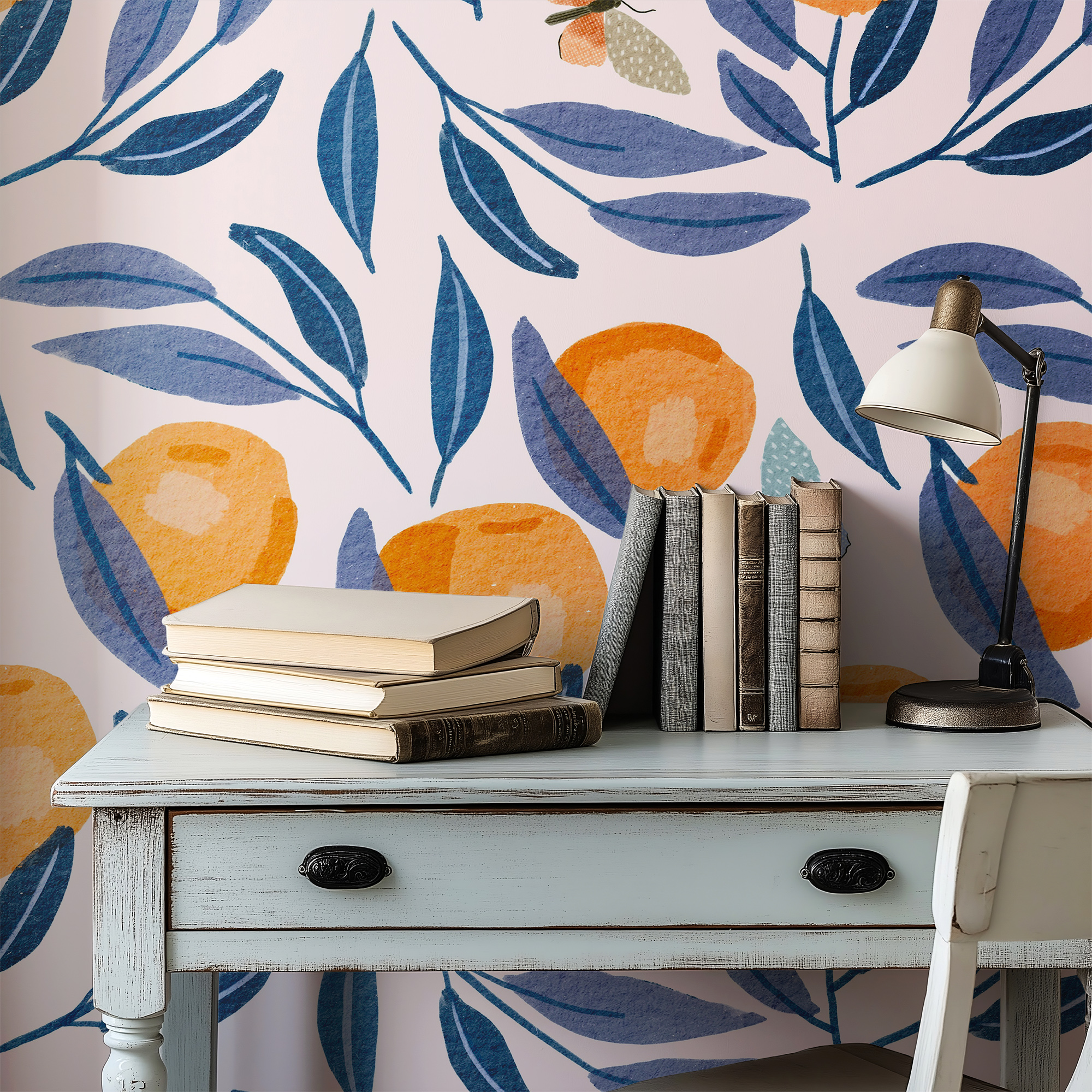 Brighten your space with our Watercolor Citrus Wallpaper, featuring vibrant oranges, playful butterflies, and bold blue leaves against a soft, airy background.